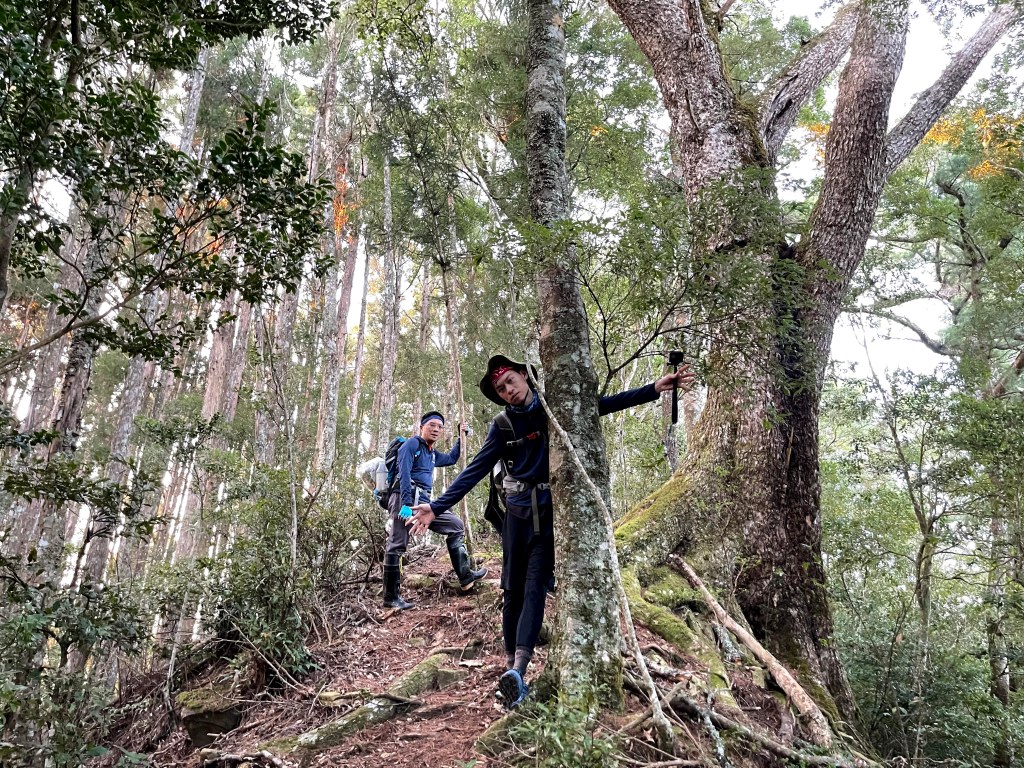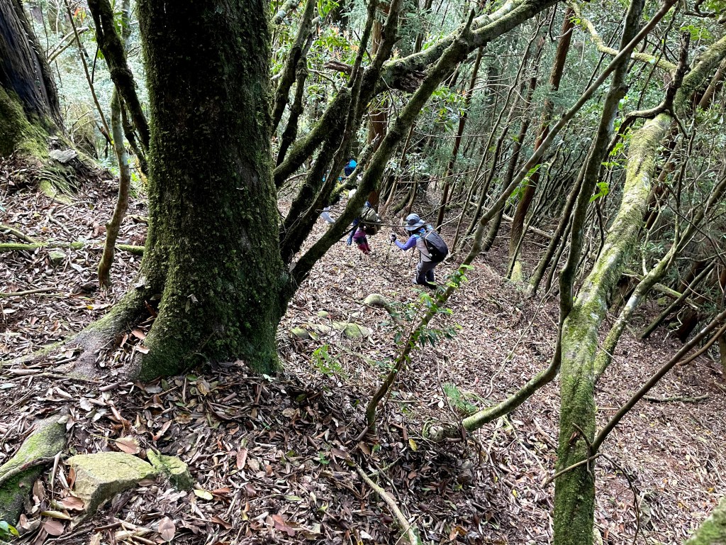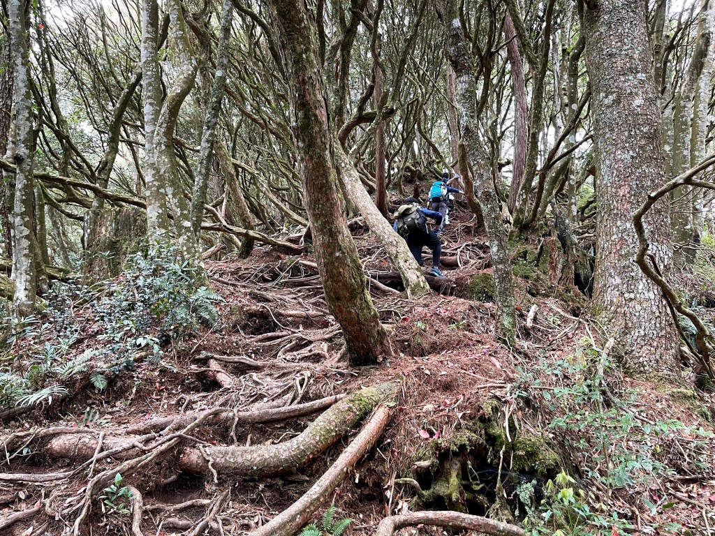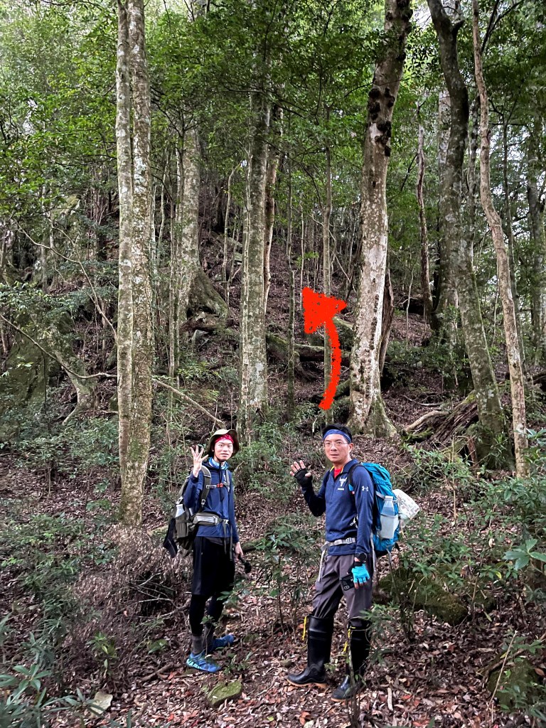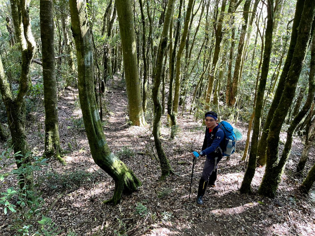 上圖:繼續前行,路徑呈現陡下。Steven與我(Gosen)站在一棵下方根部懸空的杉木邊。