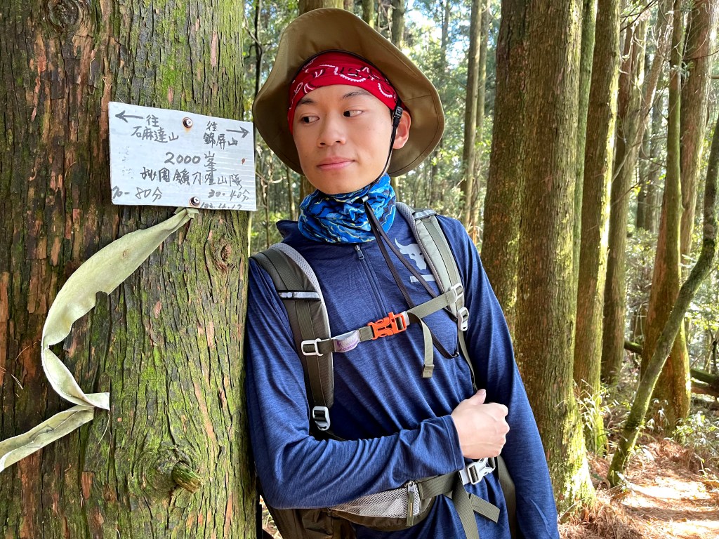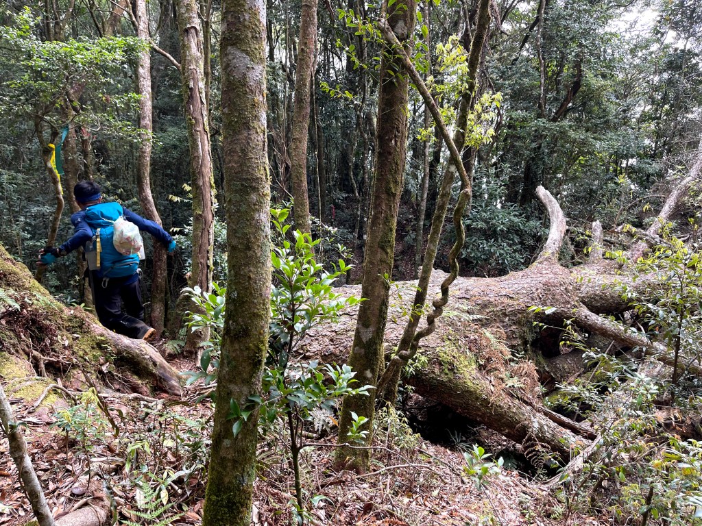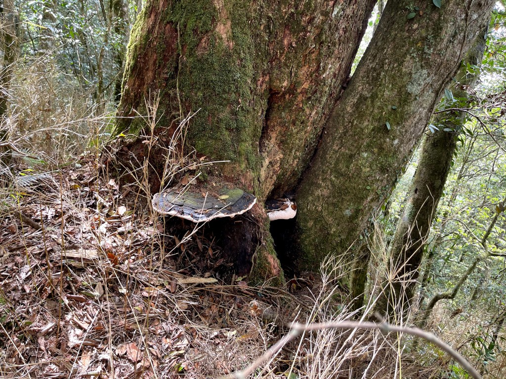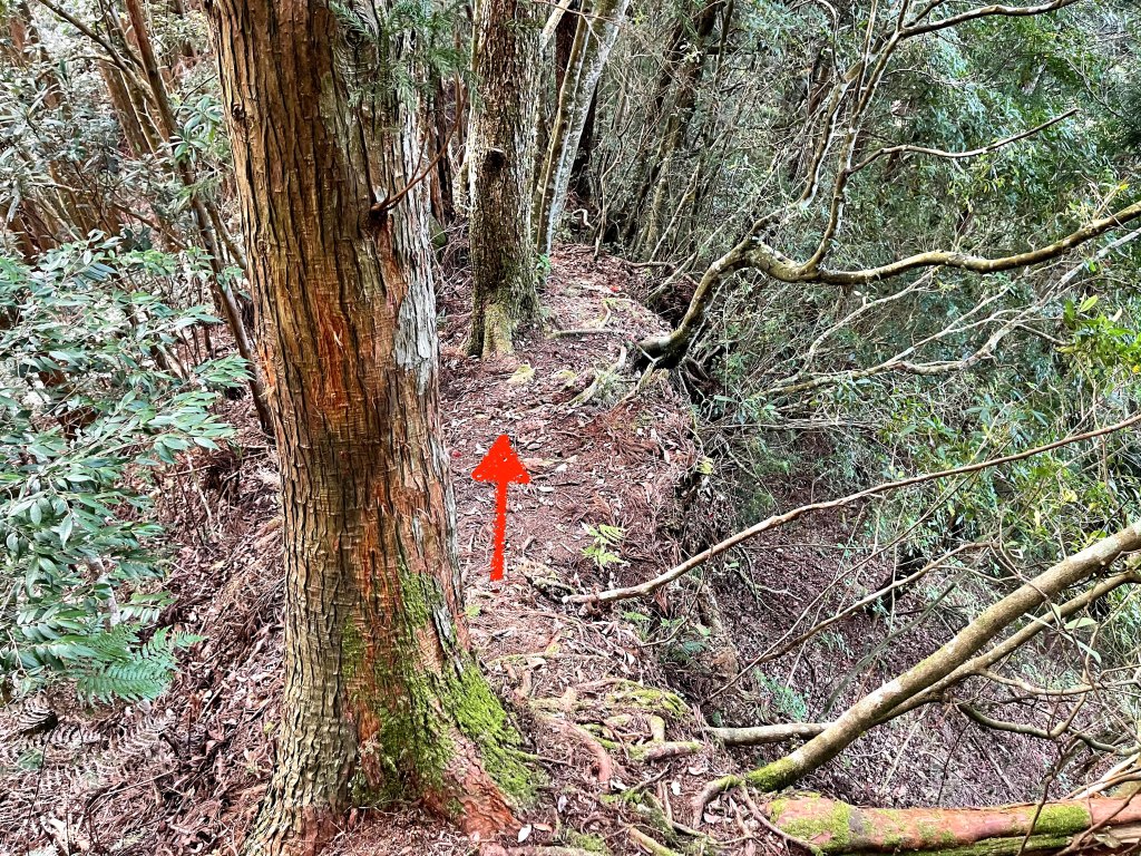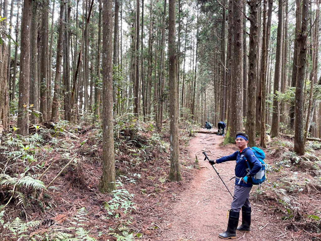 上圖:繼續前行,路徑呈現陡下。Steven與我(Gosen)站在一棵下方根部懸空的杉木邊。