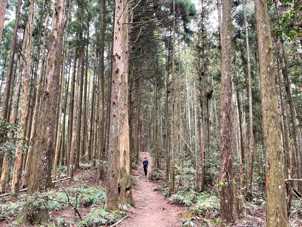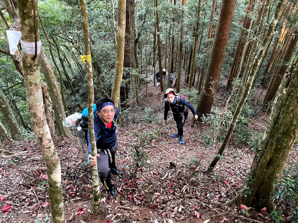 第二階段,由高台山到腰繞岔,距離為3.3K。此部份也可以分為兩個部份,前段由高台山到高島觀景台,這段的路徑仍然在延續之前的人造杉木林裡,美得難以移步,Steven頻頻採取低空的空拍,大伙也在松針落葉的路徑跑了起來!後段由高島觀景台到腰繞岔,這一段要一路陡上而到小島田山,繼續陡上可到中島田山,再陡下一段後陡上即可到上島田山,這一段路徑上的陡上大半都在瘦稜上,很多的樹根需要攀爬。過了上島田山後又轉為松針落葉路徑而到腰繞岔。