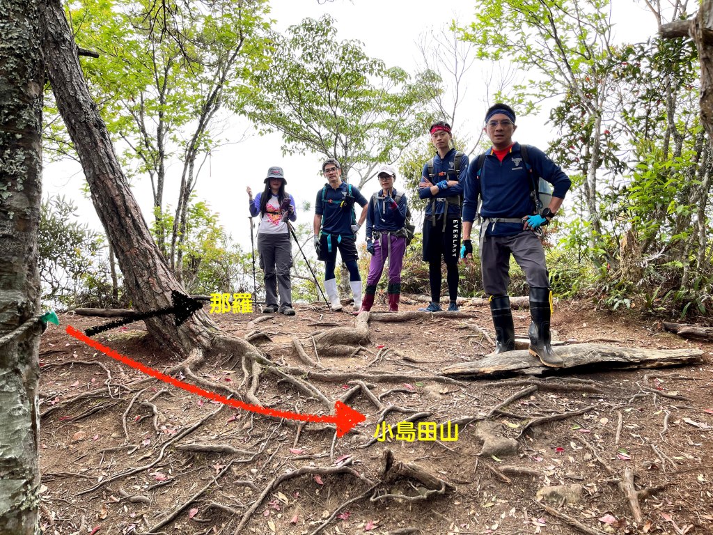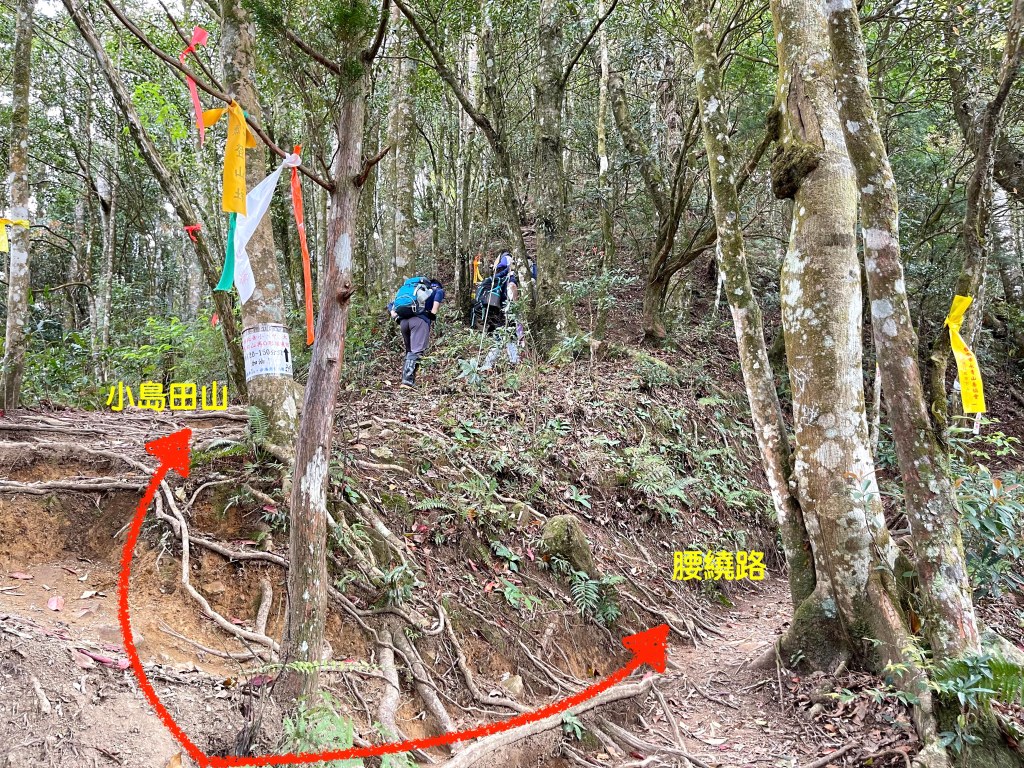 由腰繞岔,可以直接右轉沿著腰繞路繞回高島觀景台,再經由高台山回到朋友們的停車處,可能是小錦屏溫泉停車場,或者是那羅方向的傳統高台山登山口。如此的走法就是所謂的高島縱走。我們今天的行程,是要由腰繞岔繼續往石麻達山方向走。