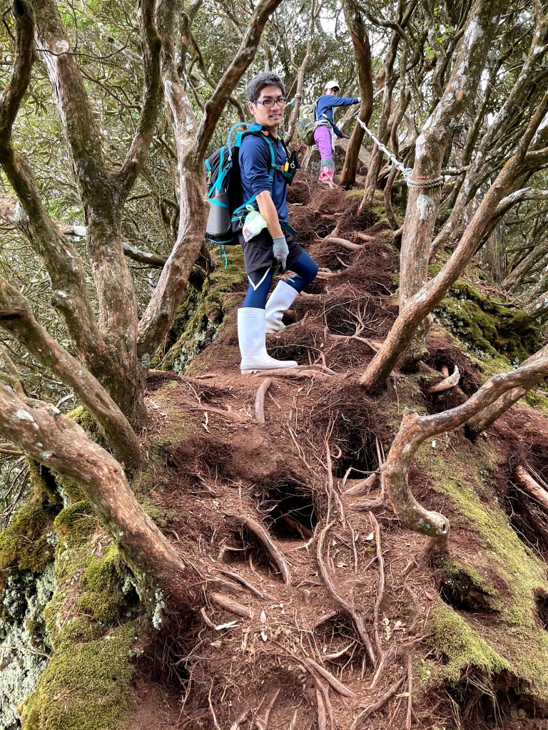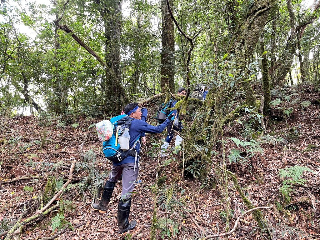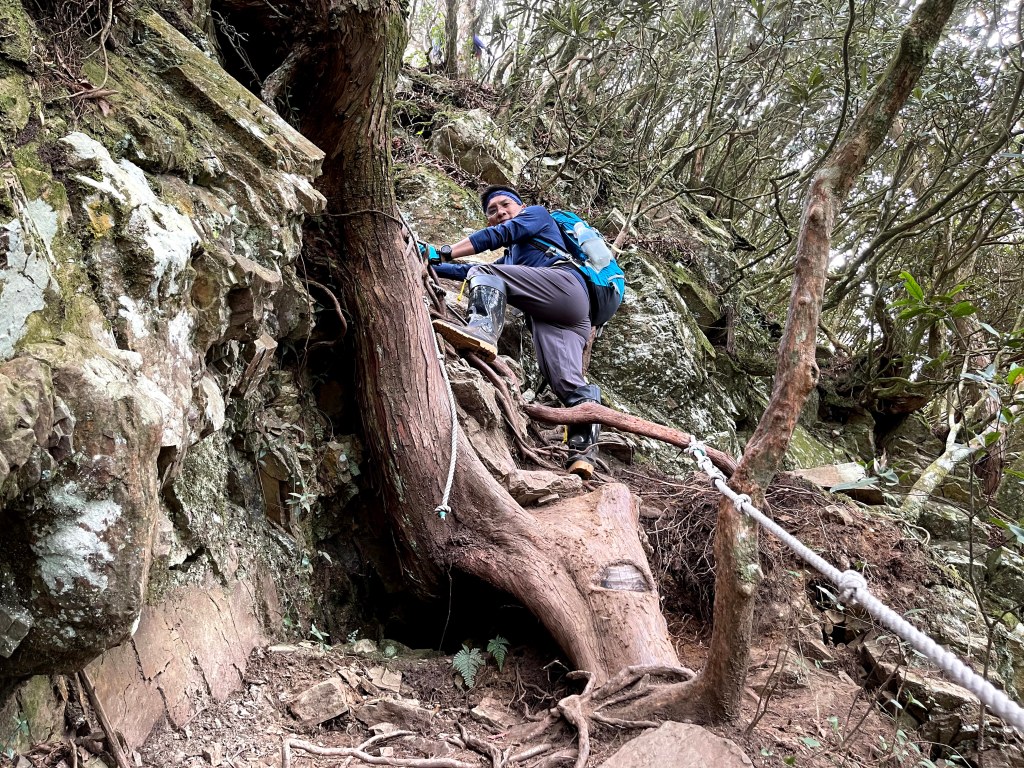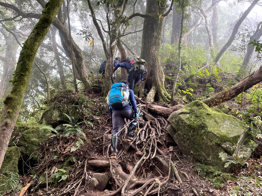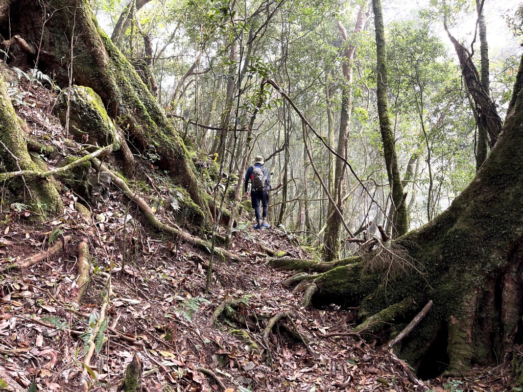 上圖:雖然路徑上沒有樹根,但是卻很難走。阿志是爬山經驗豐富的伙伴,經常一人去獨攀探險型的路線,也一直喊著要Sonia、菲菲小心翼翼的走。