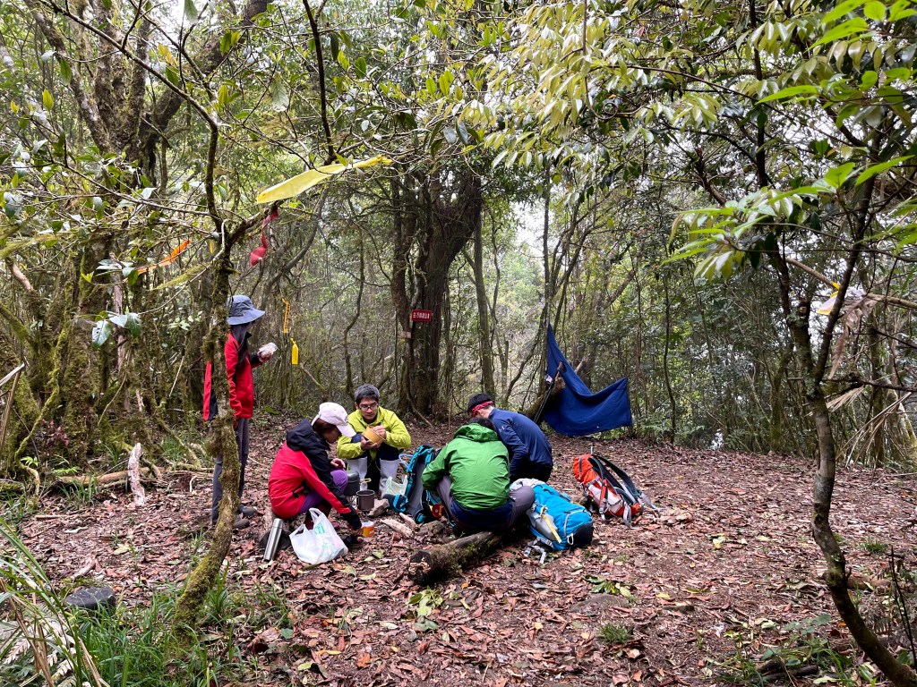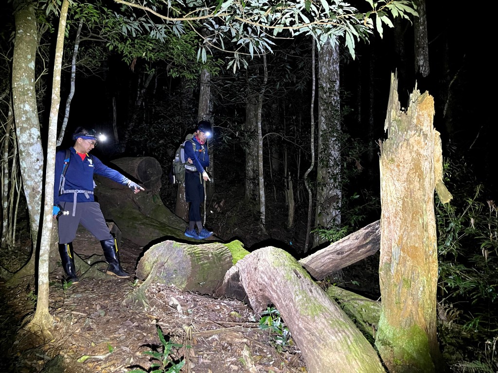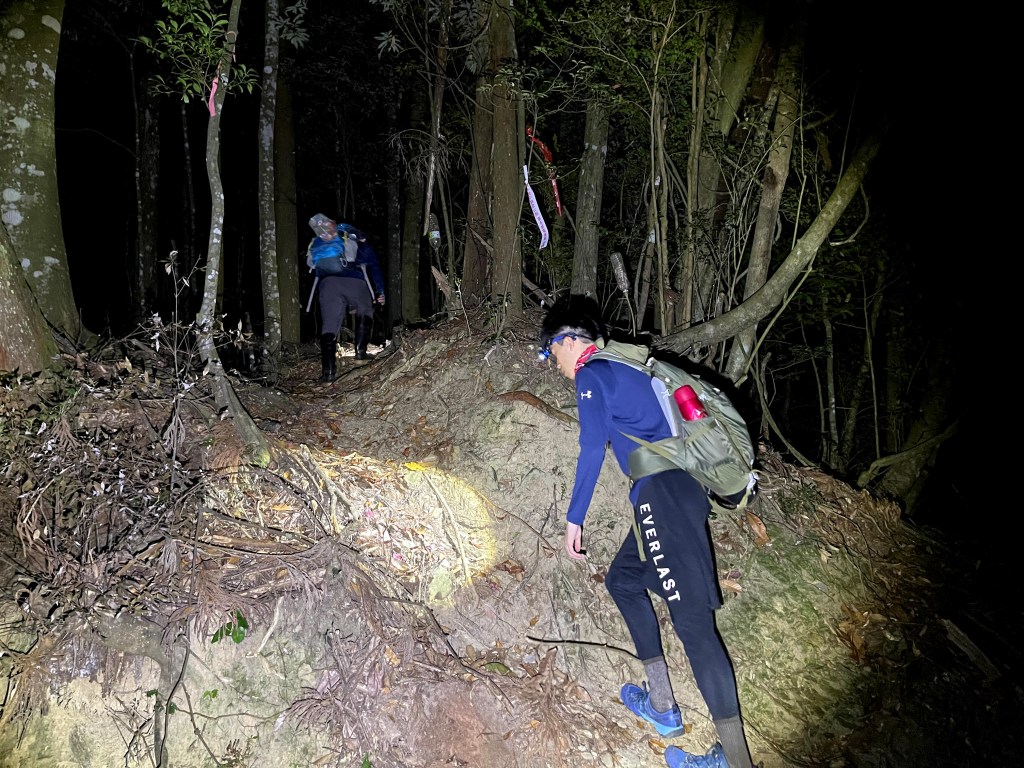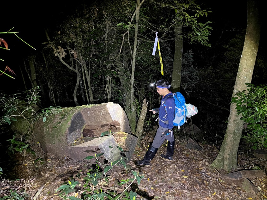 上圖:我們在第四個假山頭繼續往前30m的平台上休息,菲菲與阿志希望補充熱量,因此我們在此休息20分鐘吃點食物,順便將頭燈拿出來。