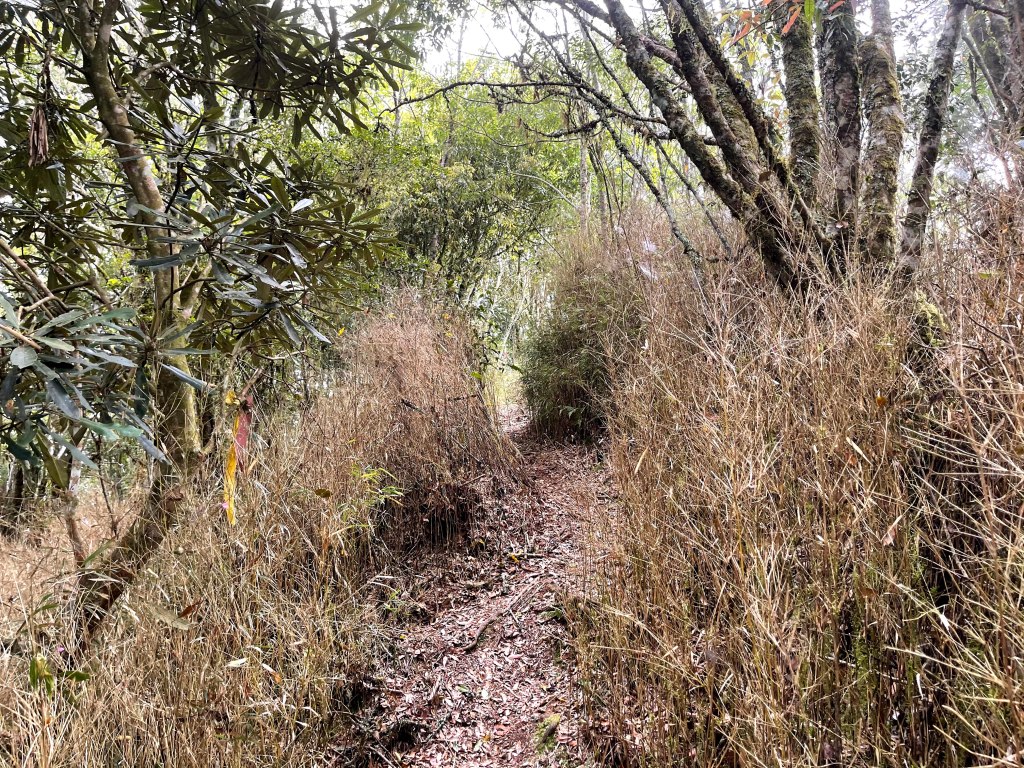 第三階段,由腰繞岔到錦屏山,距離為4.4K。在腰繞岔處我們吃午餐休息了將近40分鐘,需要走2.2K到達石麻達山,這一段路上有兩個假山頭,但基本上路徑還算好走,緩上走了1小時多可到。接下來,再由石麻達山往錦屏山走,在這段路徑上看到了令人驚艷的水晶蘭、魔芋還有山杜鵑,本來覺得平淡無奇的一段路,突然覺得處處驚奇!
