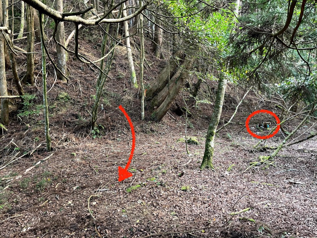 上圖:陡下到鞍部,鞍部平台上的左側有很多酒瓶。