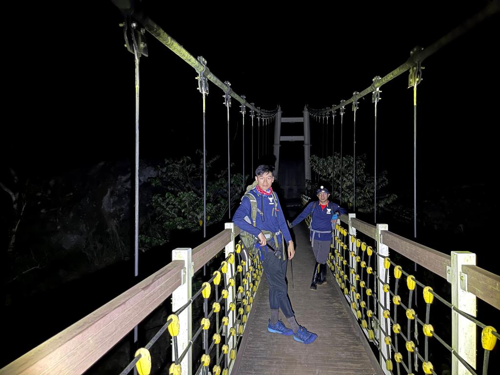 但在下山的過程中,就有體認到新伙伴菲菲可能沒有辦法像我們一樣快走,因此下山的過程就稍微慢了一些,再加上抵達1642峰時,菲菲、阿志要求吃一些食物再走,這我以前爬別的山也發生過,當血糖過低時精神會下降很快,當然此時一定要進食,因此在此休息20分鐘。經過接下來0.5K的辛苦路徑後,再走2.8K的一路陡下,過程中也偶爾會出現有路徑不清需要注意的路段,而在晚上8點半左右抵達小錦屏溫泉吊橋,完成了今天的行程。