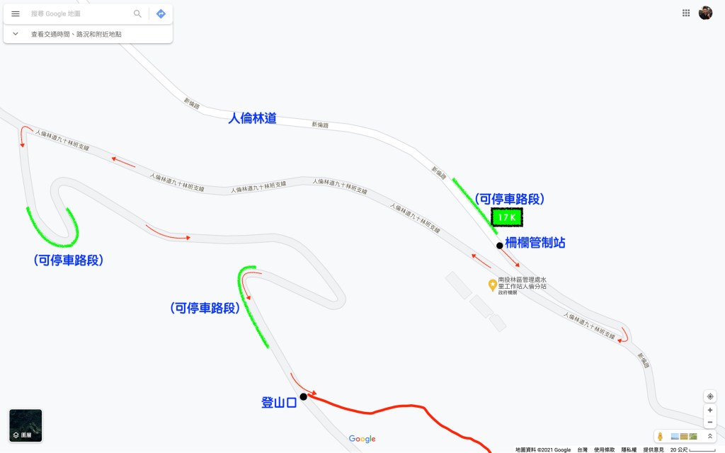 起登當天的清晨3點,我們就由「歌珊地牧羊人之家」民宿開車,全老闆建議我們由人和村的捷徑接上人倫林道,就是下圖中紅色的路徑,這條路雖然短,但是走過後的感覺,這是一條給小貨車或是摩托車走的路,因為有些部份的寬度很窄,Peter與我的休旅車都會一路的被兩邊的樹枝給打到,在這段紅色的產業道路上開得慢,其實時間上沒有省多少。還是建議循著正常路徑,由台21線轉進新倫路,也就是人倫林道,開17K(Google導航地圖上顯示只有16.1K)抵達柵欄管制站。