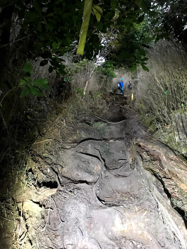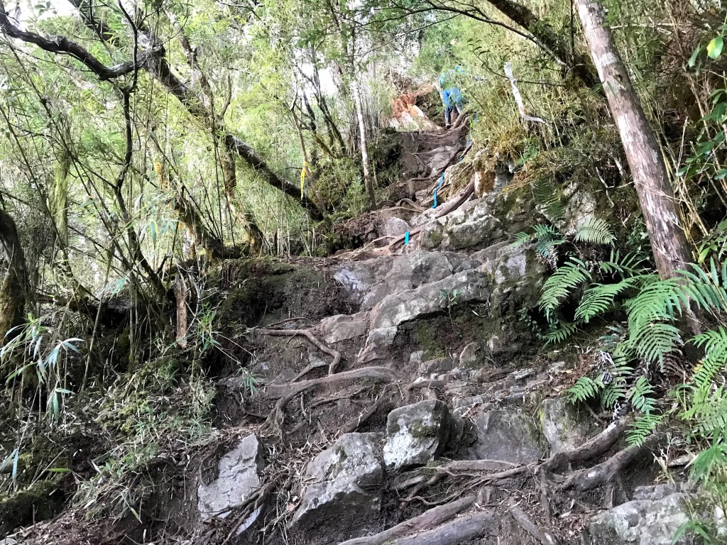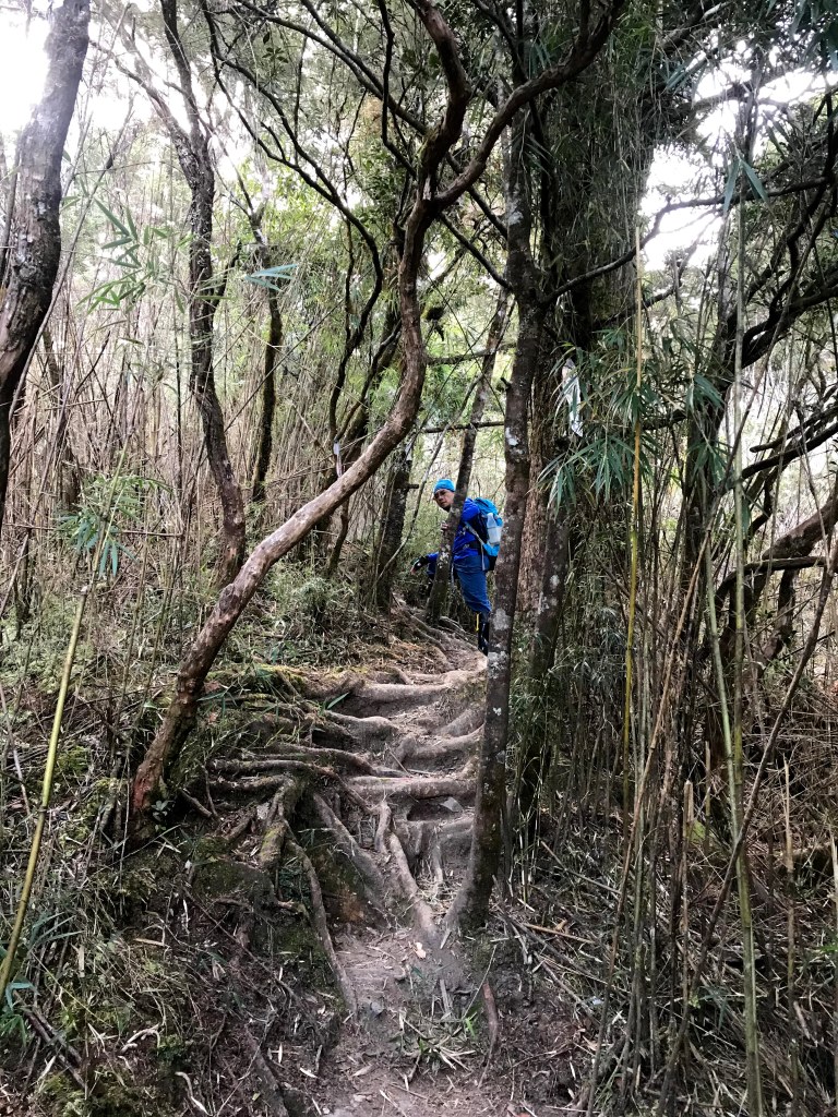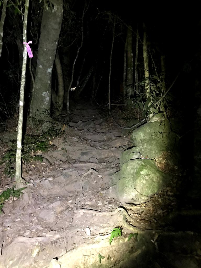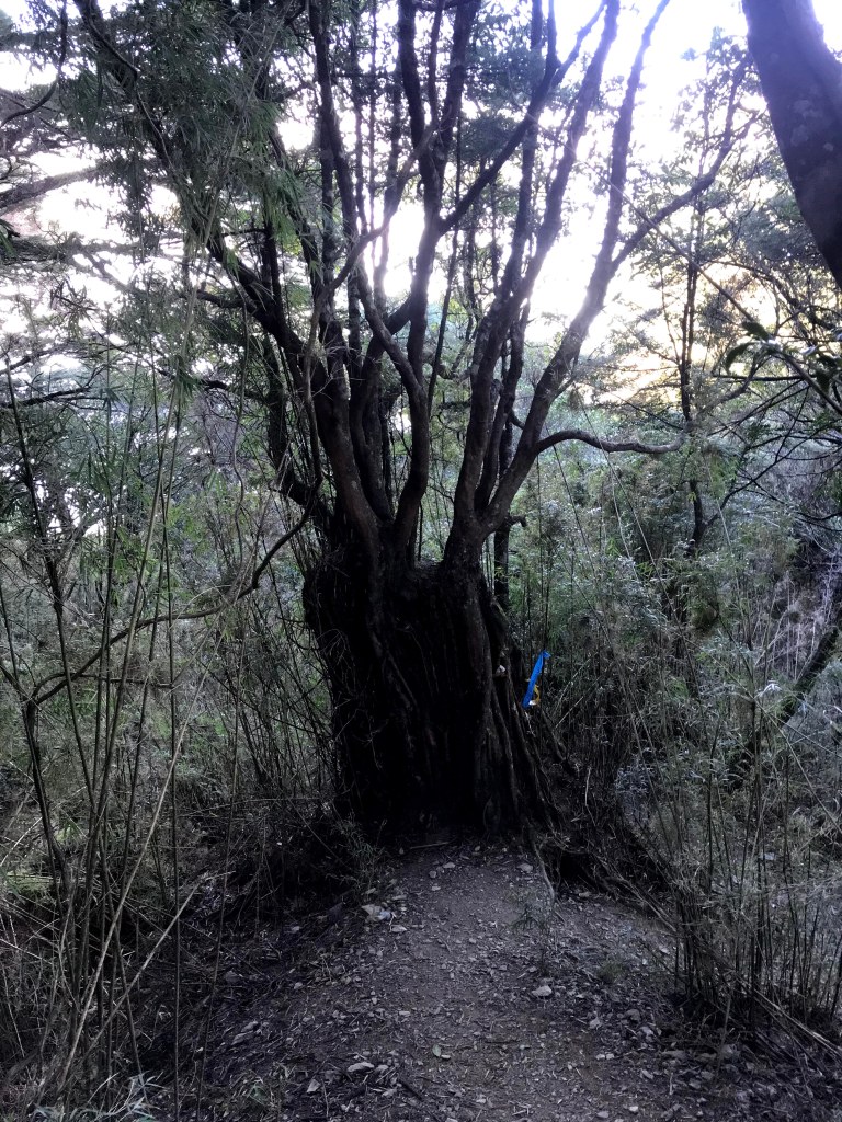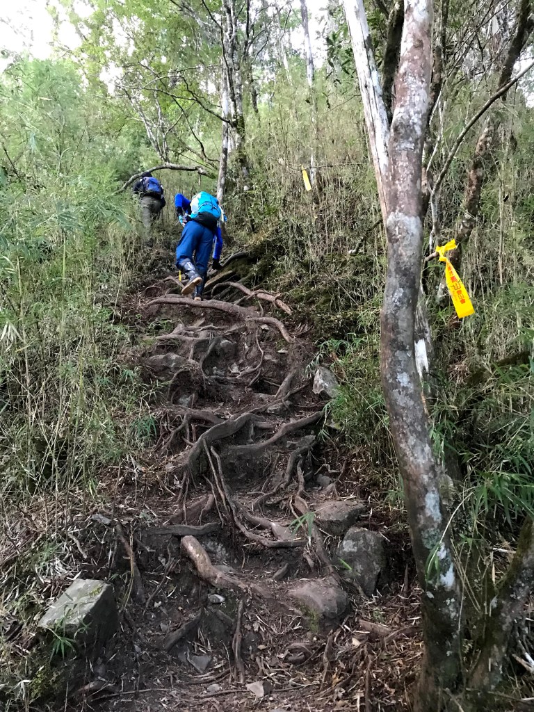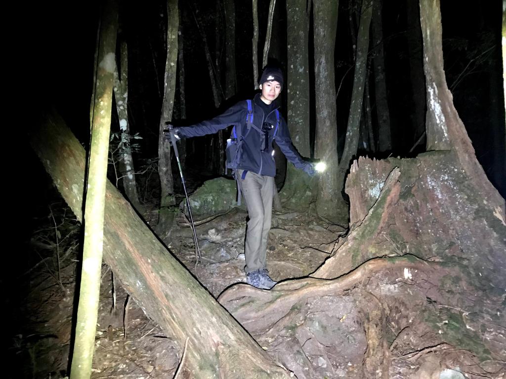 今天的路線,因為是在清晨4點多起登,因此在柵欄管制站前停好車,接著就要進入人倫工作站走1.2K的路徑到登山口。由登山口走2.6K且緩上路徑可到森林營地,繼續緩上再走1.3K可到瞭望台,接著要走1.2K的樹根路且夾雜岩壁的陡上路徑而到2830峰,在此有展望可以看到右側阿里山稜線的大塔山還有鹿屈山等。再接著,走1.2K的攀爬岩壁樹根路,還有穿越不算短的箭竹林,陡上到出了森林後就會看到水泥建築的工作站及兩層樓高的瞭望台,也就是西巒大山到了。