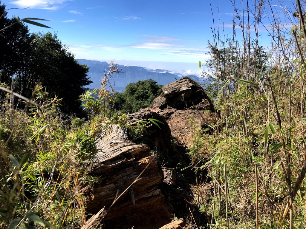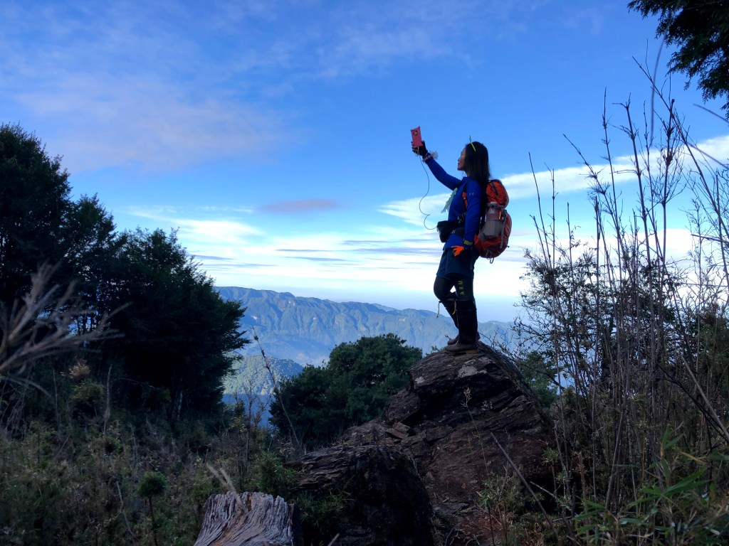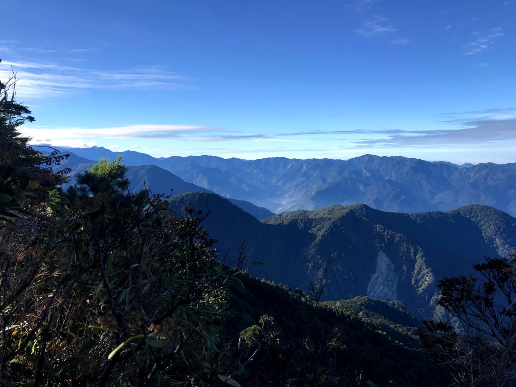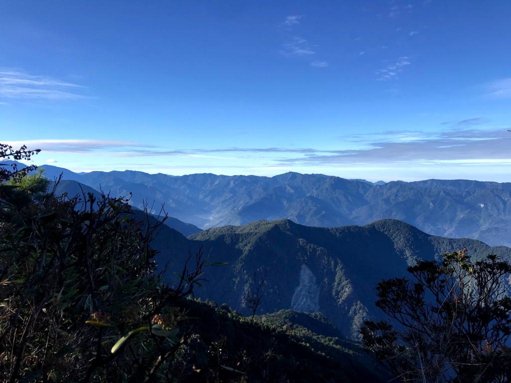 由於登頂時出大景,可以看到南邊的玉山群峰、秀姑巒山、馬博拉斯山,近一點的郡大山等,這就是爬百岳的最大回饋!此時山頂上人聲鼎沸,有眾多山友在此一起休息共享美景,我們也在此進行空拍、進食、攝影、休息了1.5小時。