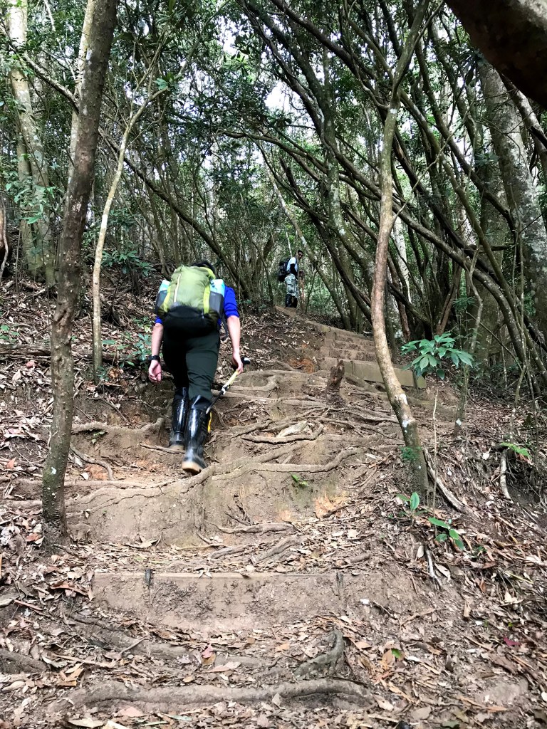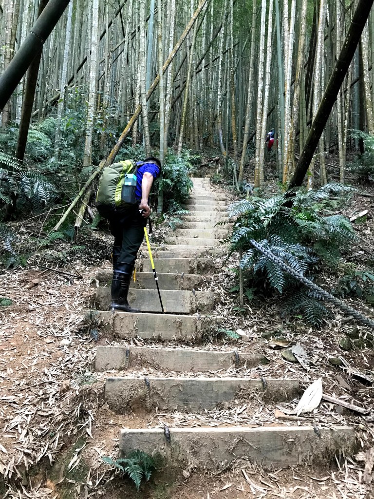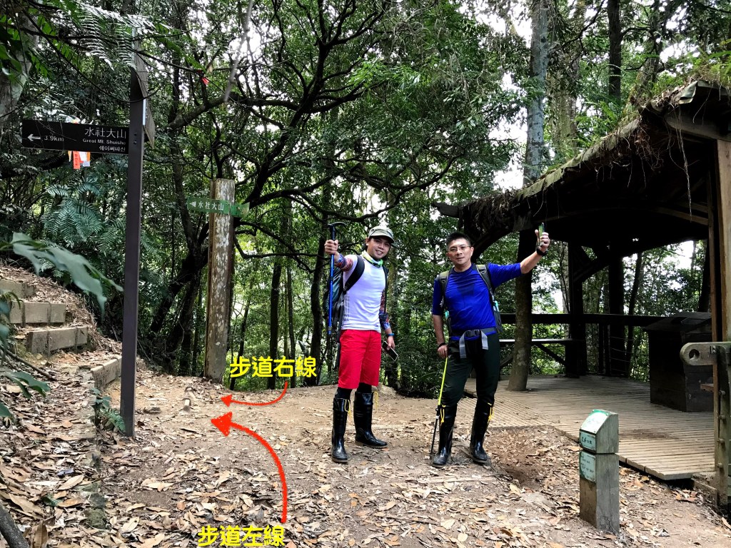 沿著1853階的石階步道逐漸緩上,走上400m後會到達岔路口,左右兩條路線都可走到步道1.6K里程碑的涼亭,我們選擇左線,左線這條中間會與日月潭救國團青年活動中心而來的路徑連結。從步道1.6K里程碑走到步道2K里程碑,就會到達卜吉山,但是我們找不到三角點,因此就直接離開繼續前進。接下來就會經過2.75K觀景台、4.2K避雨亭、4.7K觀景台、5K觀景台,一路陡上而在接近中午抵達水社大山。在這過程中跑出來兩條狗一路跟著我們走,一條小黑、一條小黃,其中小黑跟了一半就不見了,而小黃則一路跟著我們一直回到停車場前才突然發現牠不告而別了。