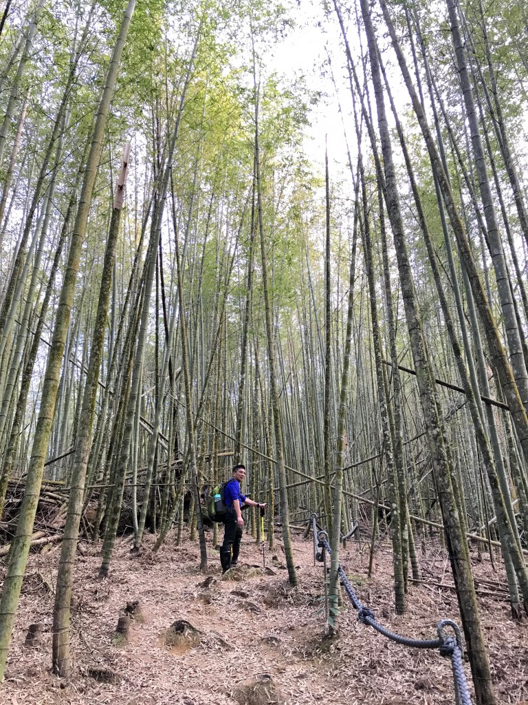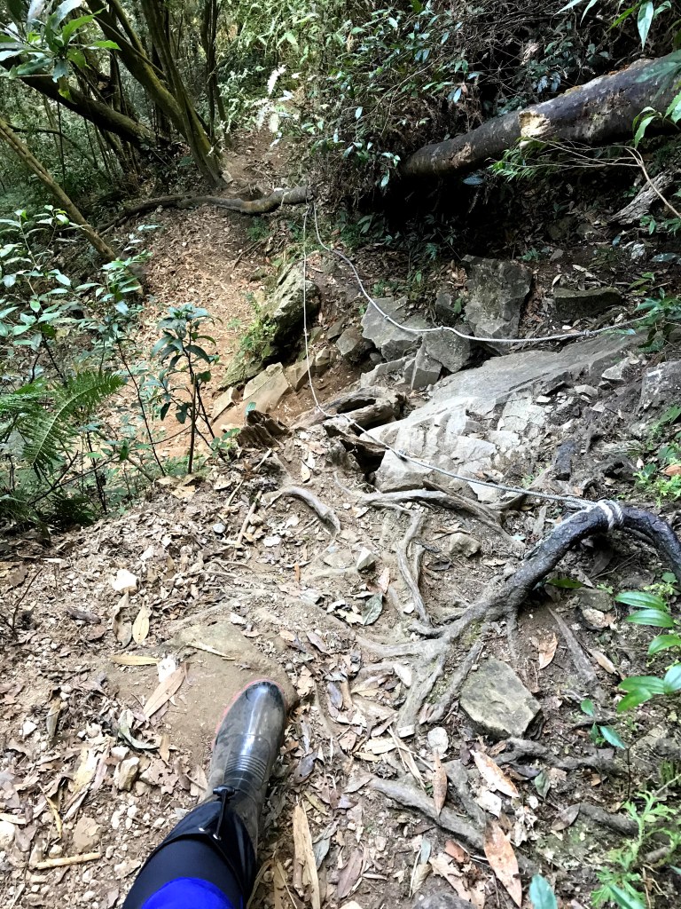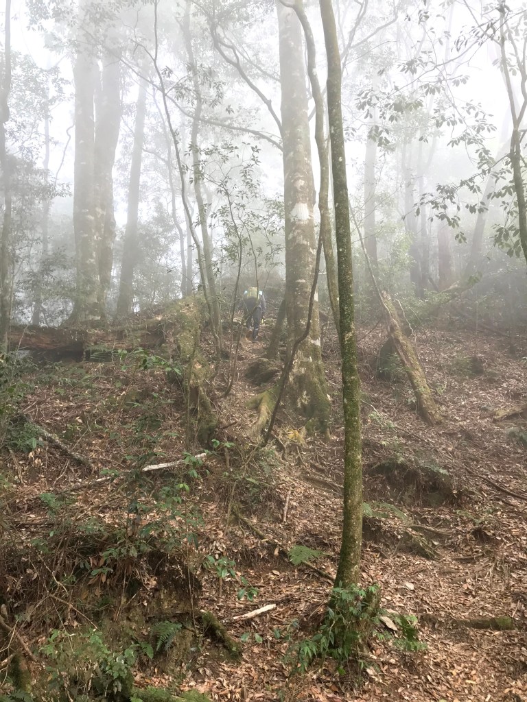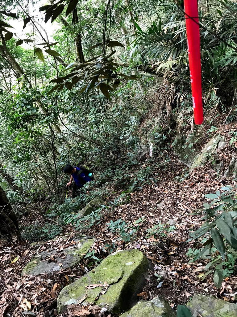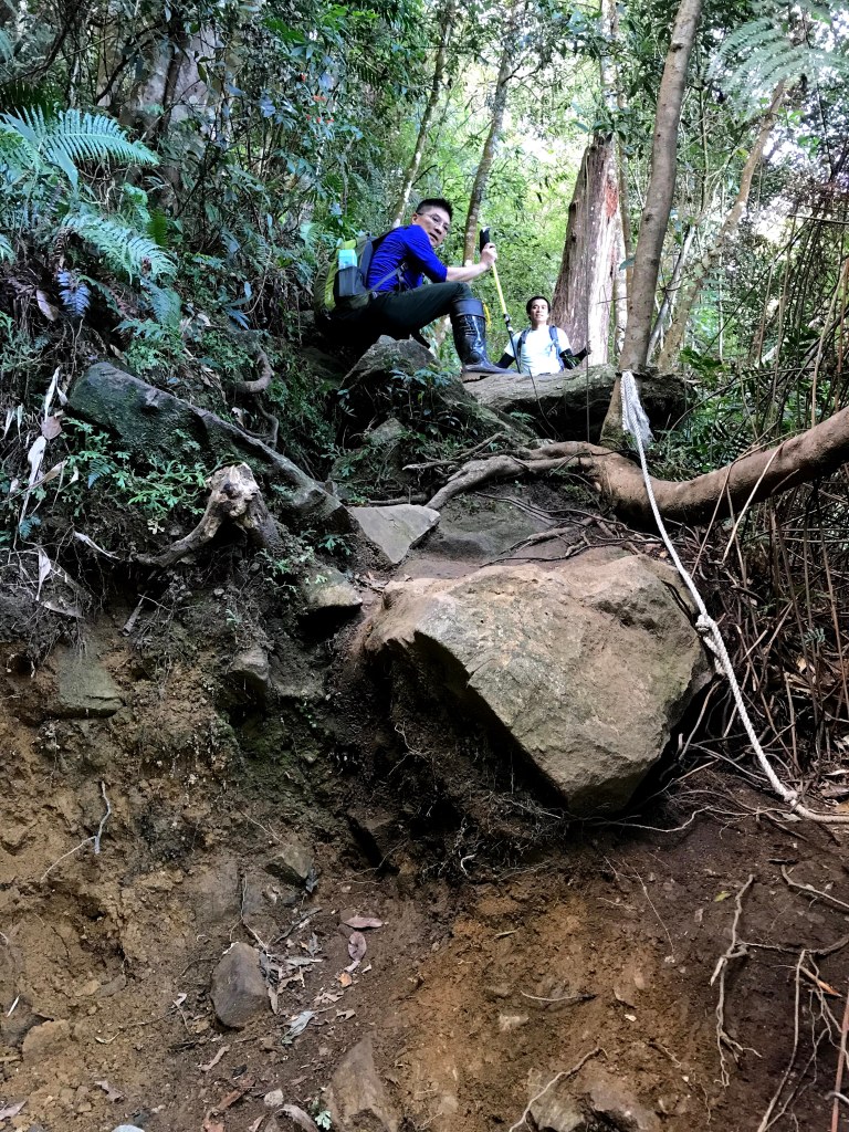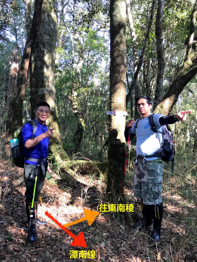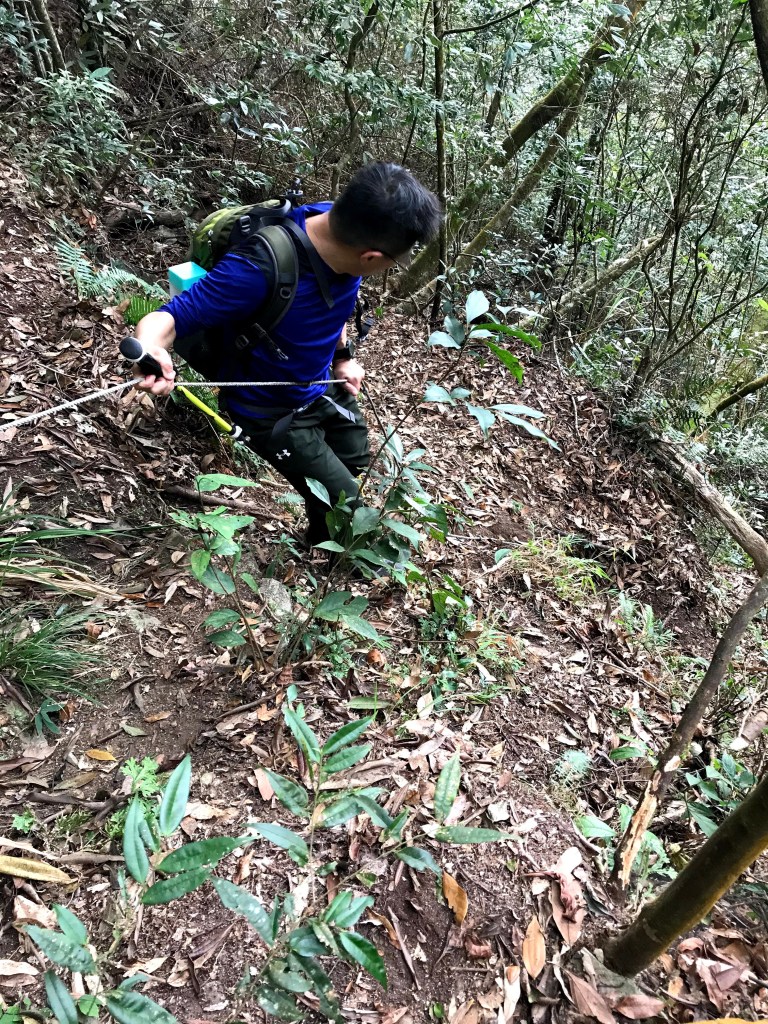 整個路線難易程度給中高,是因為過了2046峰之後,一直到潭南登山口,這一段路中有一段約300m的過程,要一路延著陡坡之字形陡下,兩旁樹木都腐朽到不太能支撐,且路線崎嶇落葉很多土質鬆軟,一路都在滑行中,要注意別滑落到邊坡,也還要注意兩旁像玫瑰的莖刺勾人。這300m有難度,也看得出潭南段很少山友走,因為布條都已經呈現脆化或斷裂現象。