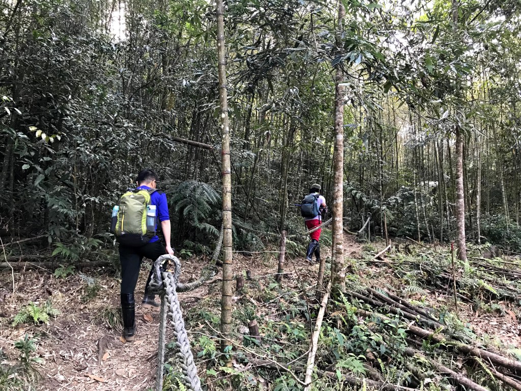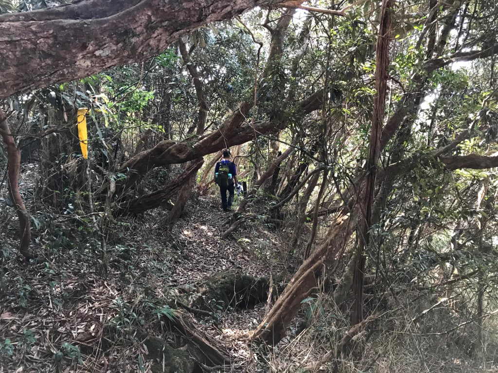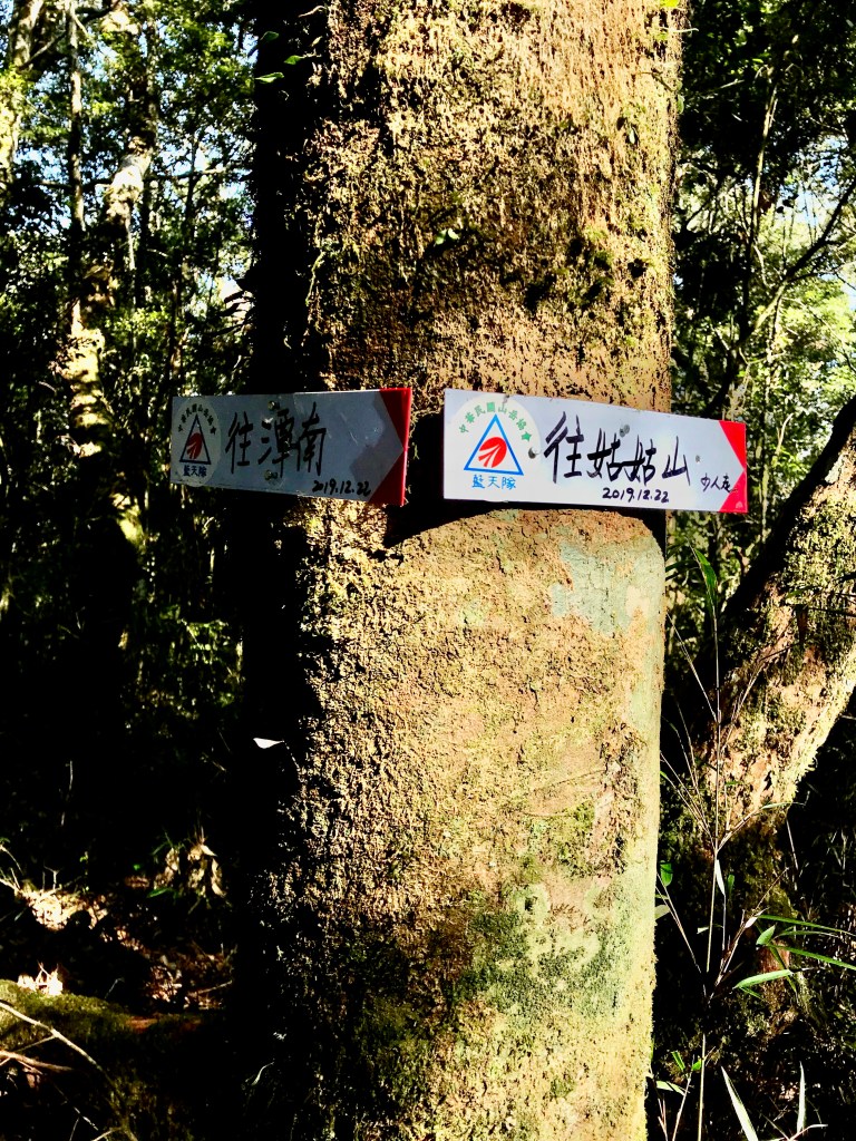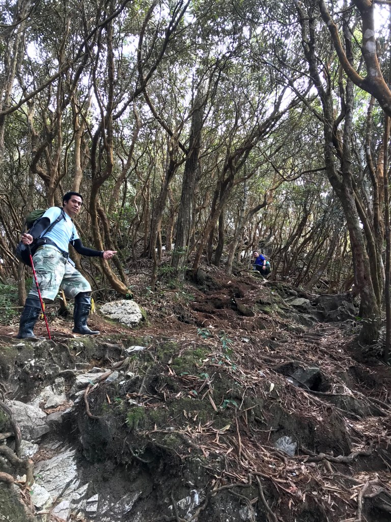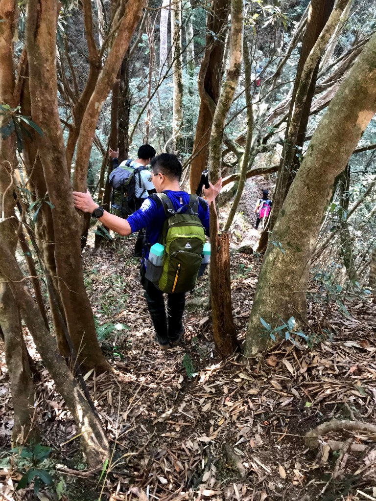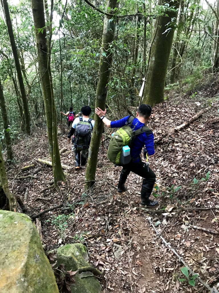 整個路線難易程度給中高,是因為過了2046峰之後,一直到潭南登山口,這一段路中有一段約300m的過程,要一路延著陡坡之字形陡下,兩旁樹木都腐朽到不太能支撐,且路線崎嶇落葉很多土質鬆軟,一路都在滑行中,要注意別滑落到邊坡,也還要注意兩旁像玫瑰的莖刺勾人。這300m有難度,也看得出潭南段很少山友走,因為布條都已經呈現脆化或斷裂現象。