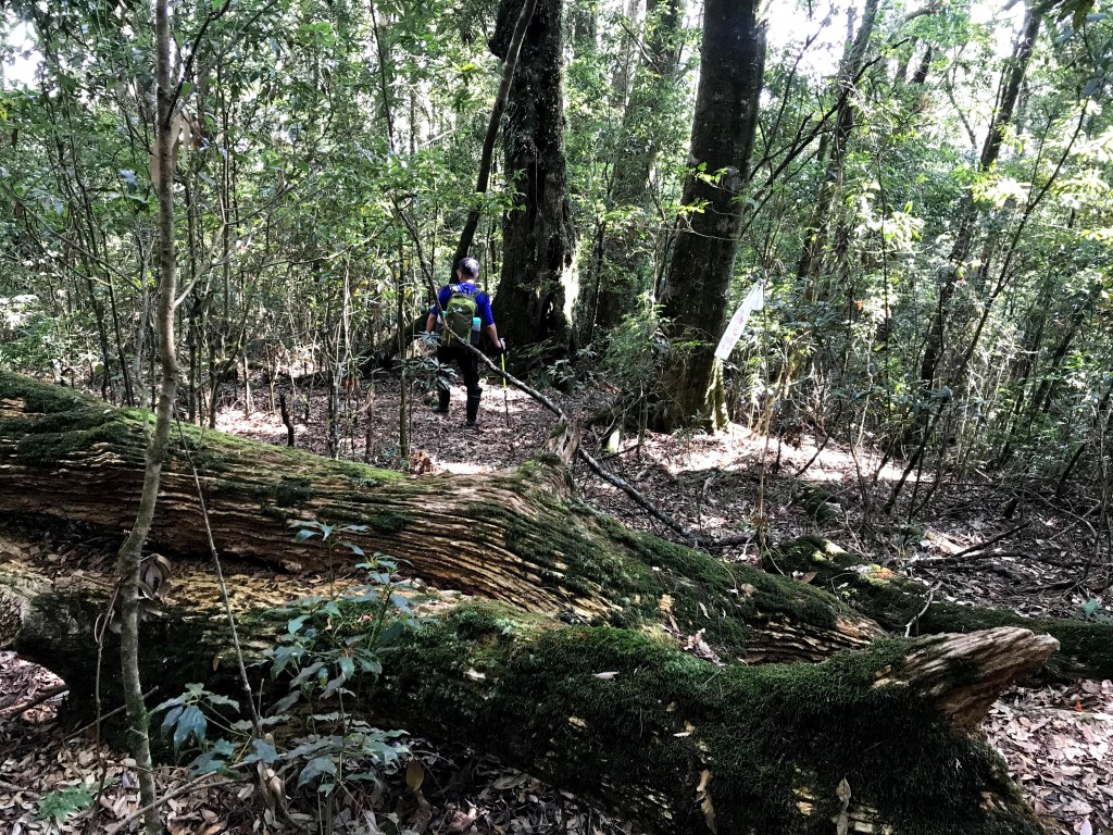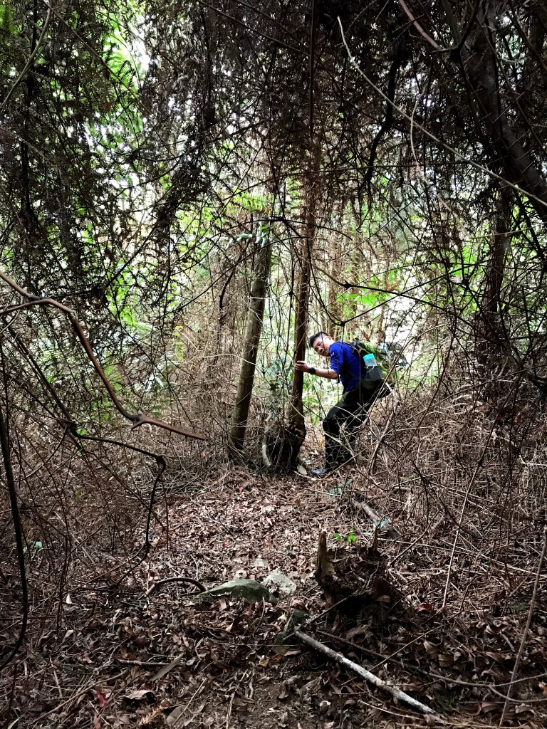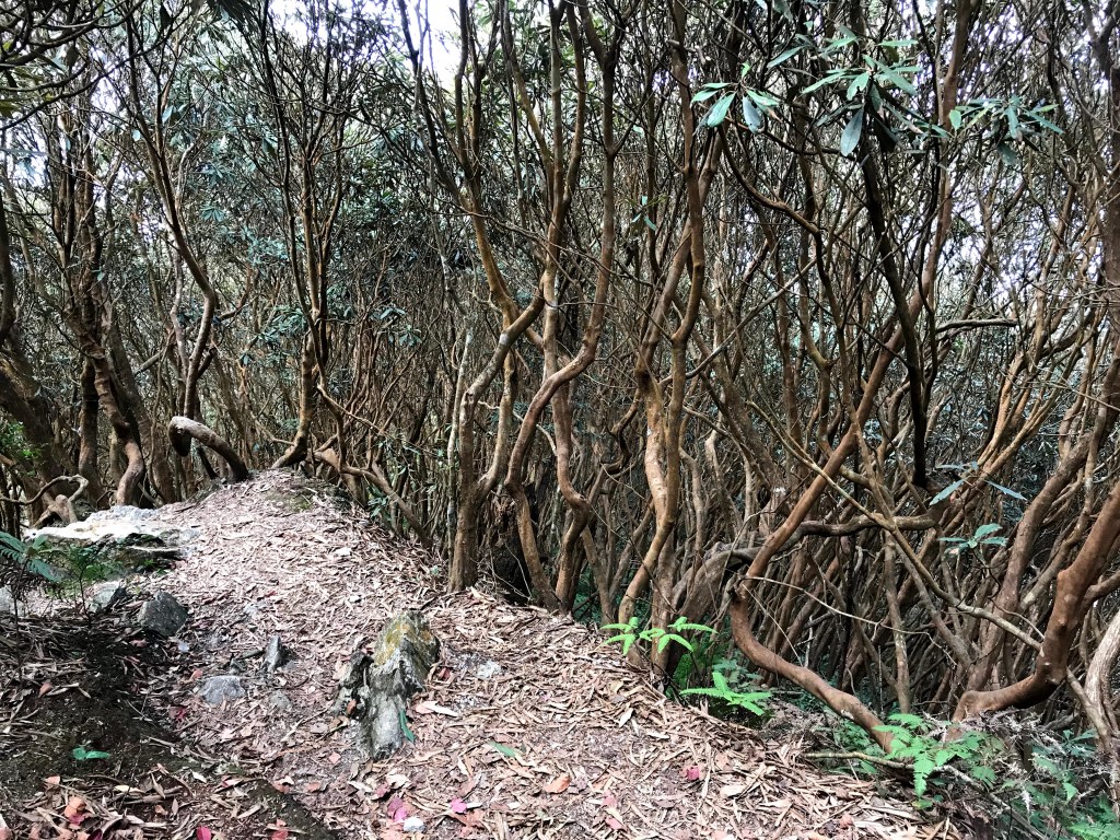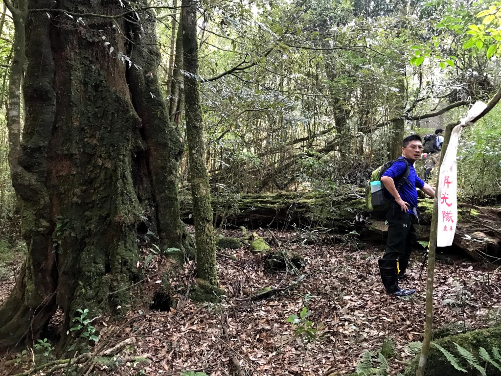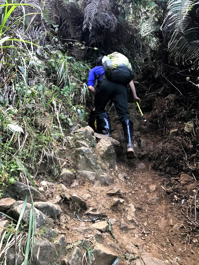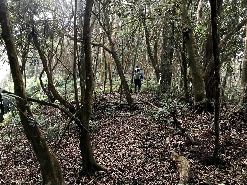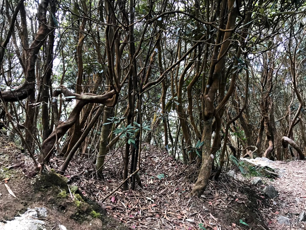 整個路線難易程度給中高,是因為過了2046峰之後,一直到潭南登山口,這一段路中有一段約300m的過程,要一路延著陡坡之字形陡下,兩旁樹木都腐朽到不太能支撐,且路線崎嶇落葉很多土質鬆軟,一路都在滑行中,要注意別滑落到邊坡,也還要注意兩旁像玫瑰的莖刺勾人。這300m有難度,也看得出潭南段很少山友走,因為布條都已經呈現脆化或斷裂現象。