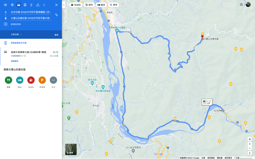 由於沙橫白縱走的起登點是在大雪山吊橋,也就是下圖中的大雪山生態社區,其位在大雪山林道15K處,而終點在台8線的白冷冰棒,因此需要接駁。我們請了一位住在東勢的計程車幫我們接駁,在早上6點半時於大甲溪台電發電廠停車場停好車後,隨即坐上接駁車開約一小時車車程抵達大雪山吊橋。