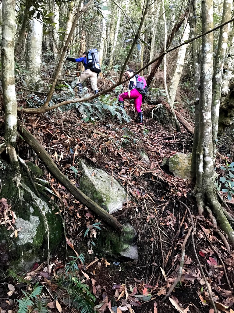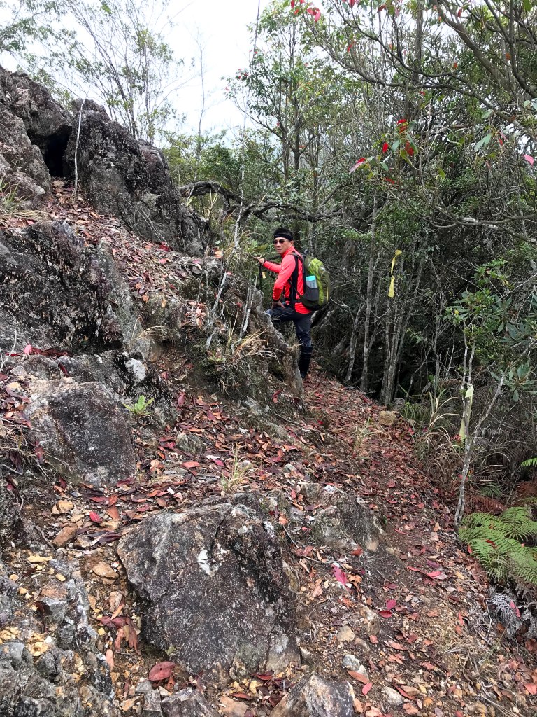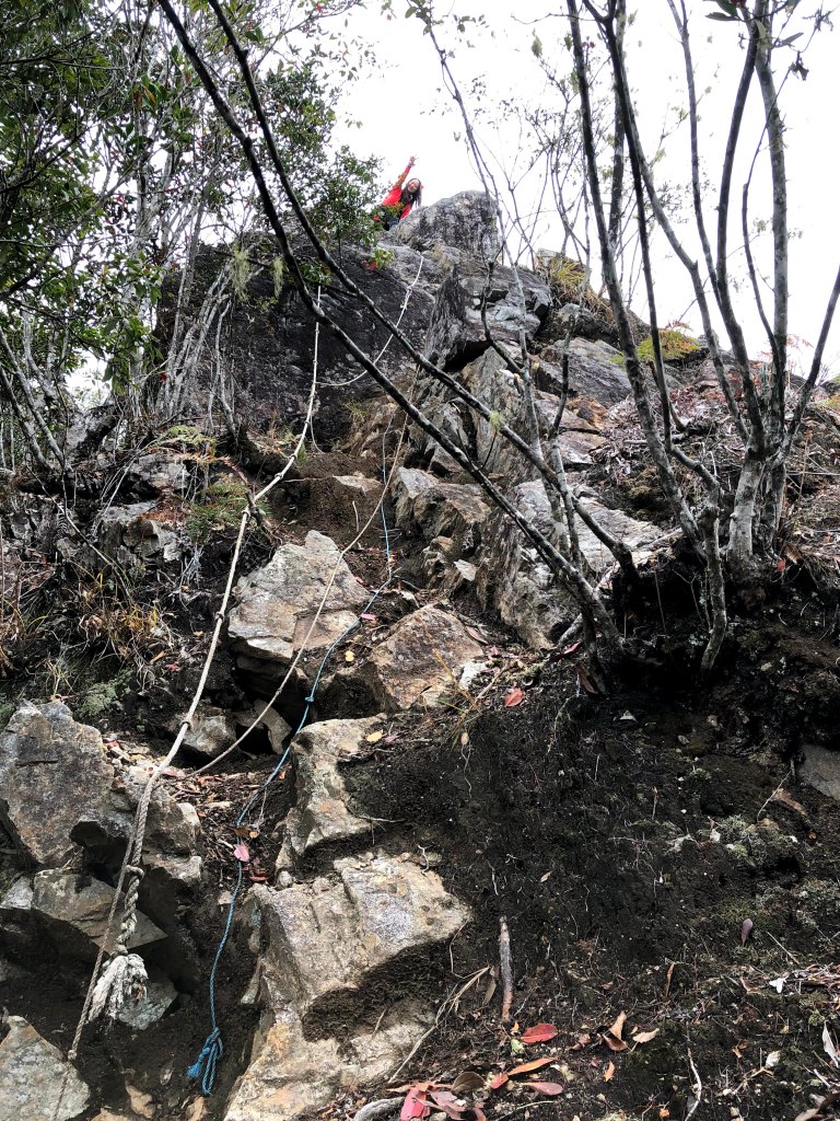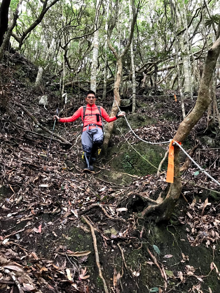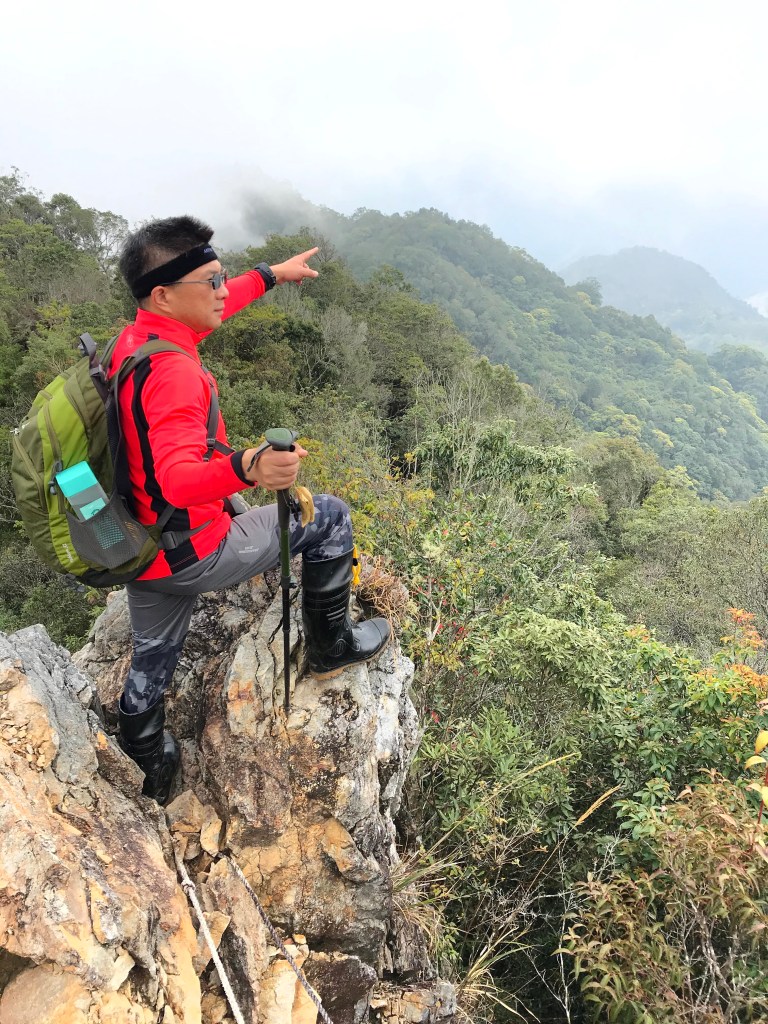 聊天太久了,繼續上路,往回走100m回到三岔路口,此時不再右轉到沙蓮山,而是直(左)走,逐漸陡下,經過一段為岩石路段,再續行,會有多段有繩索輔助的下坡,還會遇到假山頭,必須爬高再下坡。再來,就會到達斷崖處(H1650m),由於此處視野頗佳,且又具有拍照的吸引力,我們四人,就在此花了些時間拍照攝影。接著,下斷崖,接著一小段的瘦稜,小心通過即可!通過之後,就是一路逐漸緩下而到達雙大水桶處(H1360m)。只要過了雙大水桶,接下來的路就是寬大平坦的康莊大道,接著到達白冷岔(H1294m),向左進入,約走500m後即到達白冷山(H1330m)。