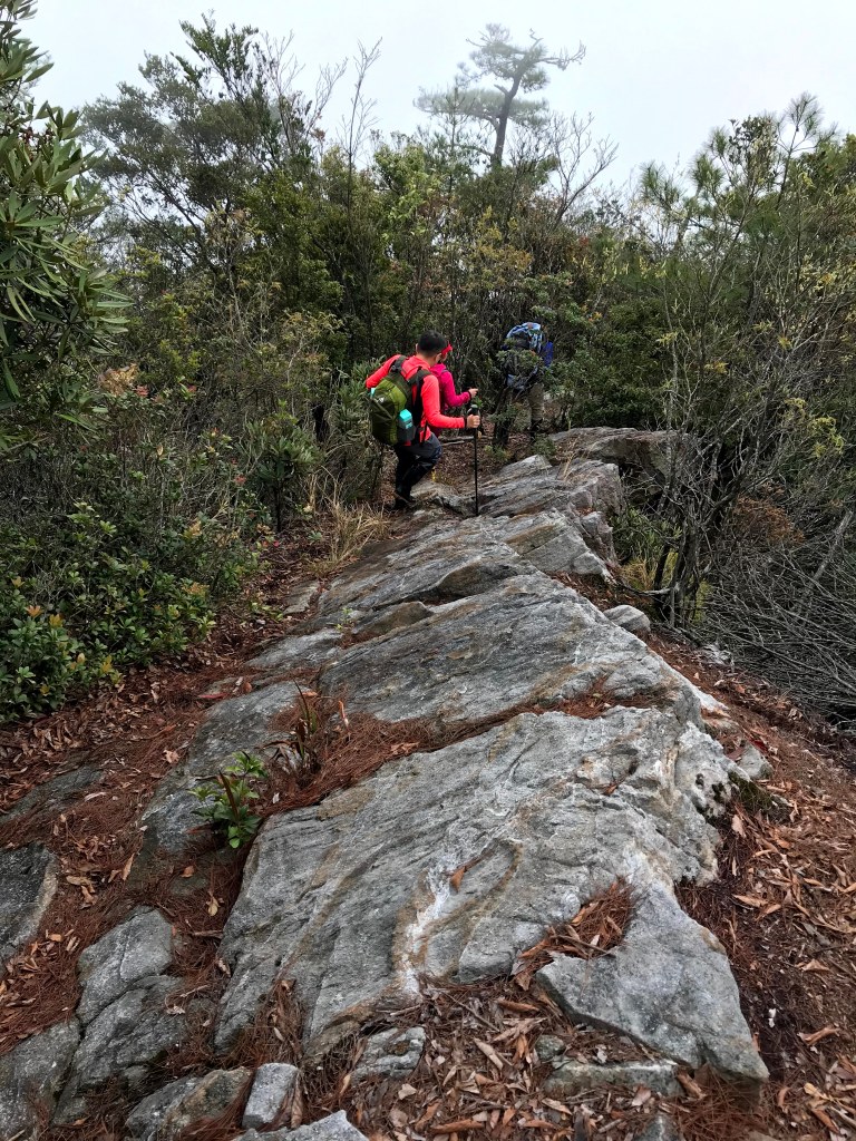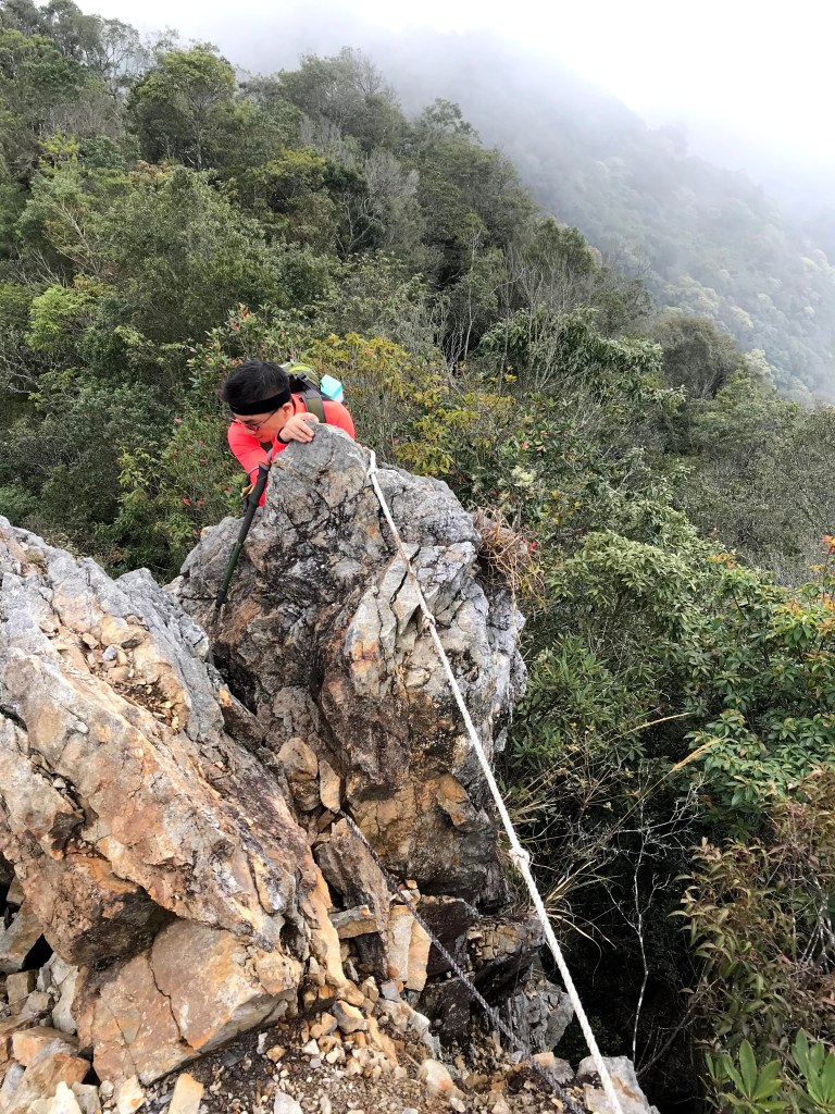 今天的三座山,如果由大雪山林道,過了橫嶺山隧道後的27.5K起登到橫嶺山,或過橫嶺山+沙蓮山來回,或者由白冷起登到白冷山來回,難易程度都是比較簡單的路線。但若是要沙蓮山+橫嶺山+白冷山縱走,那難度就會比較高,再加上路程需要16km,在橫嶺山往白冷山的路程中間還會遇到一斷崖,必須垂直下攀約需10m,之後再接上一段的險瘦稜,因此,難度給中。