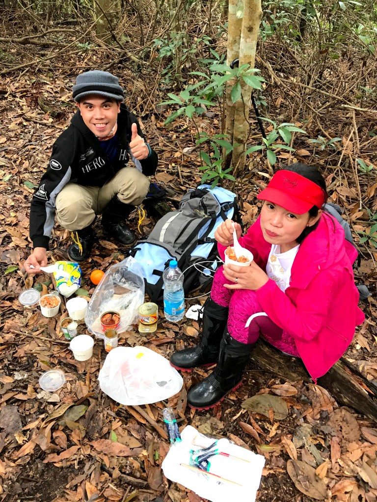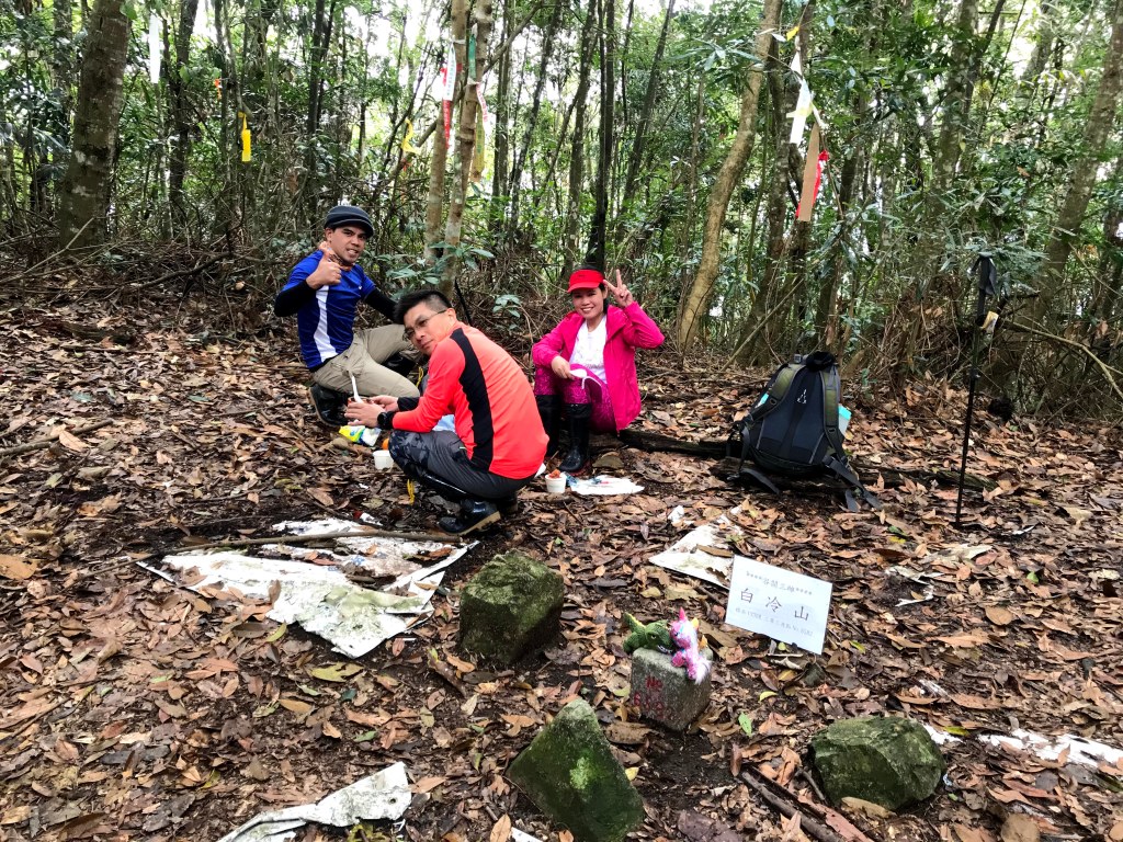 我們在白冷山進行大休,吃中餐,因為Kim跟Mario如果沒有吃到白飯會no power,在此休息了52分鐘一直到14:34才準備離開。白冷山是谷關三雌之一。谷關三雌,是指馬來山(海拔1,519公尺)、佳保台山(海拔1,406公尺)與白冷山(海拔1,330公尺),其中馬來山在921大地震後因中橫公路封閉處於未開放的區域,而佳保台山只要由八仙山森林遊樂區爬八仙山就可順撿。