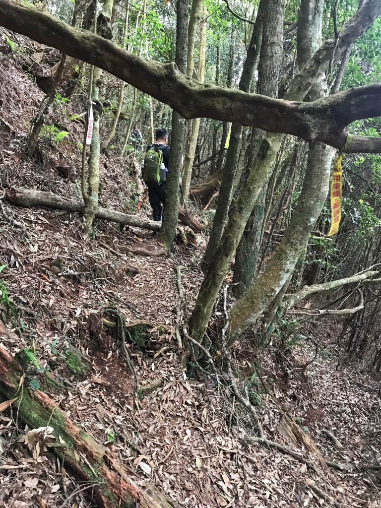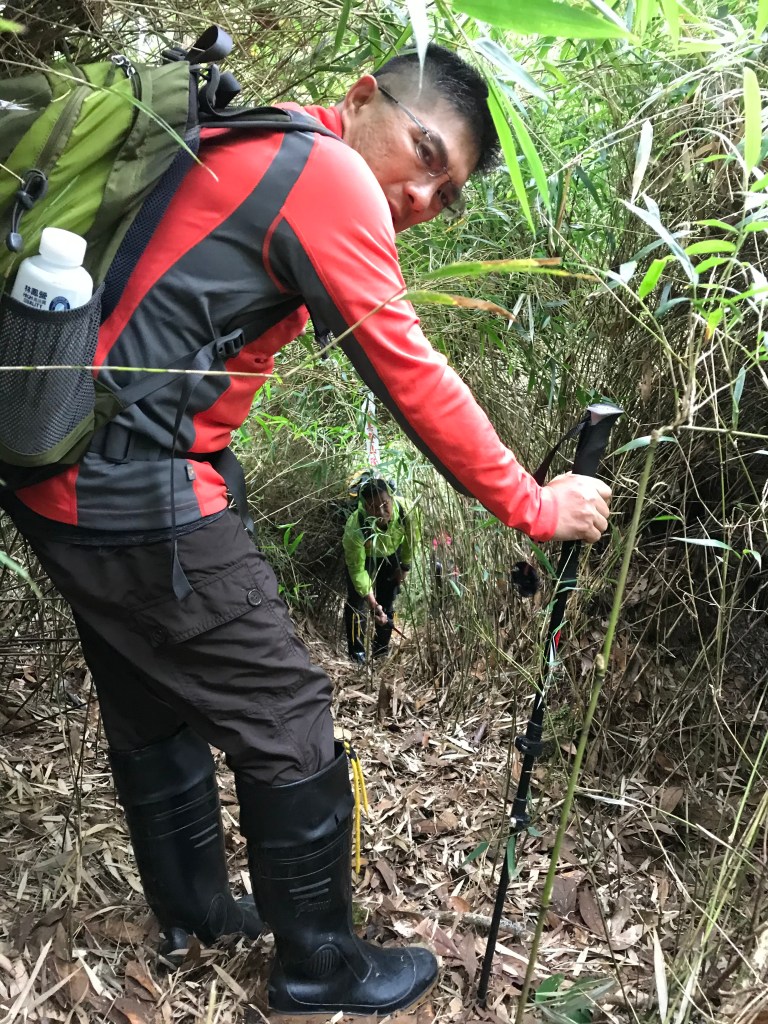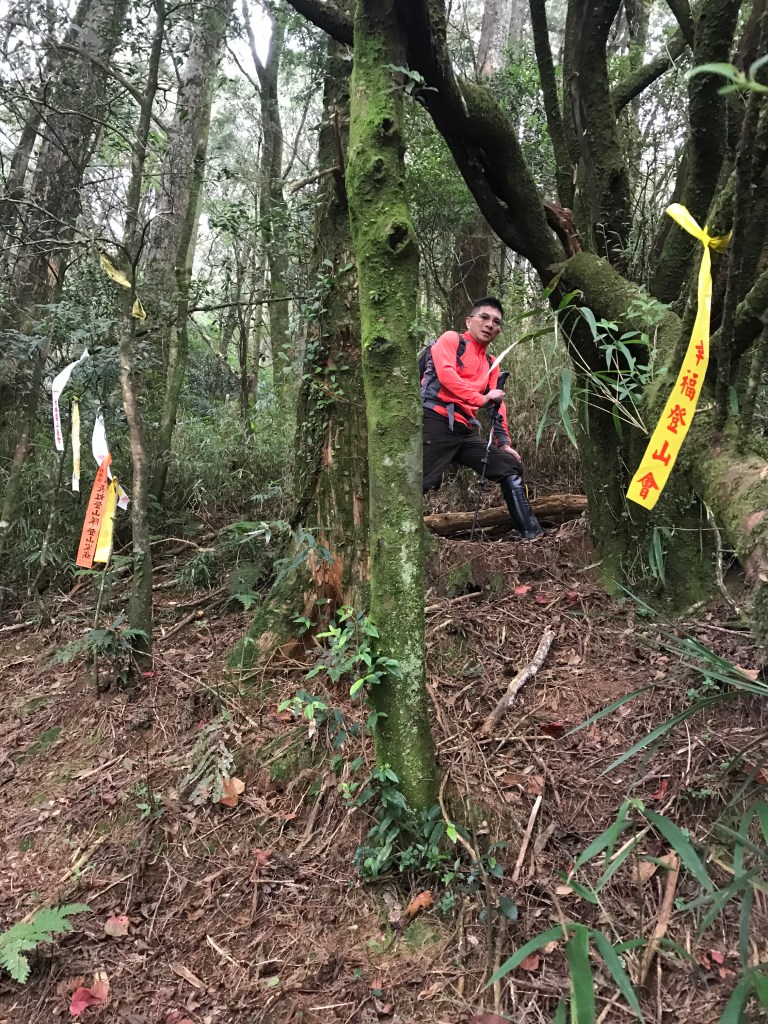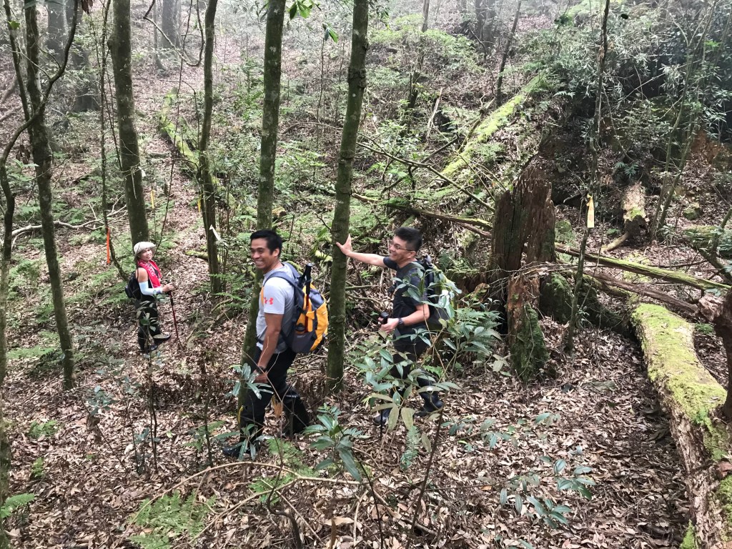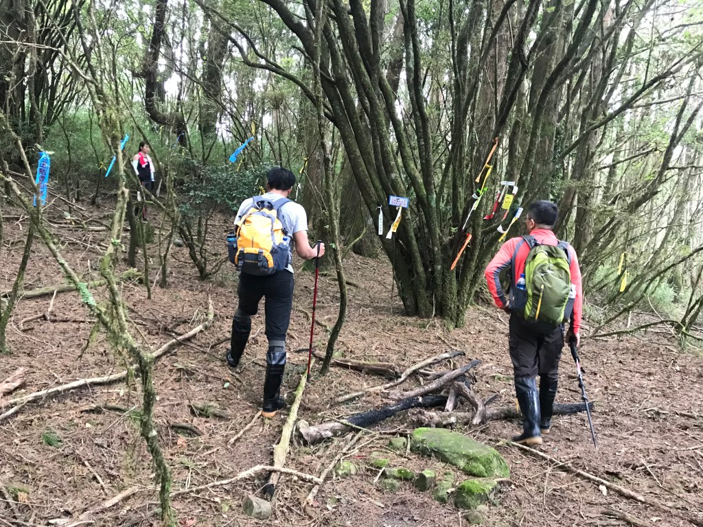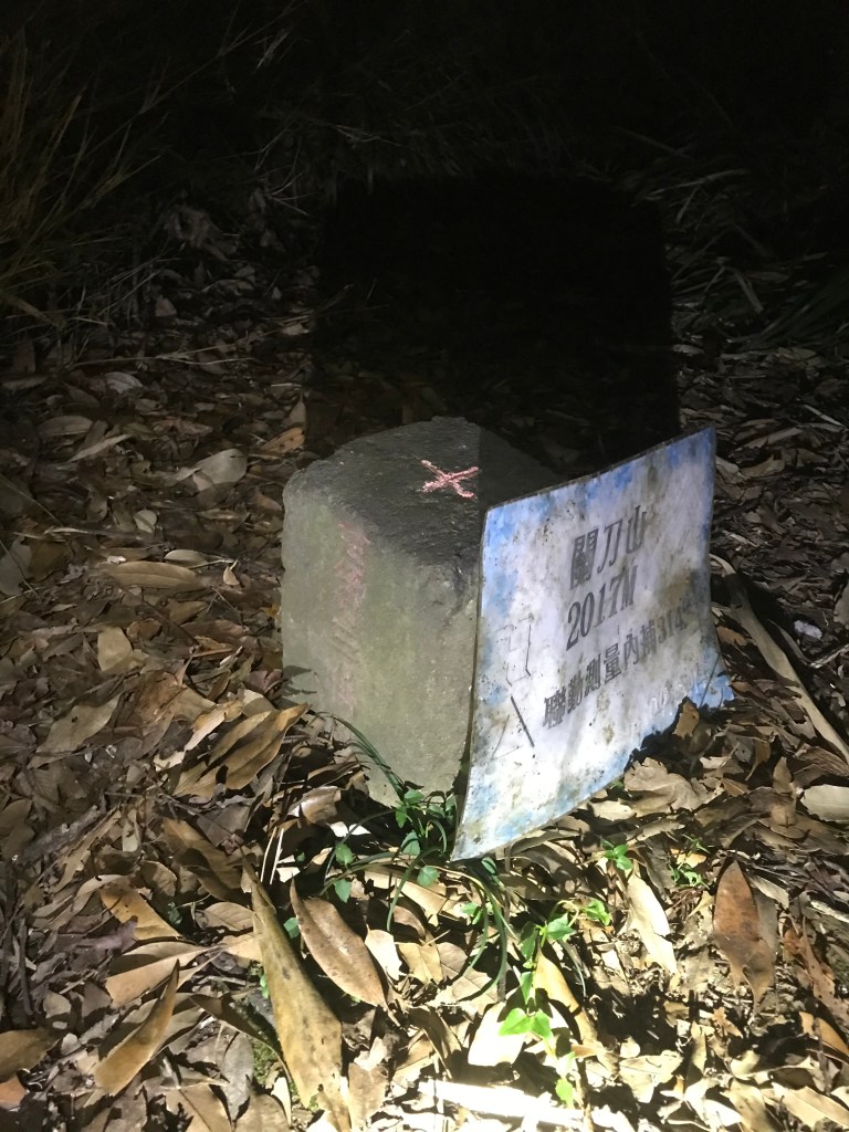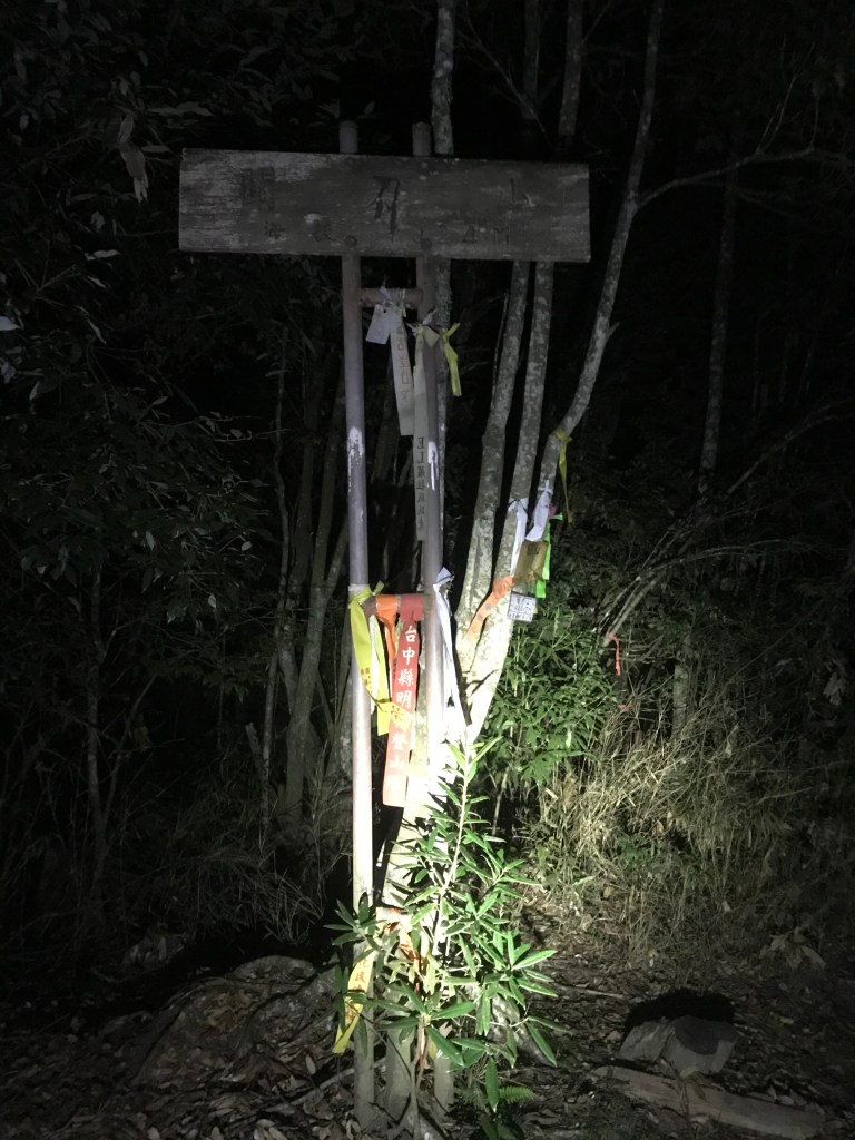 一開始在這一段路徑上有莫名其妙回走現象時,我個人內心有震驚了一下,事前我並沒有告訴其他三人,在這一段路徑上發生過的奇怪事件。但冷靜回想,此時大伙不想摸黑太久,走得又比較快,因此個人相信在過髮夾彎時,Smile一定沒有注意到方向,僅看到登山布條就跟著走,而不小心又往回守關山的方向。在此段耽誤了40分鐘。