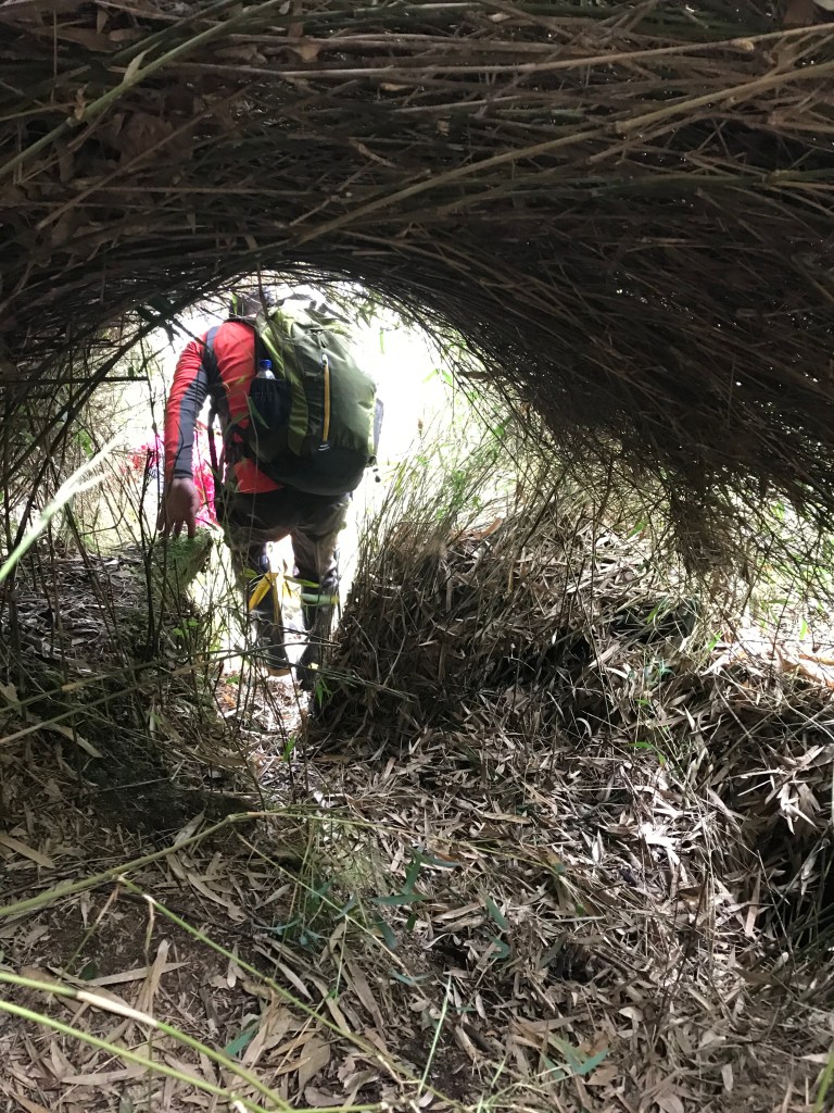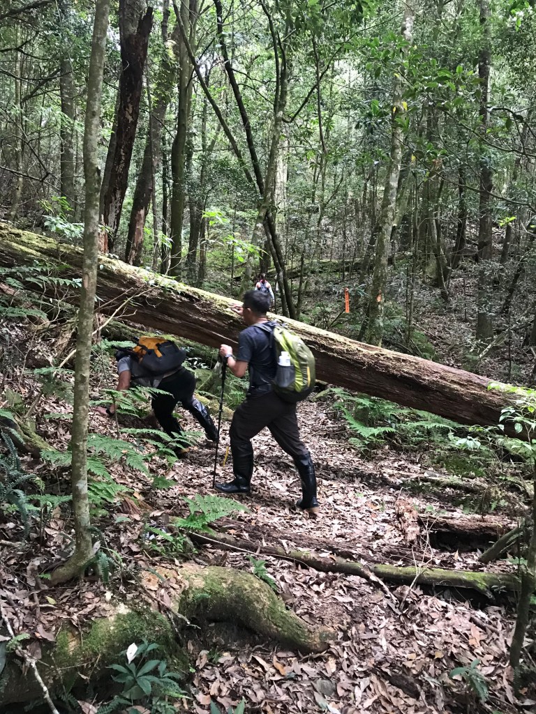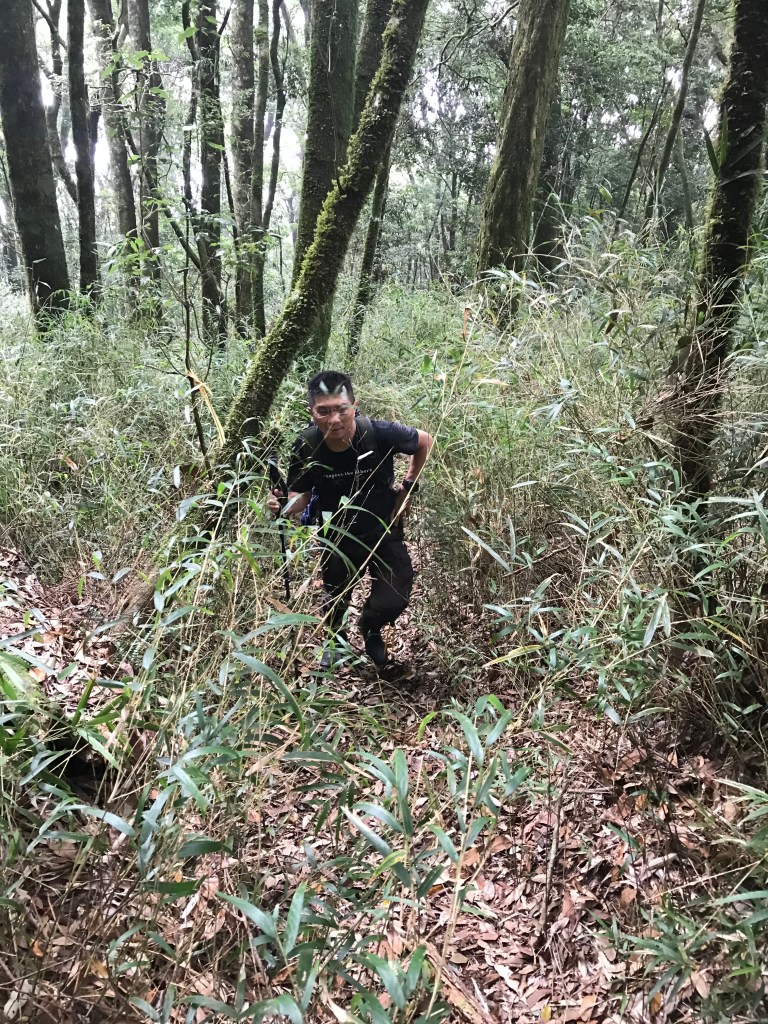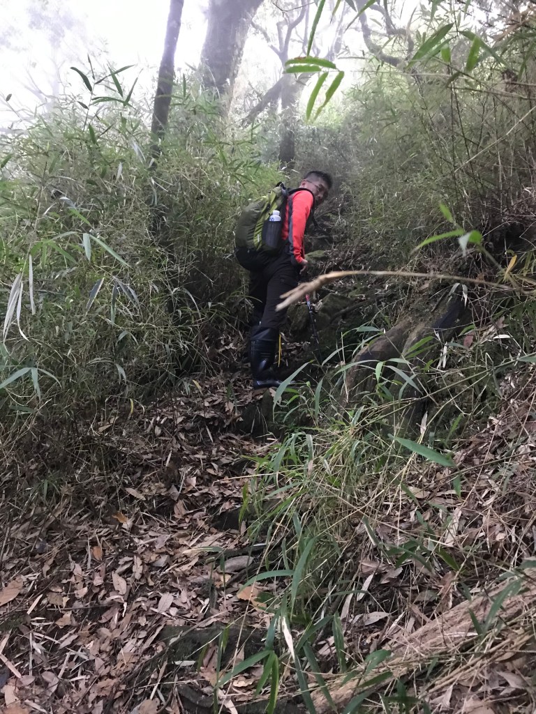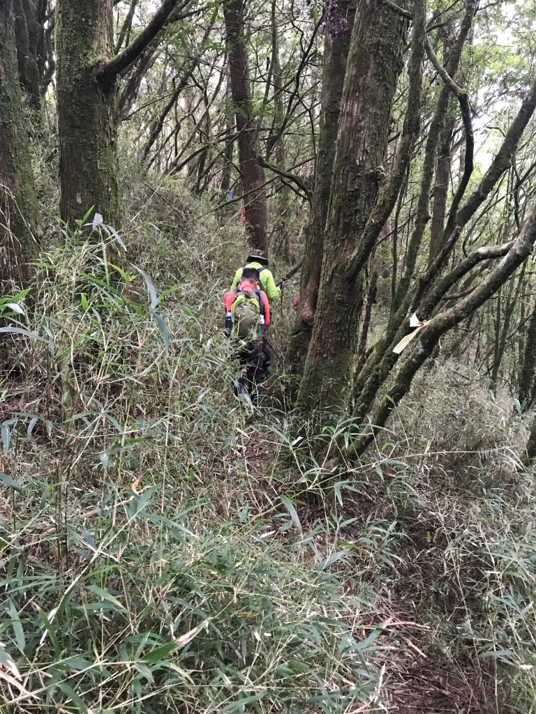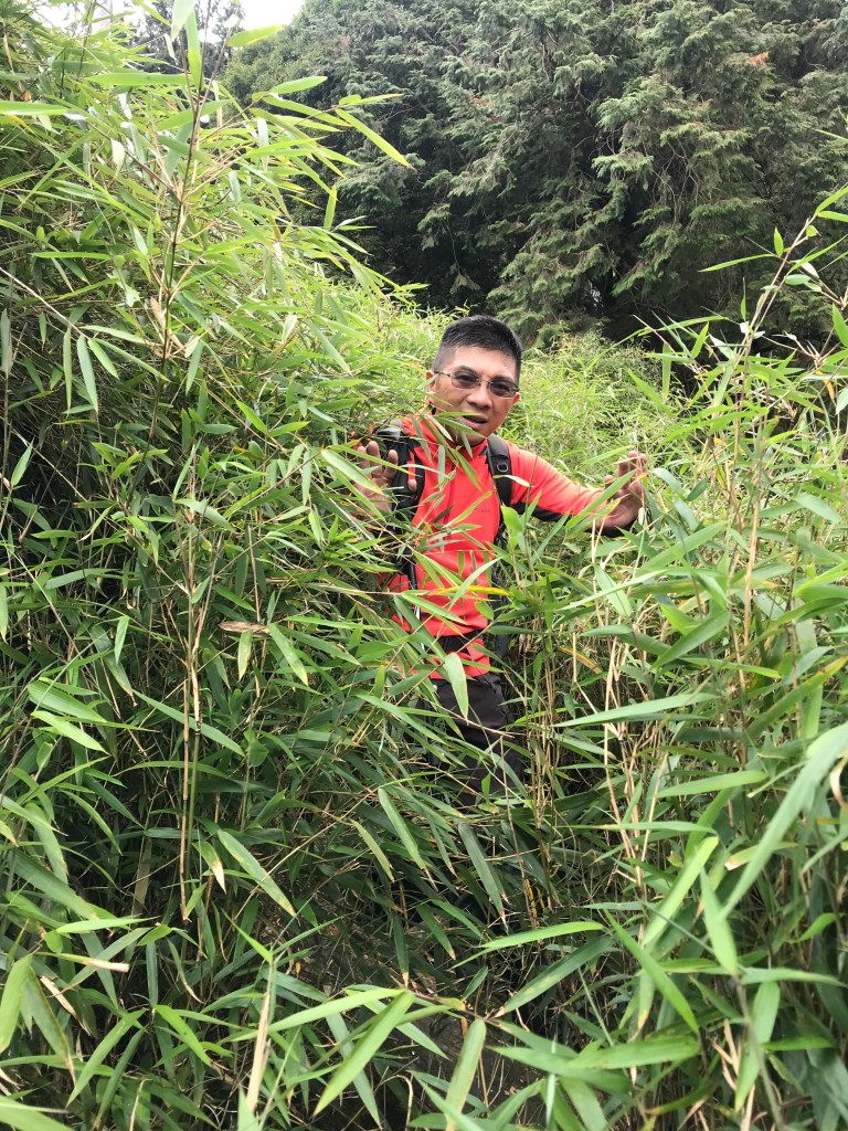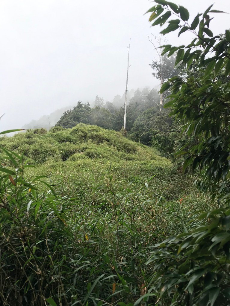 抵達守關山後,再折回50m回到岔路口,開始往距離有1.3K的守城大山走,接著就是泳進600m箭竹林的淬煉,先緩下再陡上,原來的箭竹林逐漸變成箭竹圓桶,約一小時後走到守城大山。