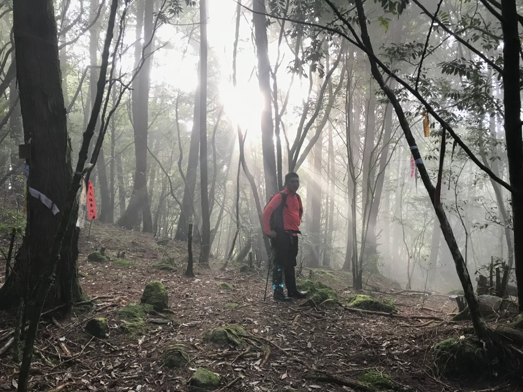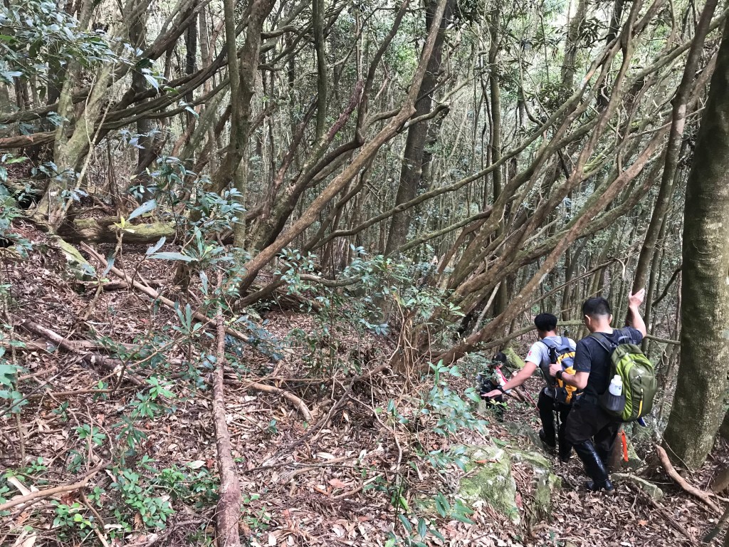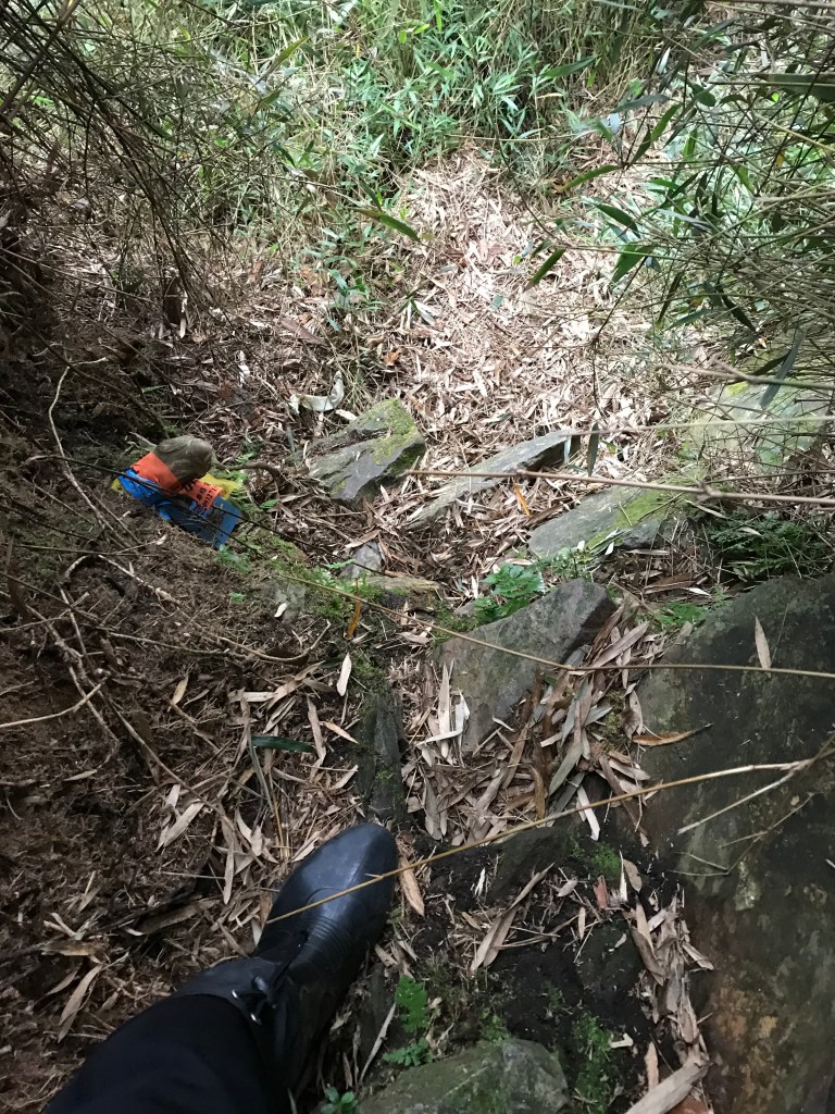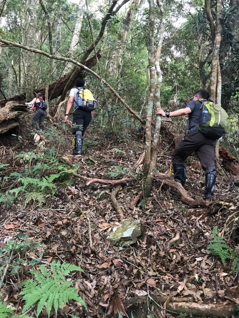 回程時,已經接近下午四點,大伙拍完照後就快步離開,回到守關山往關刀山方向走,在接近1935峰時天色轉黑,開始陡上接近髮夾彎的這一段路由Smile帶路,結果走了一段後,我(Gosen)跟著大伙喊:Stop!,因為我剛剛看到被埋進路徑上的一瓶機油瓶(不知道是誰埋的?),而這個機油瓶我15分鐘前才看過!這表示我們又往回走在守關山的路徑上,怎麼會出現這種鬼打牆的現象?又恰好是有發生過靈異事件的這一段?特別巧的是,這一段的手機指南針又有失靈現象,因此我們稍微休息一下吃點東西,並用Maps.me與目測環境確認正確的方向,此時改由我(Gosen)帶隊先走。
