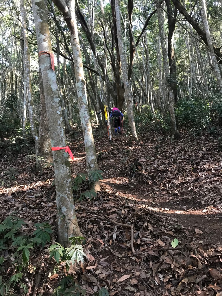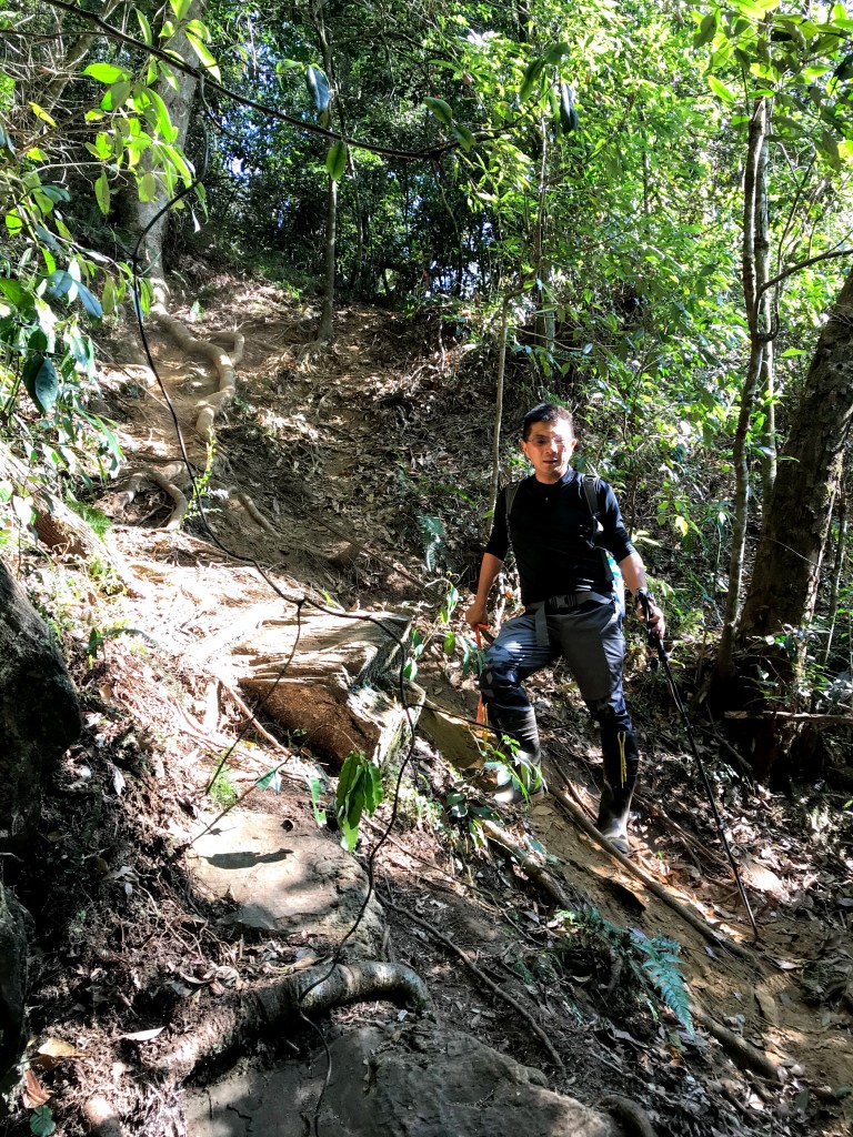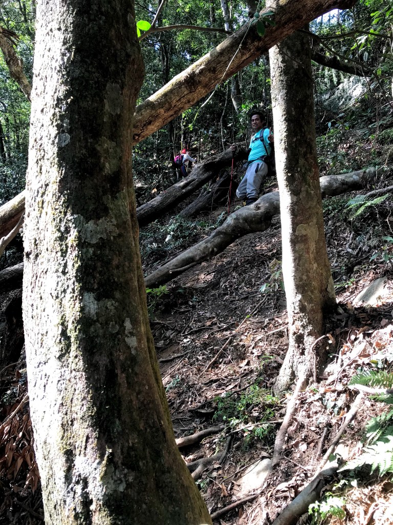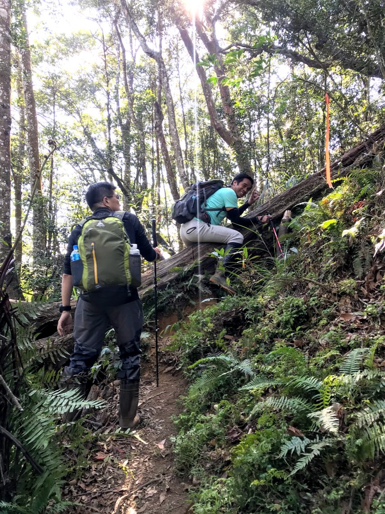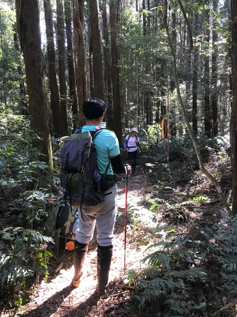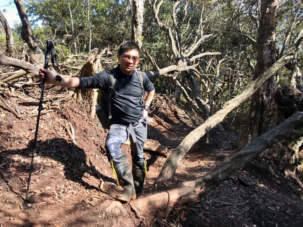 過了板仔寮山三角點,往舊武界山三角點前,路徑好走但仍持續陡上,到了舊武界山三角點時,已經快11點了(才約走了快7K),我有點擔心,今天可能又要用上頭燈了,從舊武界山三角點,一直到獅凸魯山(里程約第13K),除了快接近獅凸魯山的一小段外,大半路徑都非常好走。這段路上,我們的超級馬利歐(Mario)(腦海裏一直迴繞出現電視遊樂器中,過關的聲音),頭也不回,帶領著我們一直往前衝,雖然我氣喘呼呼的勉力跟上,但也很感謝Mario的衝勁,這時是下午兩點半。這其中我們在武界越山主峰花了40分鐘吃午餐,休息、拍照。