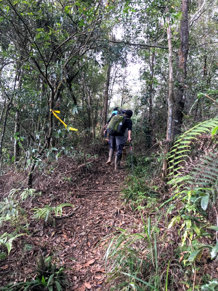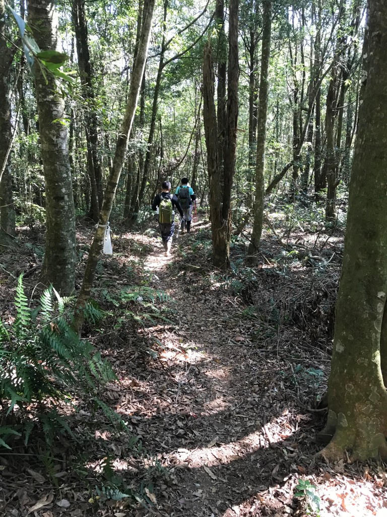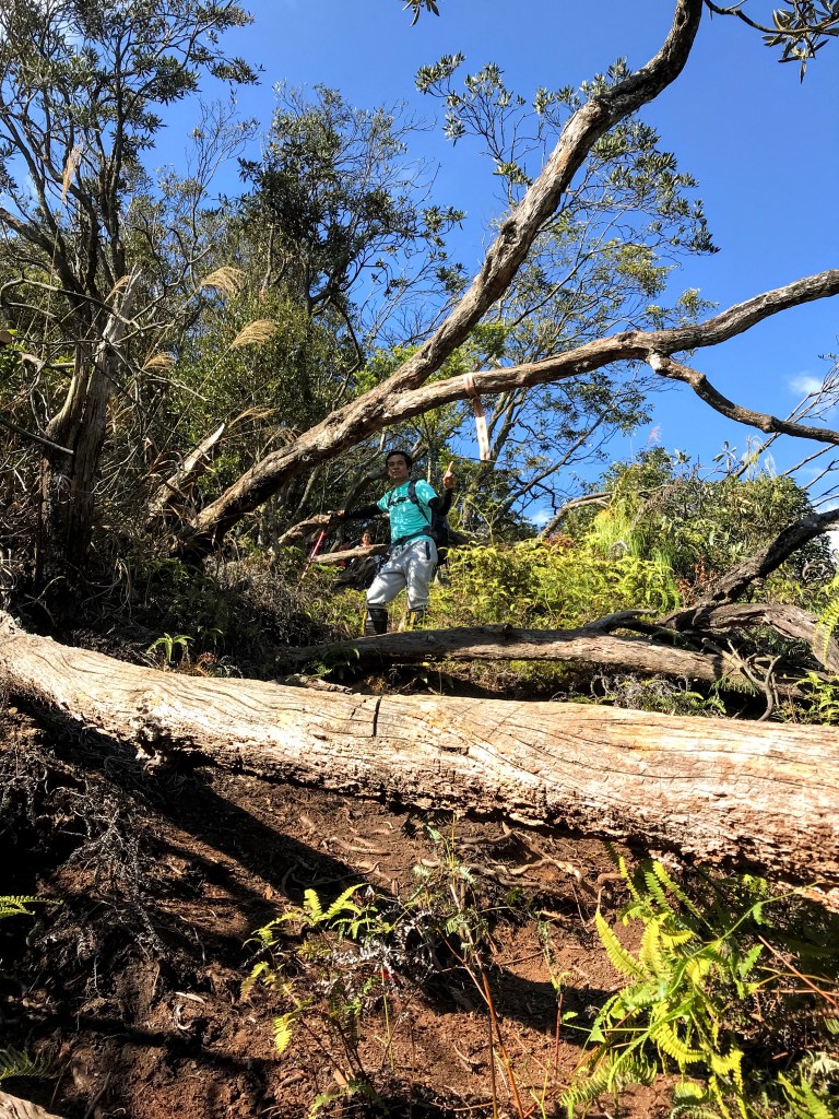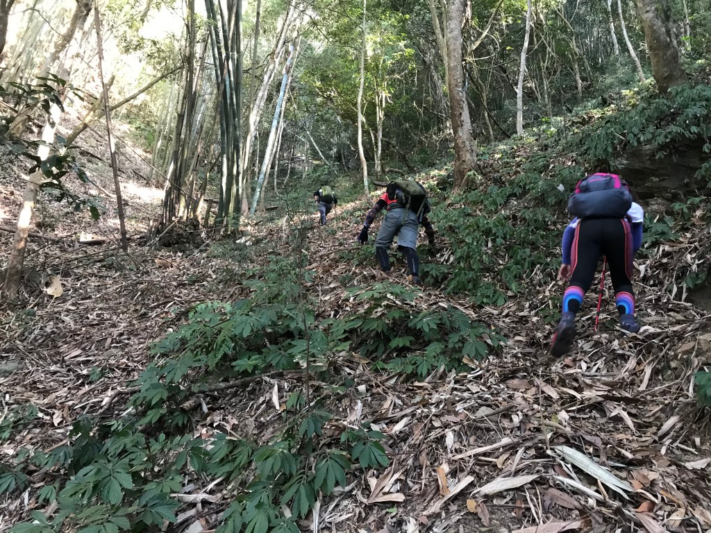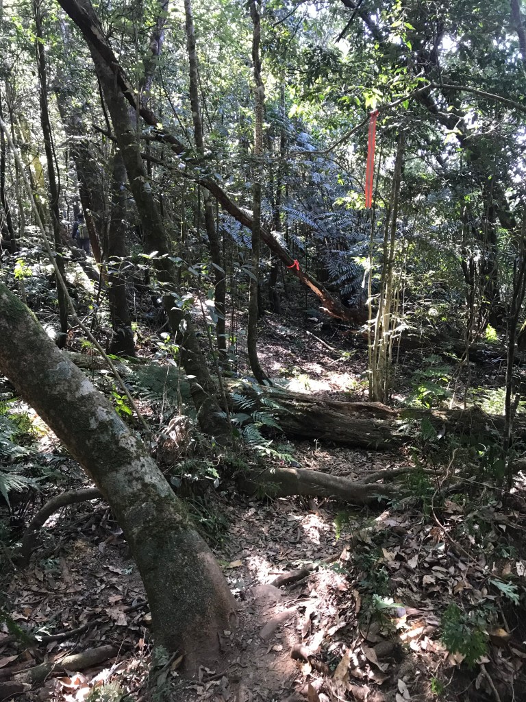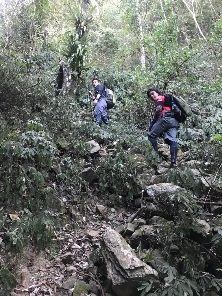 過了板仔寮山三角點,往舊武界山三角點前,路徑好走但仍持續陡上,到了舊武界山三角點時,已經快11點了(才約走了快7K),我有點擔心,今天可能又要用上頭燈了,從舊武界山三角點,一直到獅凸魯山(里程約第13K),除了快接近獅凸魯山的一小段外,大半路徑都非常好走。這段路上,我們的超級馬利歐(Mario)(腦海裏一直迴繞出現電視遊樂器中,過關的聲音),頭也不回,帶領著我們一直往前衝,雖然我氣喘呼呼的勉力跟上,但也很感謝Mario的衝勁,這時是下午兩點半。這其中我們在武界越山主峰花了40分鐘吃午餐,休息、拍照。