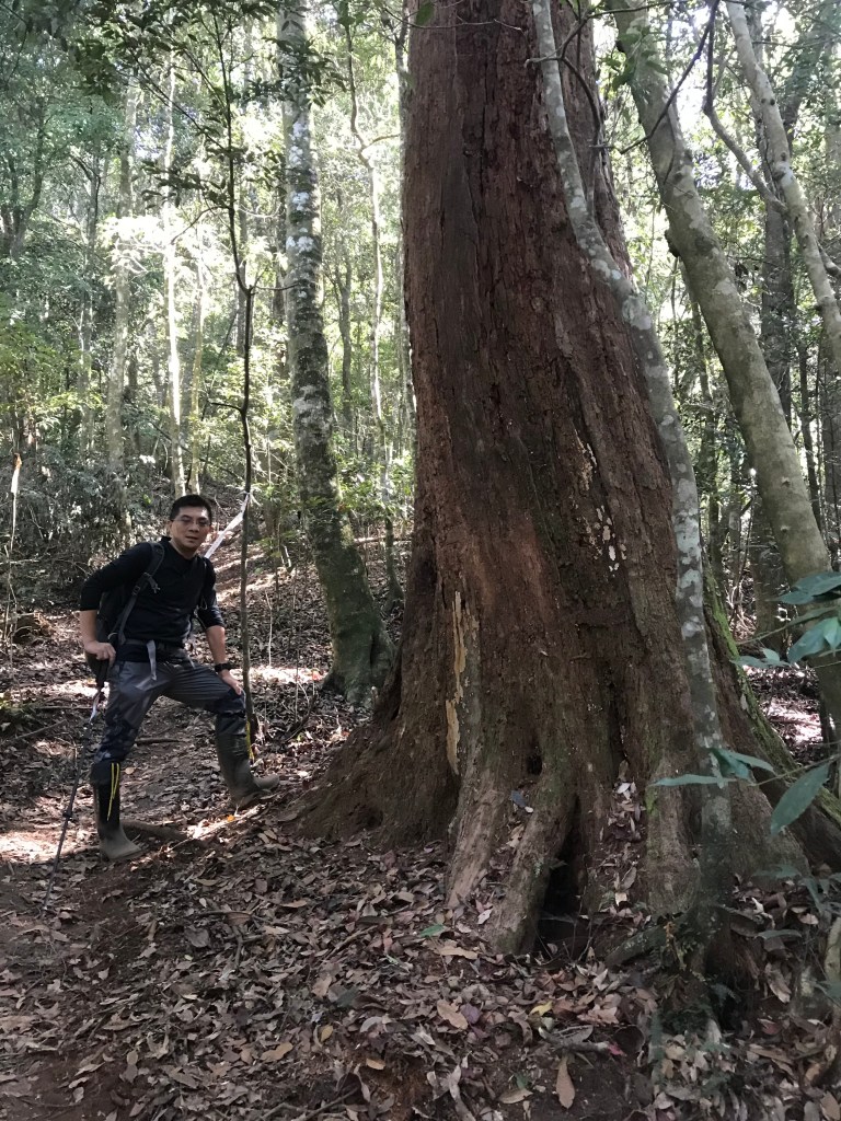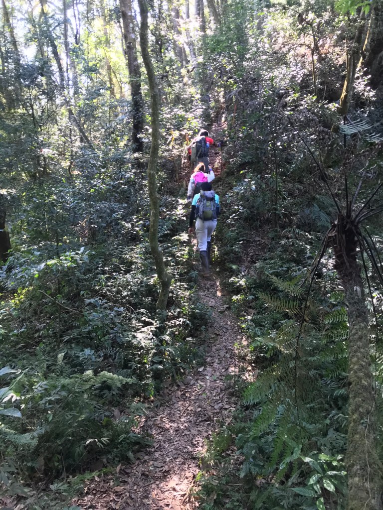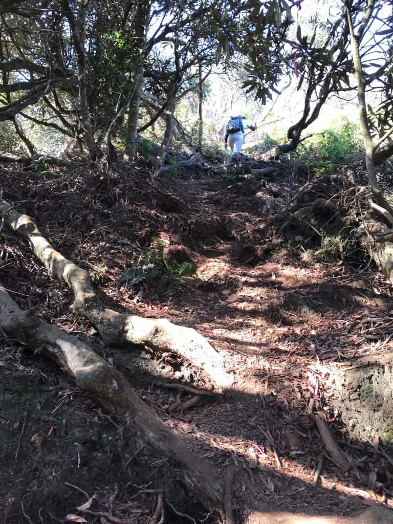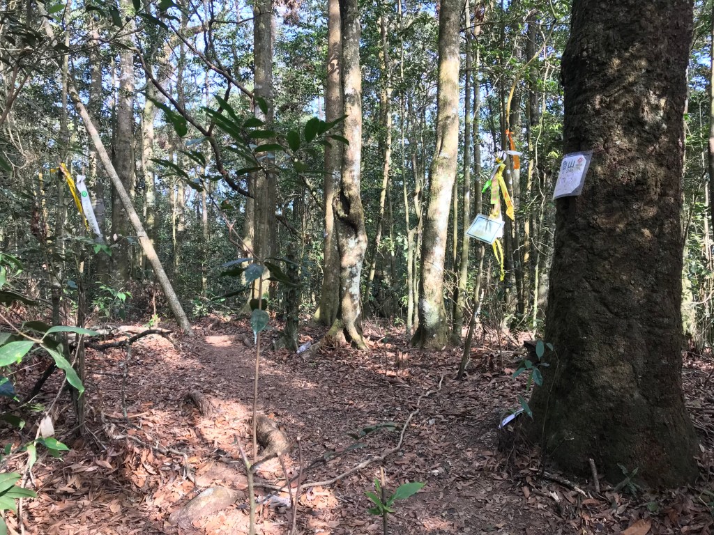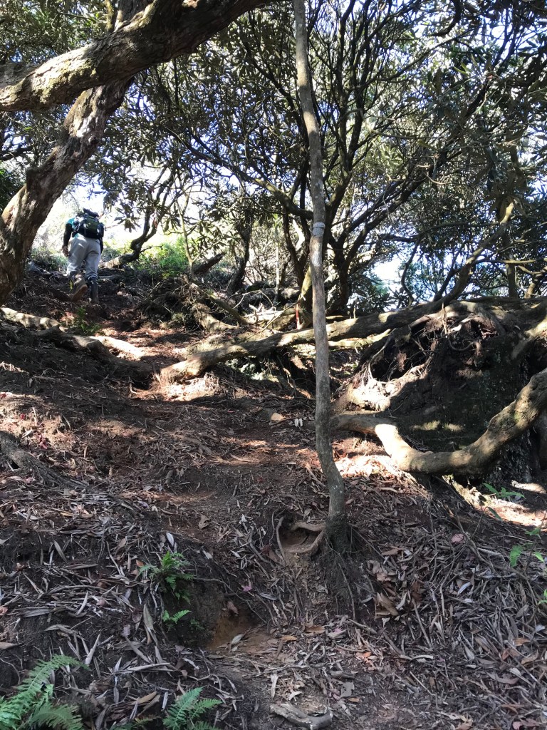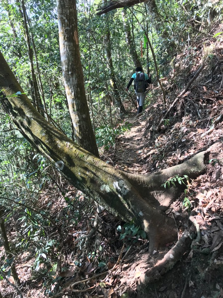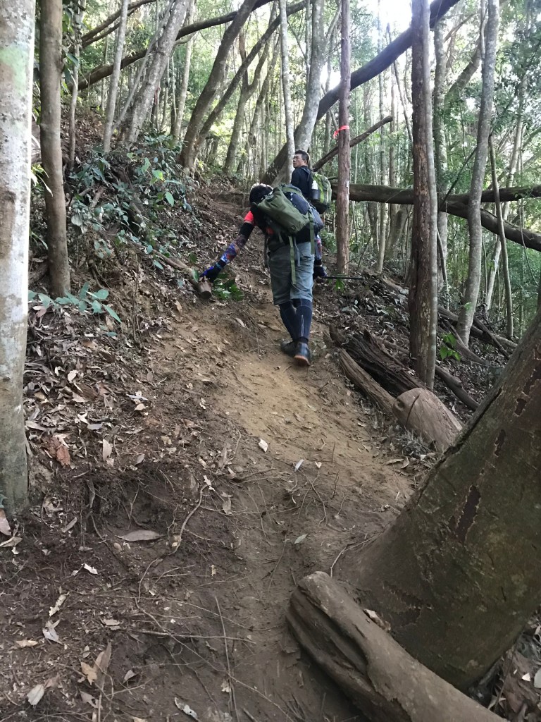 過了板仔寮山三角點,往舊武界山三角點前,路徑好走但仍持續陡上,到了舊武界山三角點時,已經快11點了(才約走了快7K),我有點擔心,今天可能又要用上頭燈了,從舊武界山三角點,一直到獅凸魯山(里程約第13K),除了快接近獅凸魯山的一小段外,大半路徑都非常好走。這段路上,我們的超級馬利歐(Mario)(腦海裏一直迴繞出現電視遊樂器中,過關的聲音),頭也不回,帶領著我們一直往前衝,雖然我氣喘呼呼的勉力跟上,但也很感謝Mario的衝勁,這時是下午兩點半。這其中我們在武界越山主峰花了40分鐘吃午餐,休息、拍照。