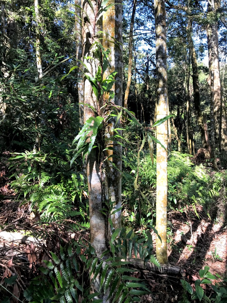 早上在7點時,將車停在青山橋(直接按入即可進入Google導航畫面)。起登後,會先走上半小時的產業道路,過了鐵柵門及白色住家後,接下來的2公里路徑,原始、隨處可見的大蛛蛛網、很少的布條以及被雜草樹叢遮蔽而看不見的路徑,會讓人一直懐疑,走對嗎?走過這2公里後,路徑轉為明顯,緊接著一小段攀爬及持續的陡上,就會抵達板仔寮山。