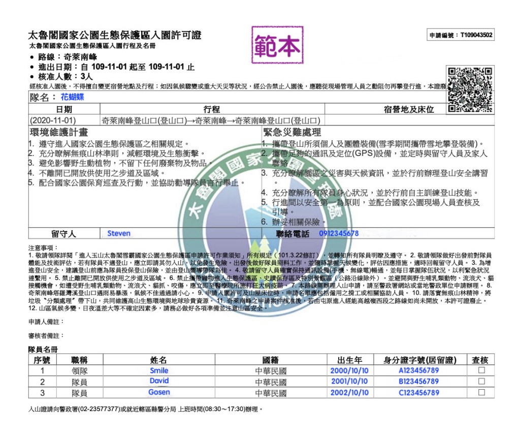 由等高線圖可以看出,奇萊南峰落於綠色的太魯閣國家公園生態保護區內,必須申請入園證,但不必申請入山證。南華山不在生態保護區的範圍內,不需申請入園。如下方的範本。