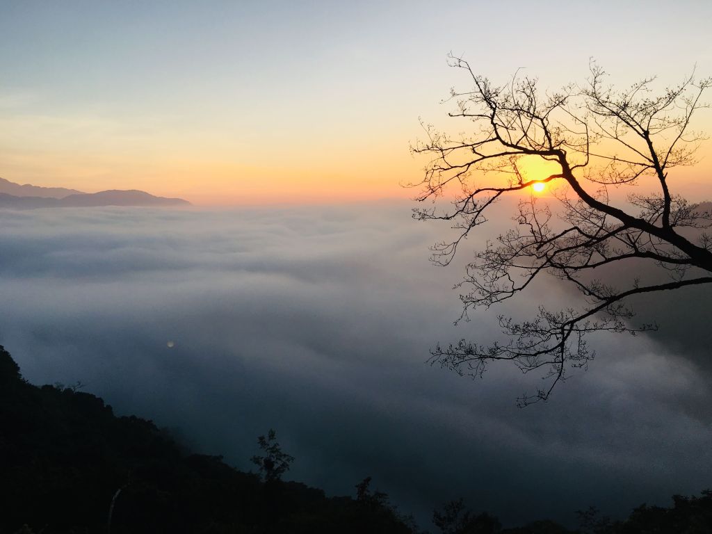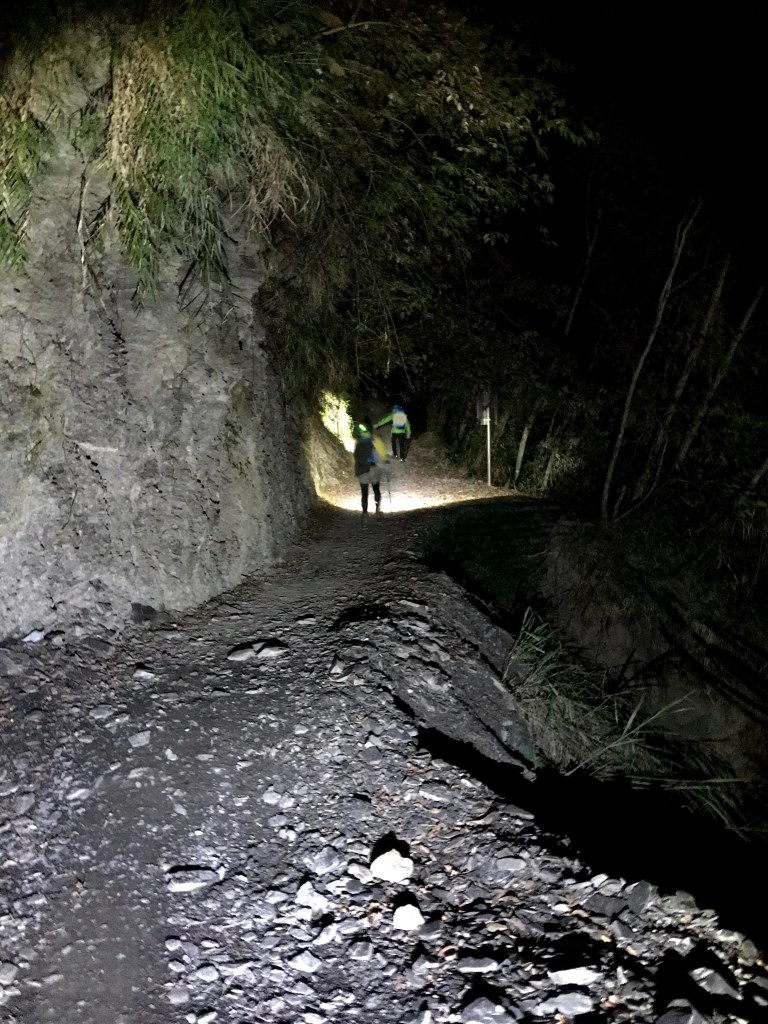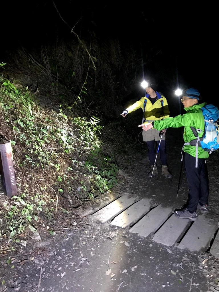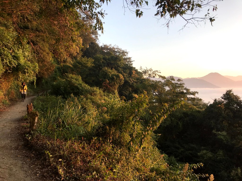 選擇原路而回,過了天池山莊岔後,Smile與我一路快走偶爾小跑步去追David,約在古道10K處又追上了林先生,我們兩人祝福他生日快樂後,就提包快跑續追David,原想David應該不會走得太快,沒有想到都快到登山口時才追上。就在此時,恰好是黃昏時刻,望著遠方逐漸西下的夕陽,我們三人居然被定住了!好美!直到回神後才繼續往登山口走。