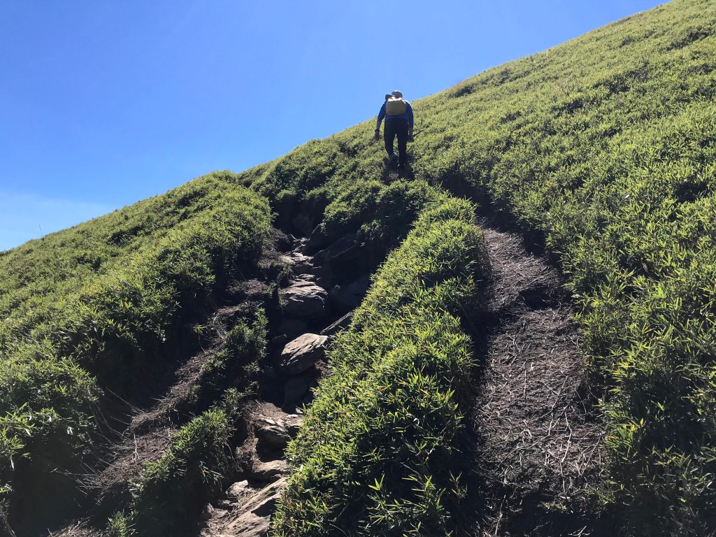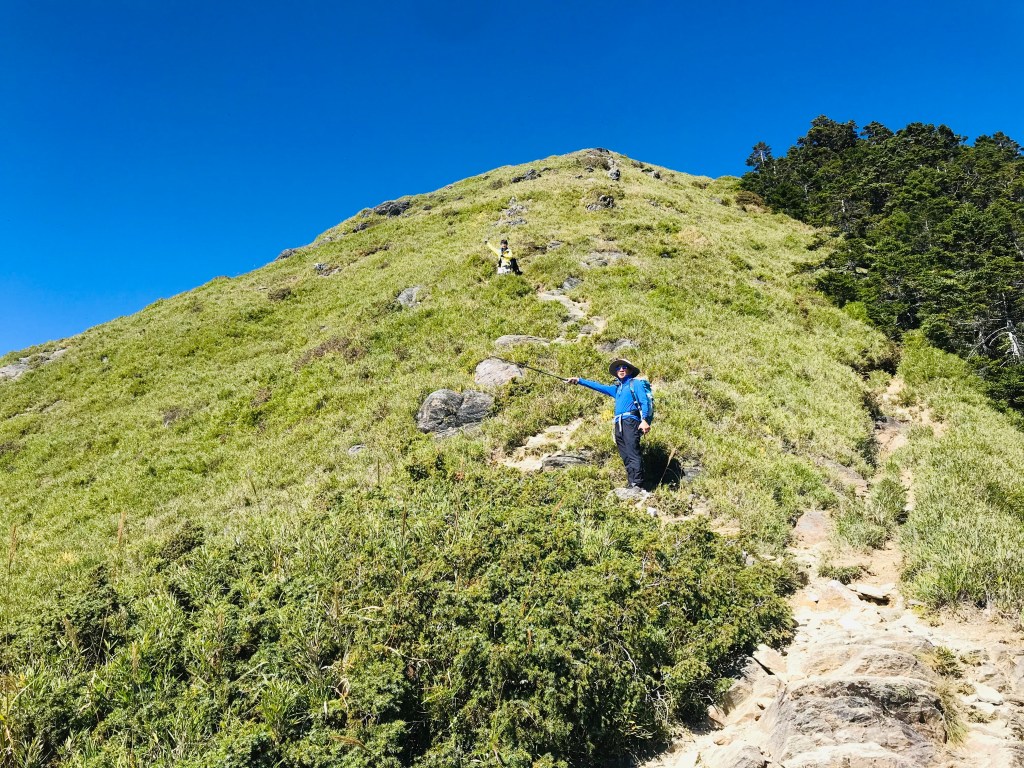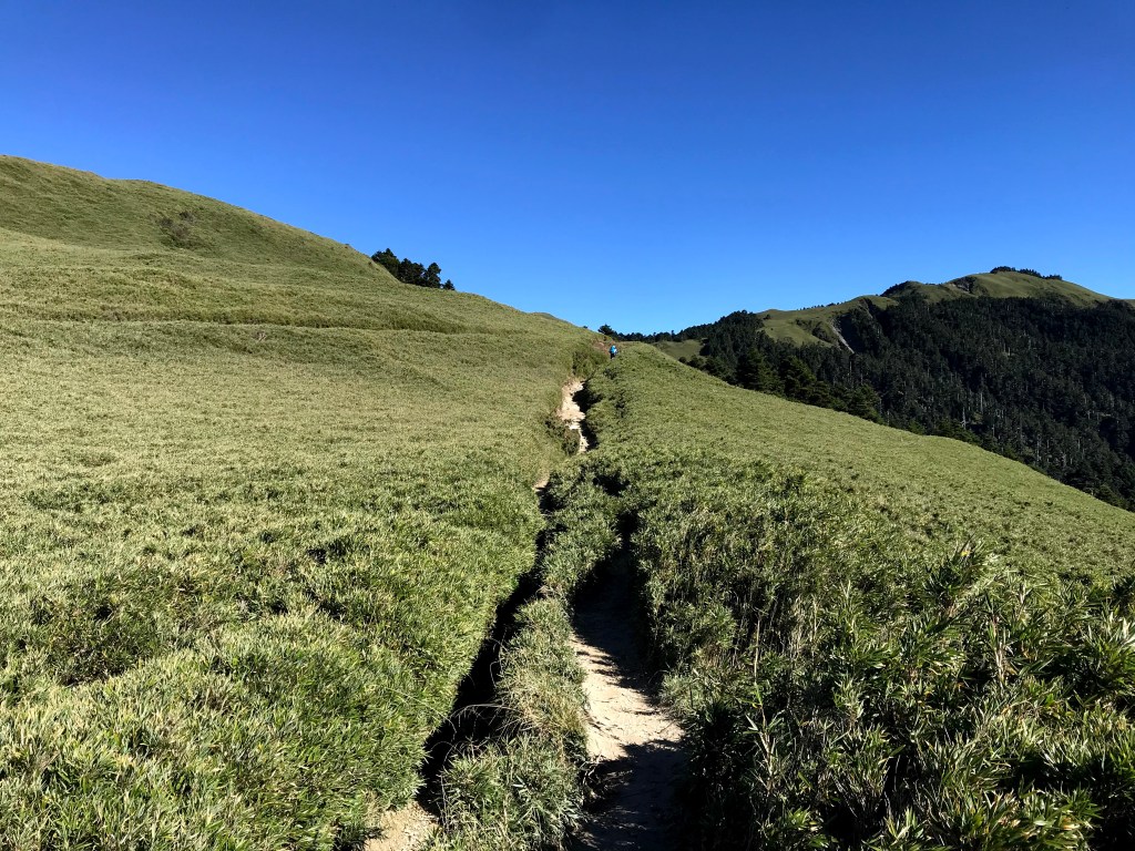 接著,由天池山莊岔往奇萊南峰必須再走3.1K。一開始就是陡上型態,一直到天池後會比較平緩,此處也是往奇萊南峰與南華山的岔路口,繼續前行是起伏不大的草原路徑,到了奇萊南峰岔後,就可直接仰望接下來不到1K陡上海拔250m的路徑,也是今天行程中最辛苦的一段。