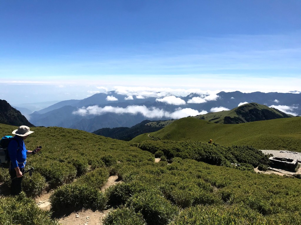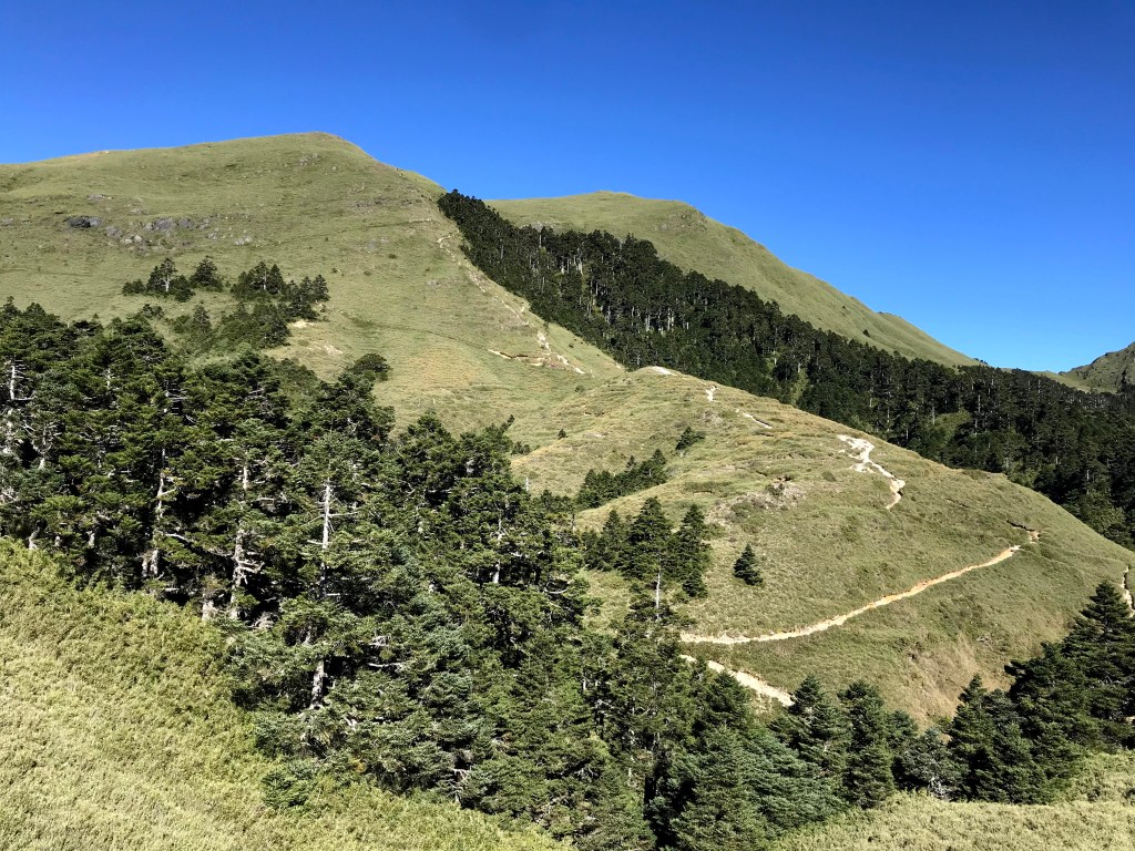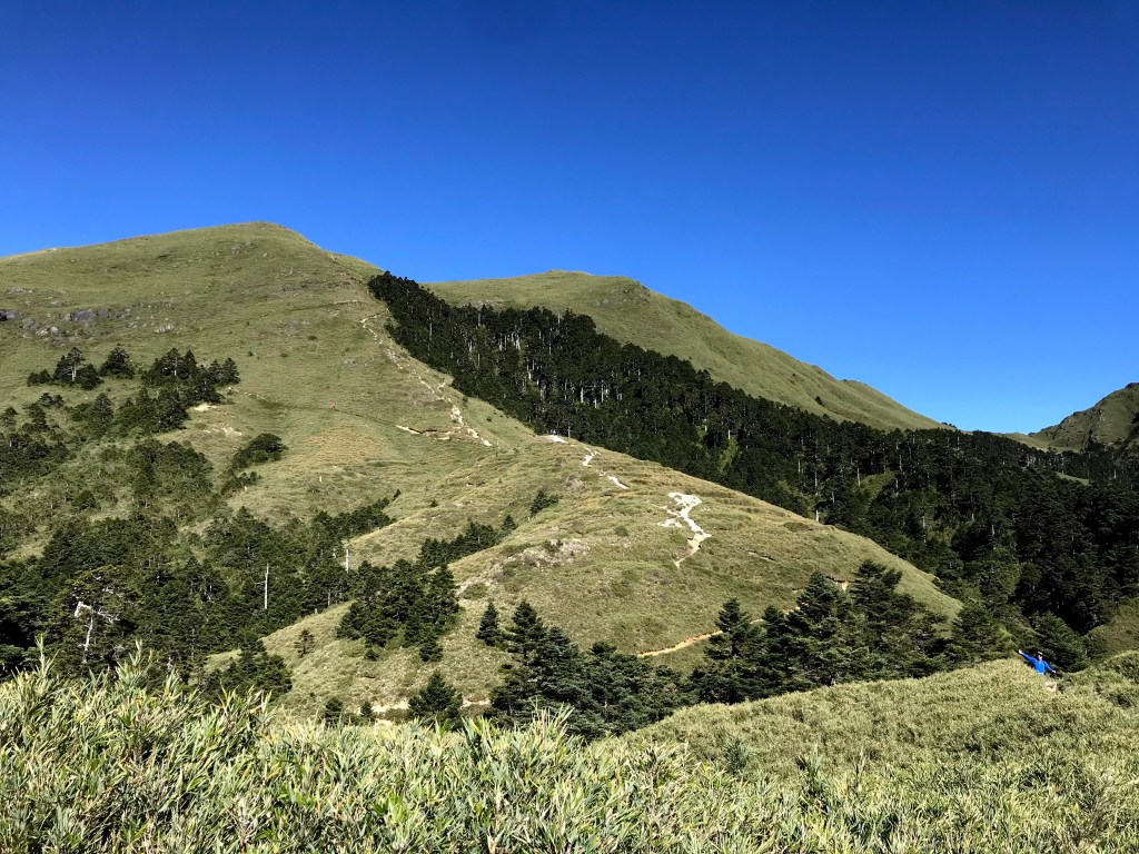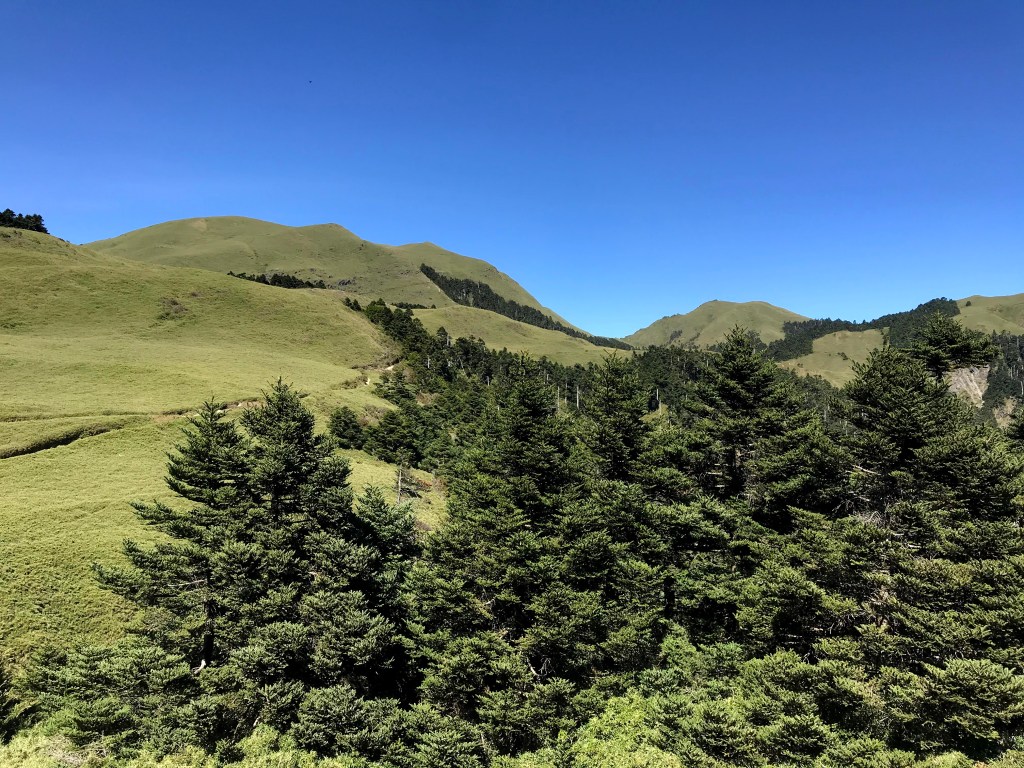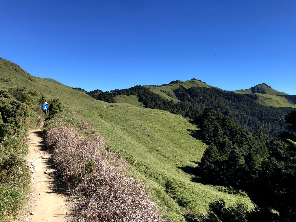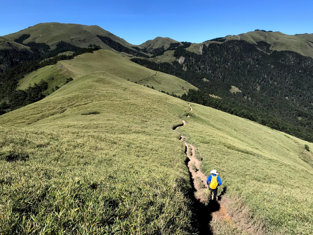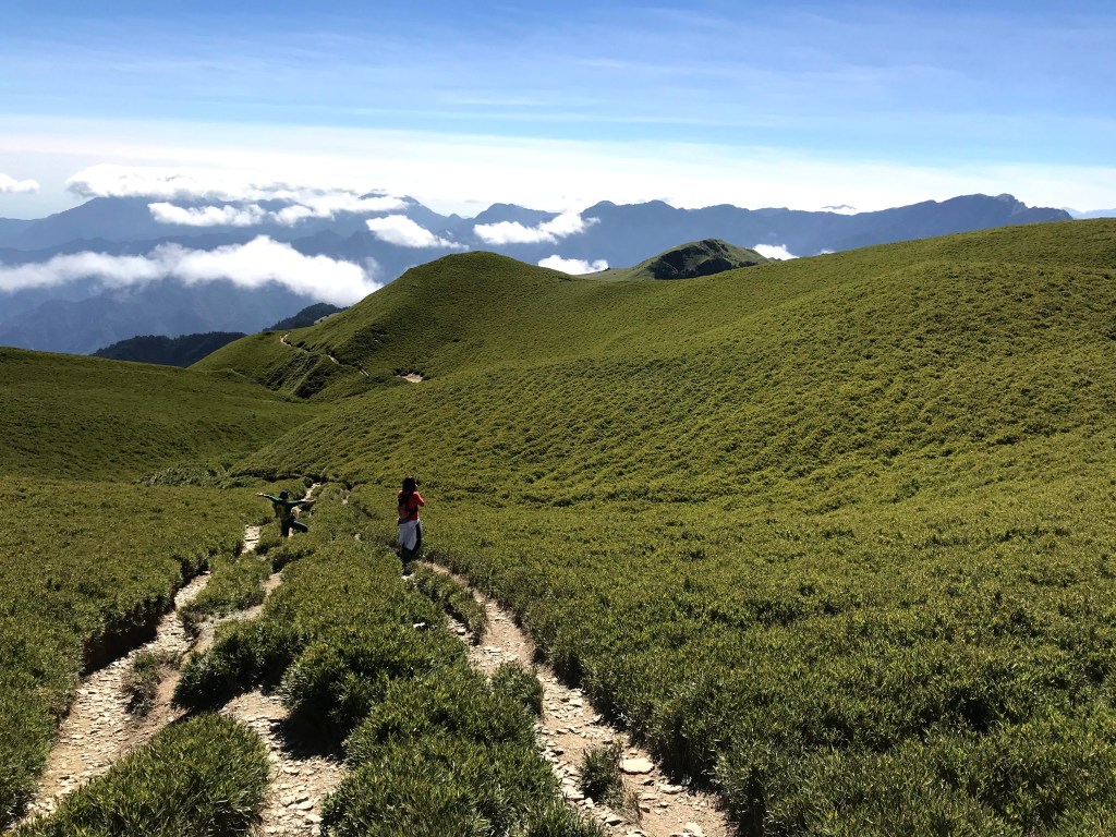 第二部份,由奇萊南峰到南華山。我們三人在奇萊南峰頂,看著奇萊主峰、奇萊北峰、合歡群峰、也遠望著能高主山與能高山南峰,看到蜿蜒於合歡群峰的台14甲線,不知不覺的居然停留超過了一個小時。由奇萊南峰下山回到天池,再由此岔路走1.5K的草原路徑緩緩而到南華山,中途除了一小段的樹林可以遮蔭外,都會在陽光的曝曬之下,但整個路徑視野遼闊,令人心曠神怡!