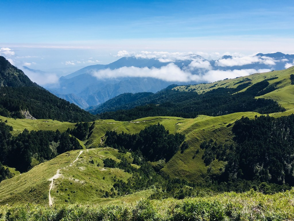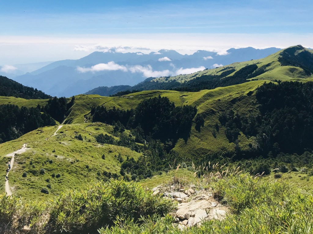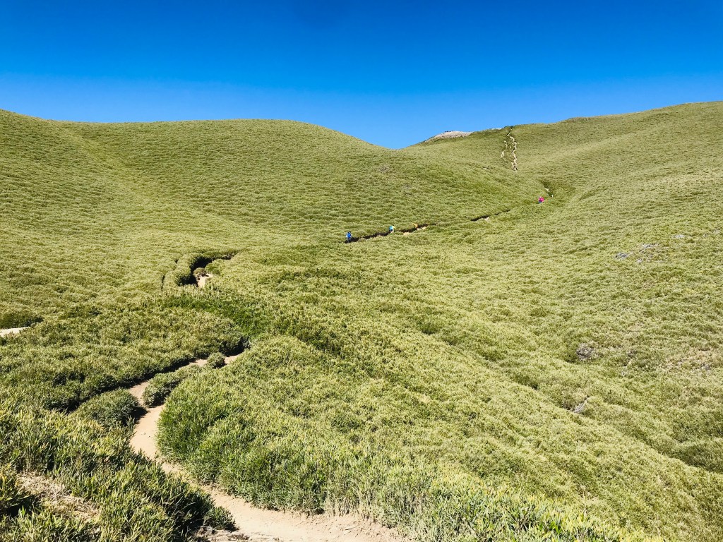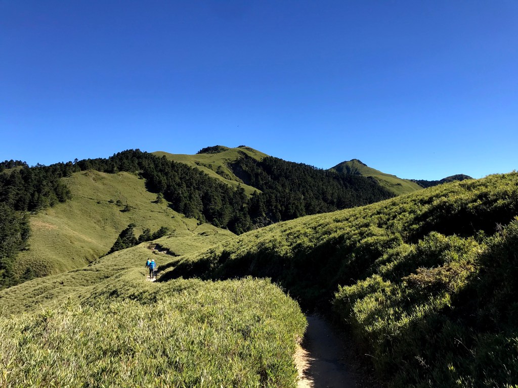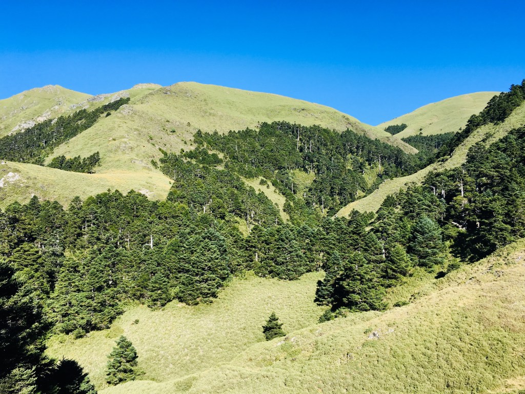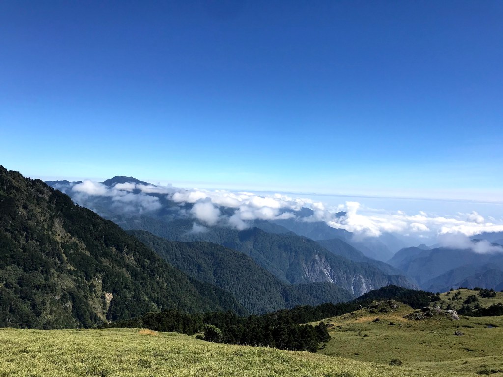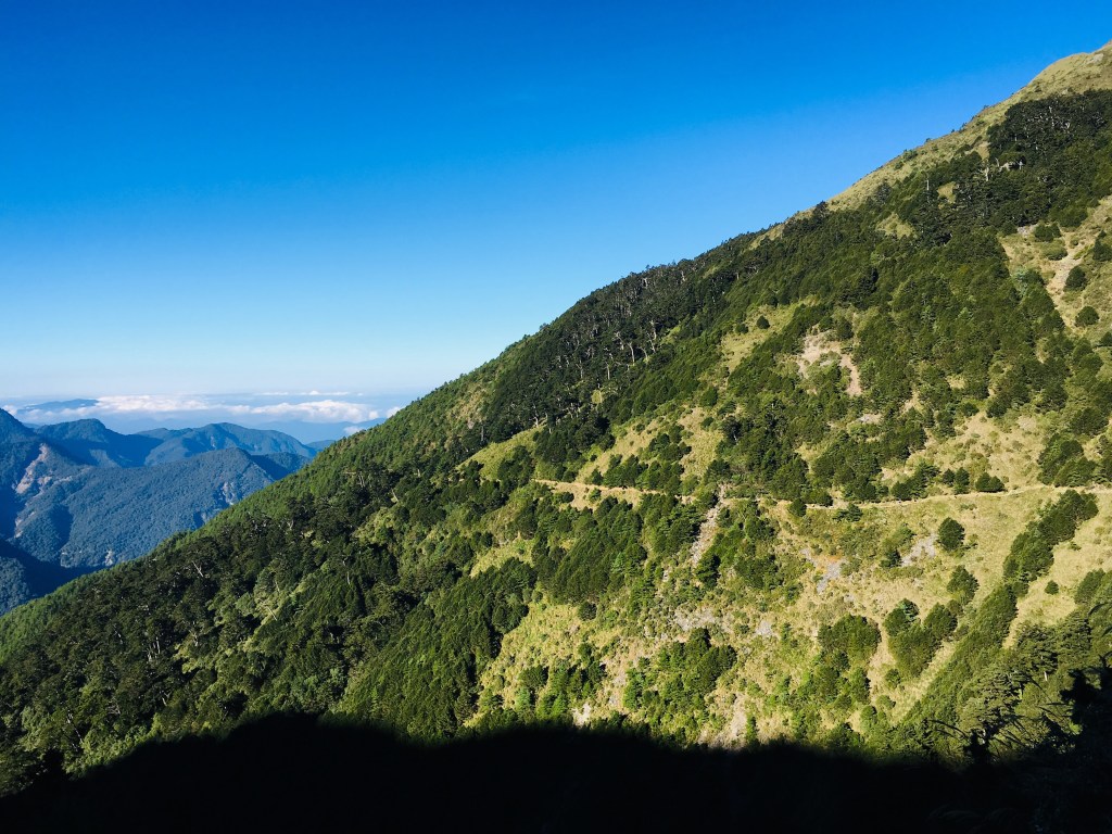 第二部份,由奇萊南峰到南華山。我們三人在奇萊南峰頂,看著奇萊主峰、奇萊北峰、合歡群峰、也遠望著能高主山與能高山南峰,看到蜿蜒於合歡群峰的台14甲線,不知不覺的居然停留超過了一個小時。由奇萊南峰下山回到天池,再由此岔路走1.5K的草原路徑緩緩而到南華山,中途除了一小段的樹林可以遮蔭外,都會在陽光的曝曬之下,但整個路徑視野遼闊,令人心曠神怡!
