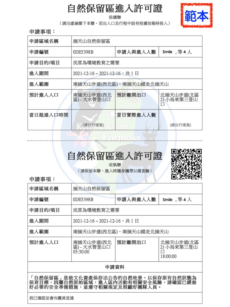 插天山自然保留區,是要申請的,而且要三人以上一起申請,申請的選項中就可以選擇,由南插水管路登山口進,並選由北插第二登山口出。範本如下: