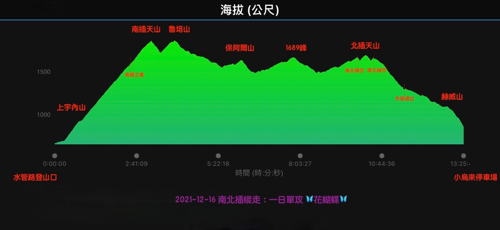今天三女一男的組合,內心一直有一些不確定性的感覺。第一是對伙伴狀態的不確定性,第二是對南北插之間路徑的不確定性。針對第一點,南北插縱走並不是很長的路線,但伙伴們能否承受?以及是否有體耐力走完?今日過程伙伴已出現步伐沈重及緩慢現象,尤其是在上南插天山前一段,以及過1689峰後一直到回到停車場之間,應該是前一晚睡眠時間不足所致,就會提高摸晚黑的風險!
