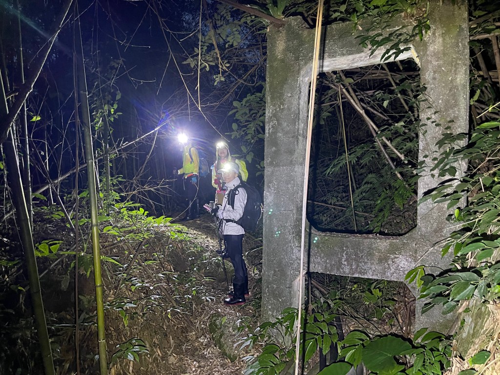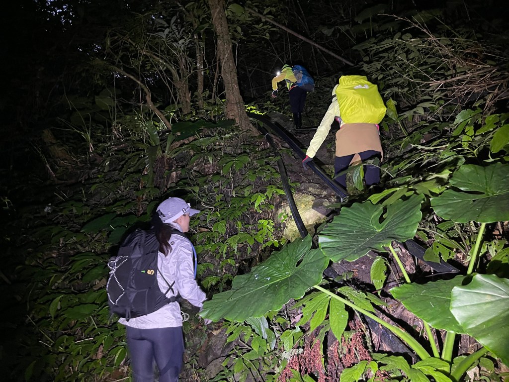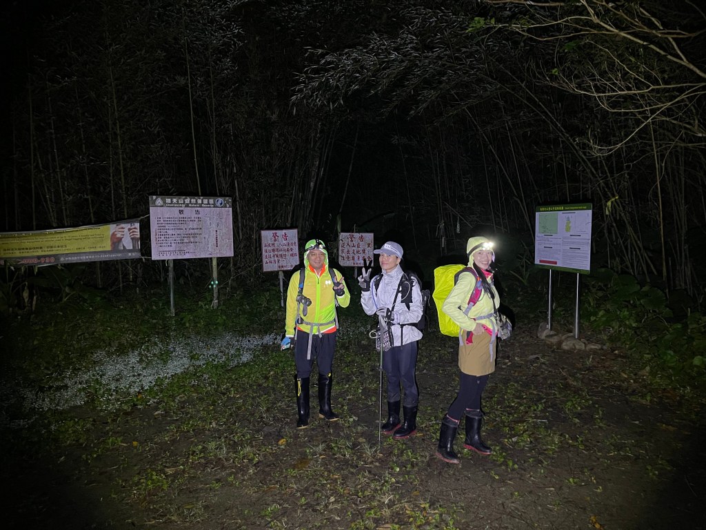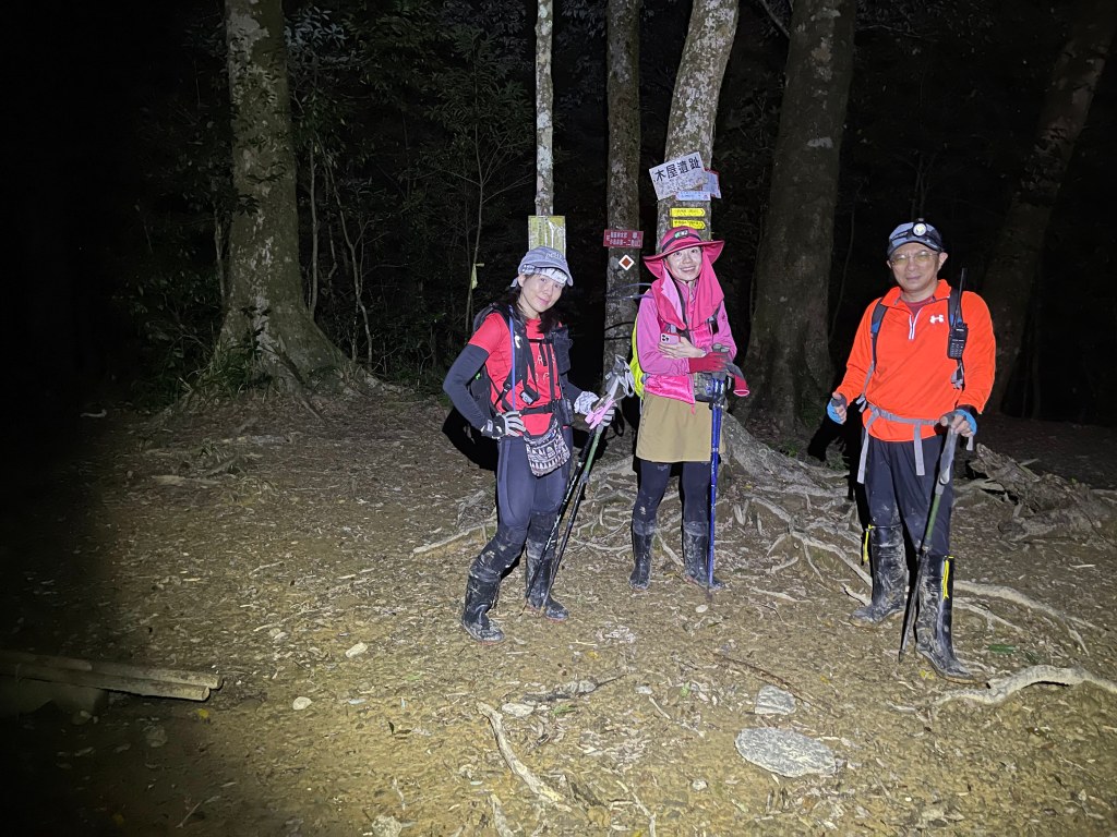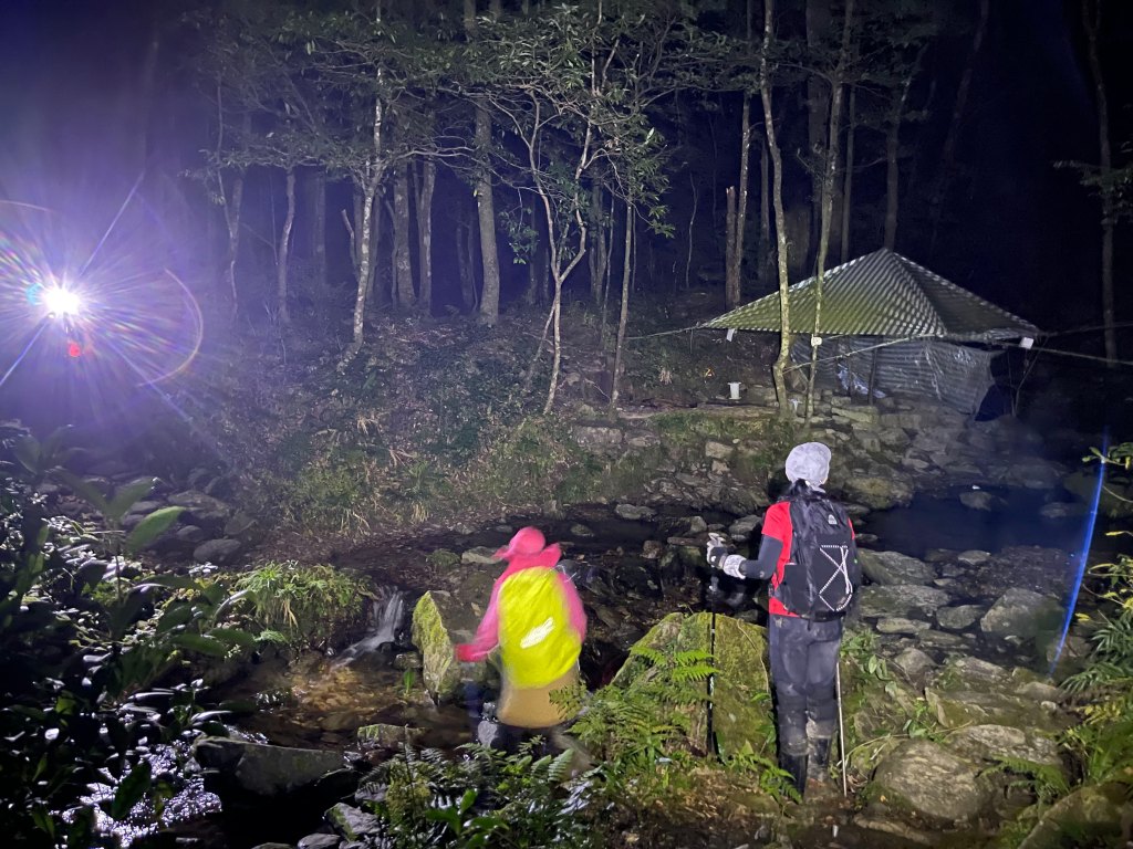 接著,在一起繼續往下到木屋遺址,接著要摸黑出第二登山口,也為了減緩妙妙的雙腿不適,此時一定要走水源地往赫威山方向,GPS上來看會稍微遠一些(3.2K+產道1K),但整段路徑幾乎平坦,我都稱這一條路線為高速公路,之前Steven、Smile與我,曾一起從這一條路線快走下山,約一個小時即可抵達停車場,不過今天我們走了兩小時多。也建議朋友們,如果到了木屋遺址已經摸黑,不要再走神木區回第一登山口,這一段距離雖然短了一些但是比較難走,萬一不小心走錯岔路往白紗瀑布方向,就會是一條難走的路!