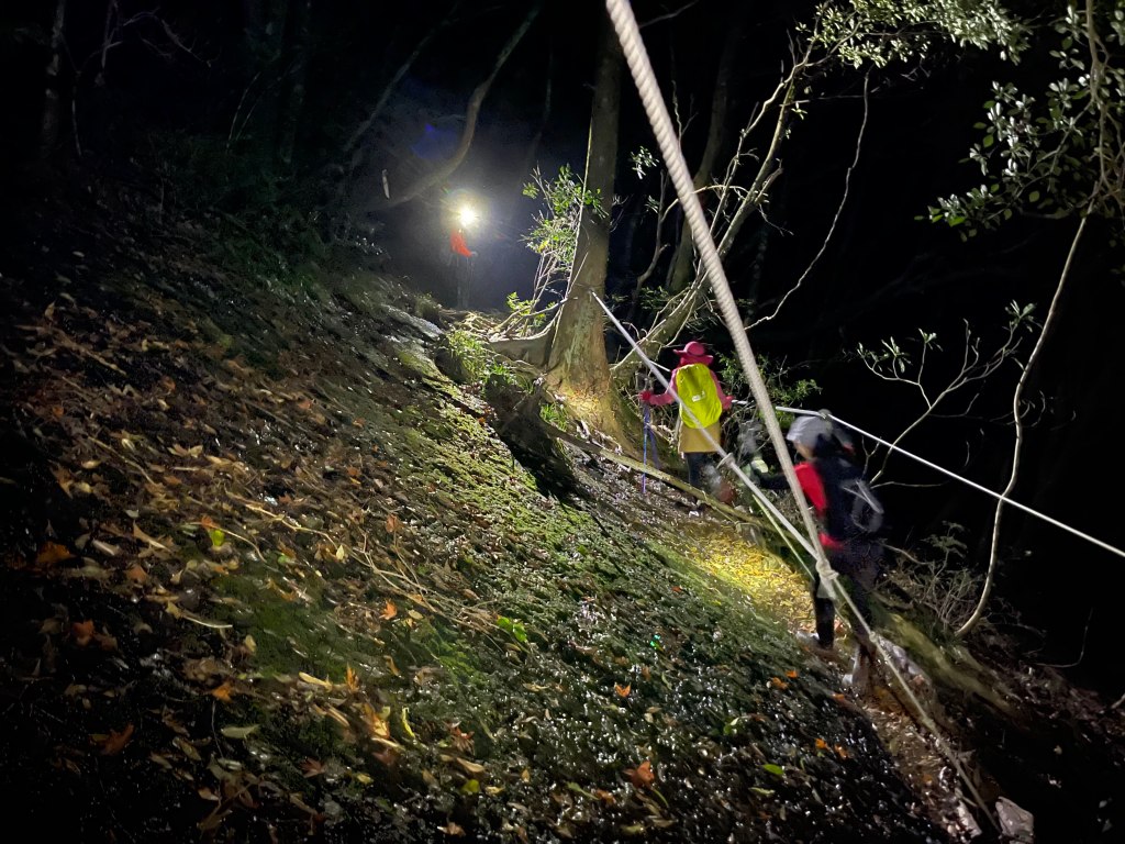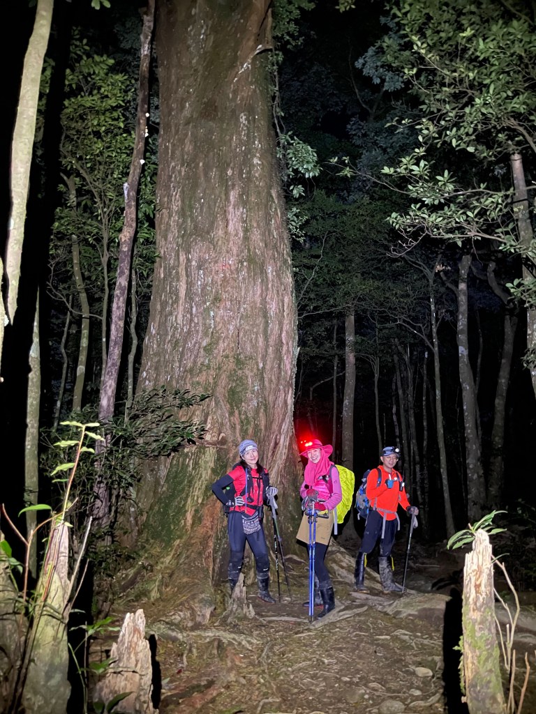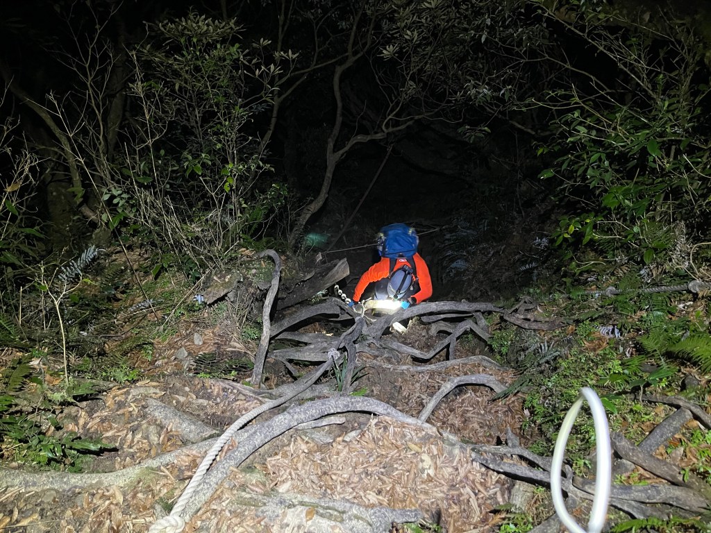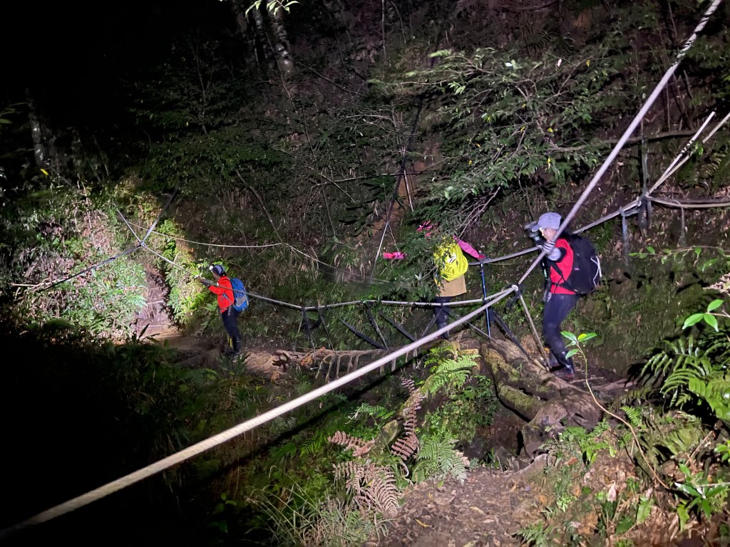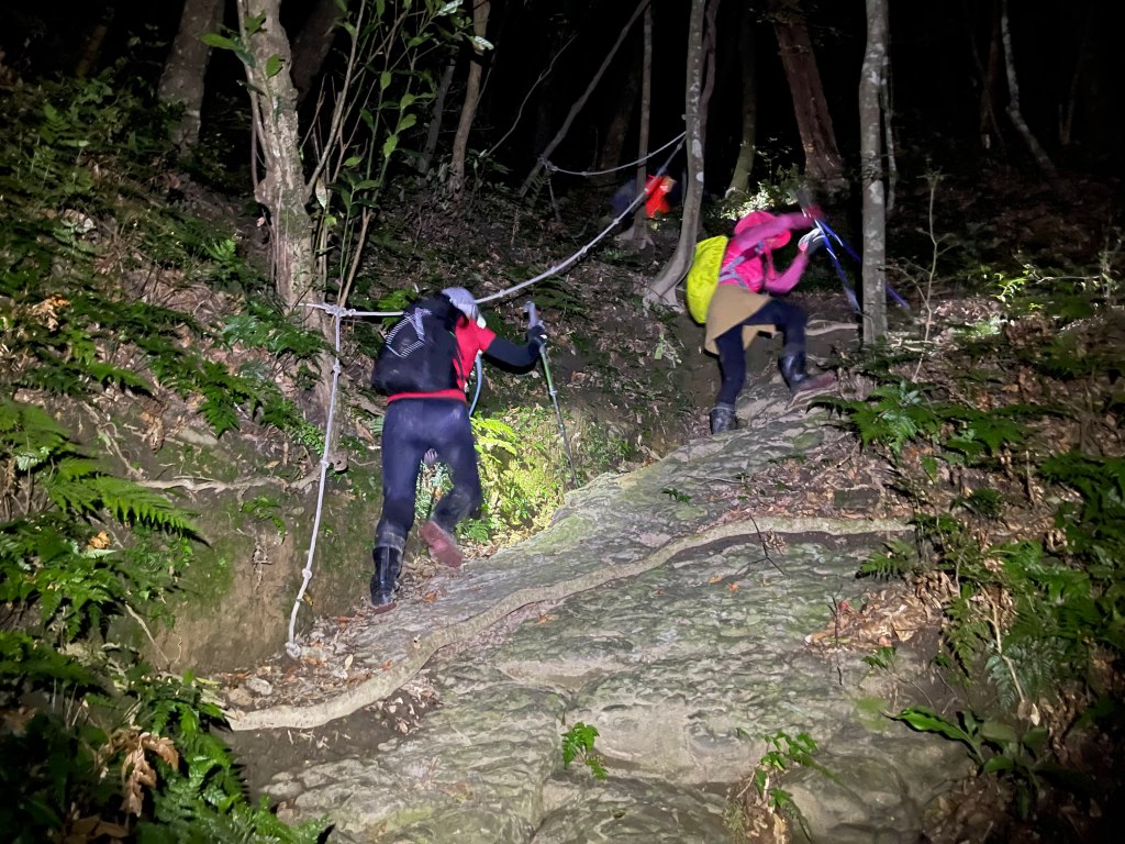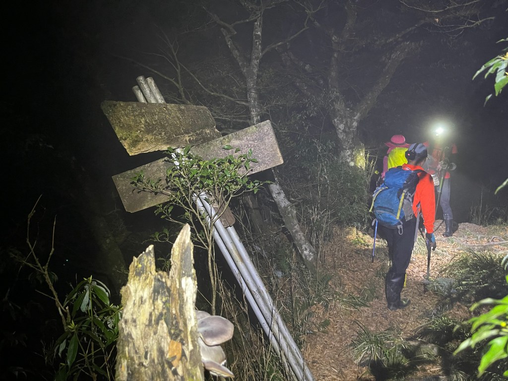 接著,在一起繼續往下到木屋遺址,接著要摸黑出第二登山口,也為了減緩妙妙的雙腿不適,此時一定要走水源地往赫威山方向,GPS上來看會稍微遠一些(3.2K+產道1K),但整段路徑幾乎平坦,我都稱這一條路線為高速公路,之前Steven、Smile與我,曾一起從這一條路線快走下山,約一個小時即可抵達停車場,不過今天我們走了兩小時多。也建議朋友們,如果到了木屋遺址已經摸黑,不要再走神木區回第一登山口,這一段距離雖然短了一些但是比較難走,萬一不小心走錯岔路往白紗瀑布方向,就會是一條難走的路!