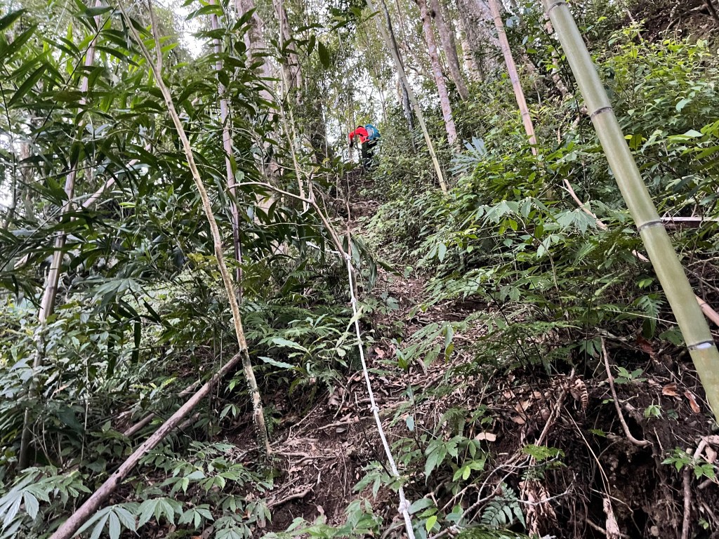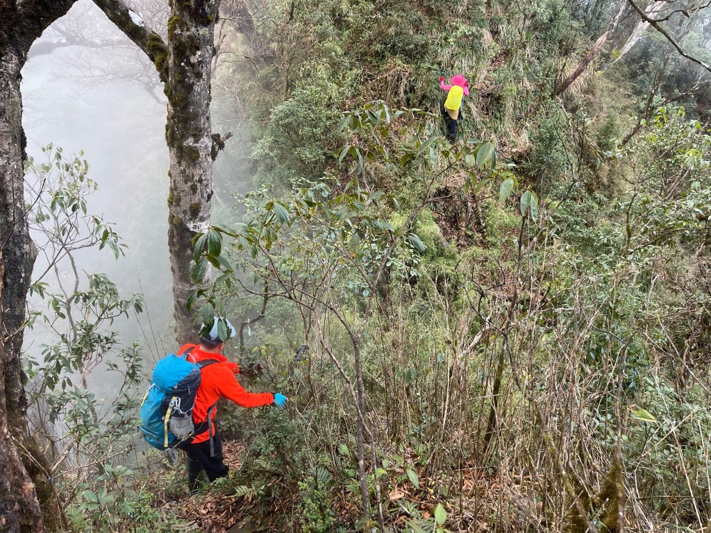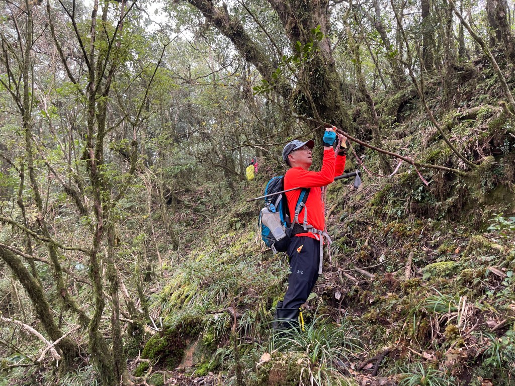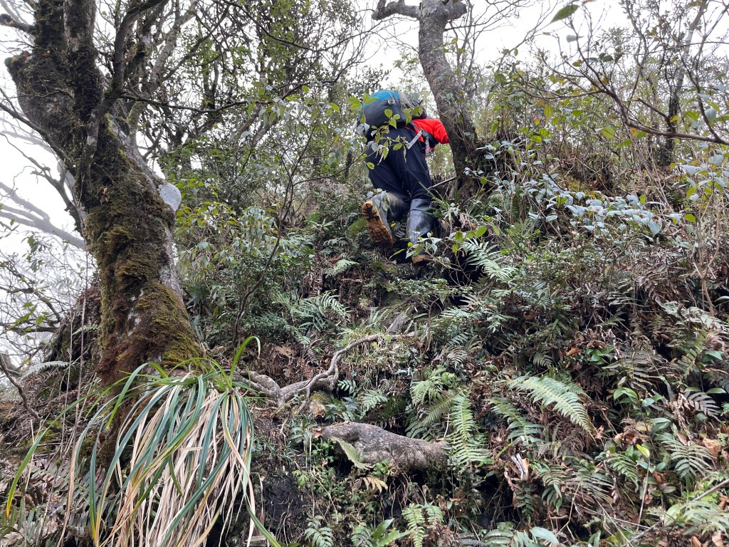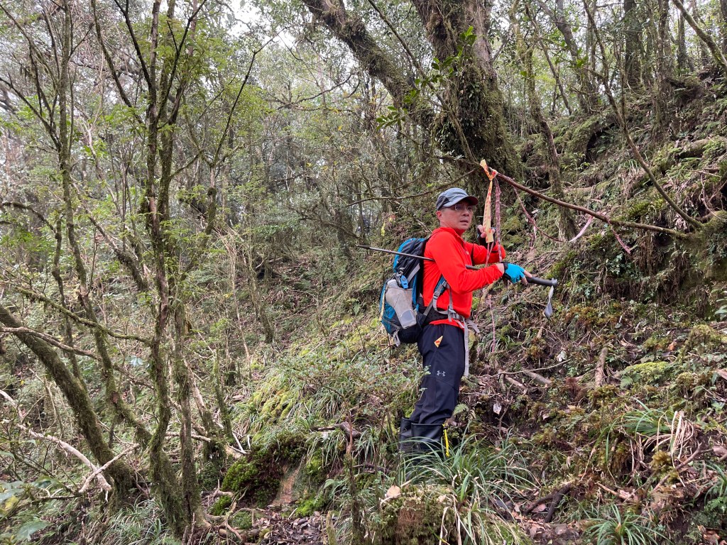 午餐後繼續前進,約往前30m,就看到保阿爾山的名牌了,這時距離離開魯培山已經用了兩小時,我自己心中盤算,如果接下來的路徑不要太差,也許再兩小時就可以接上北插(❓)。持續緩下來到鞍部,經過了一段兩邊都極陡峭的瘦稜,接著開始陡上往1689峰,從海拔1550m到1650m這一段,路徑轉為約70度的極陡型態,左側為無底型態的稜線,路徑極為潮濕且滑,沒有什麼踏點,整個人兩手兩腳幾乎都貼在斜坡上,再加上有三段幾乎垂直的岩壁,每段都差不多有5到10m的高度,繩索看起來都非常老舊,有一段甚至連繩索都沒有,連地上的細微樹根都要拿來支撐運用,是今天最危險的一段!也就是我在等高線圖所寫的「危崖攀爬區」。