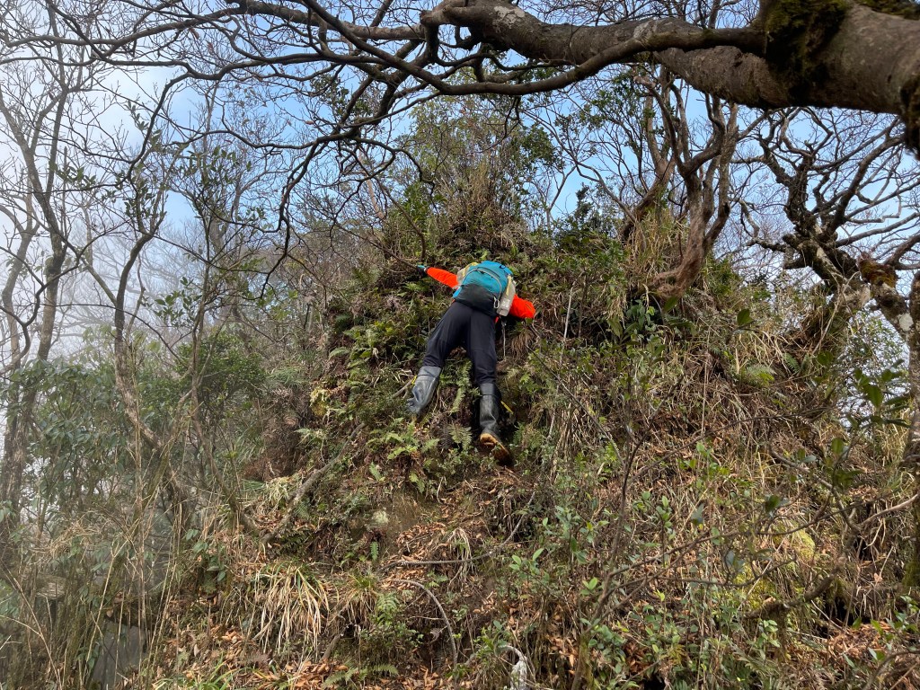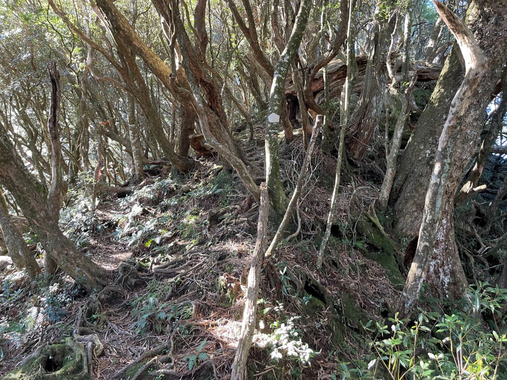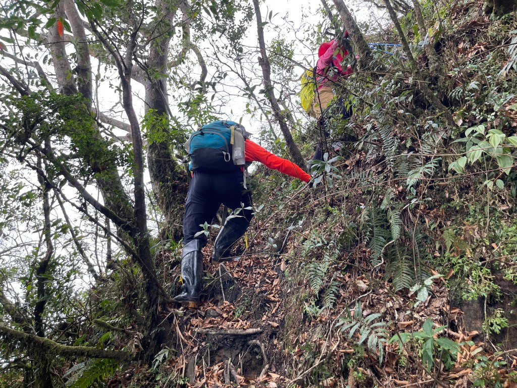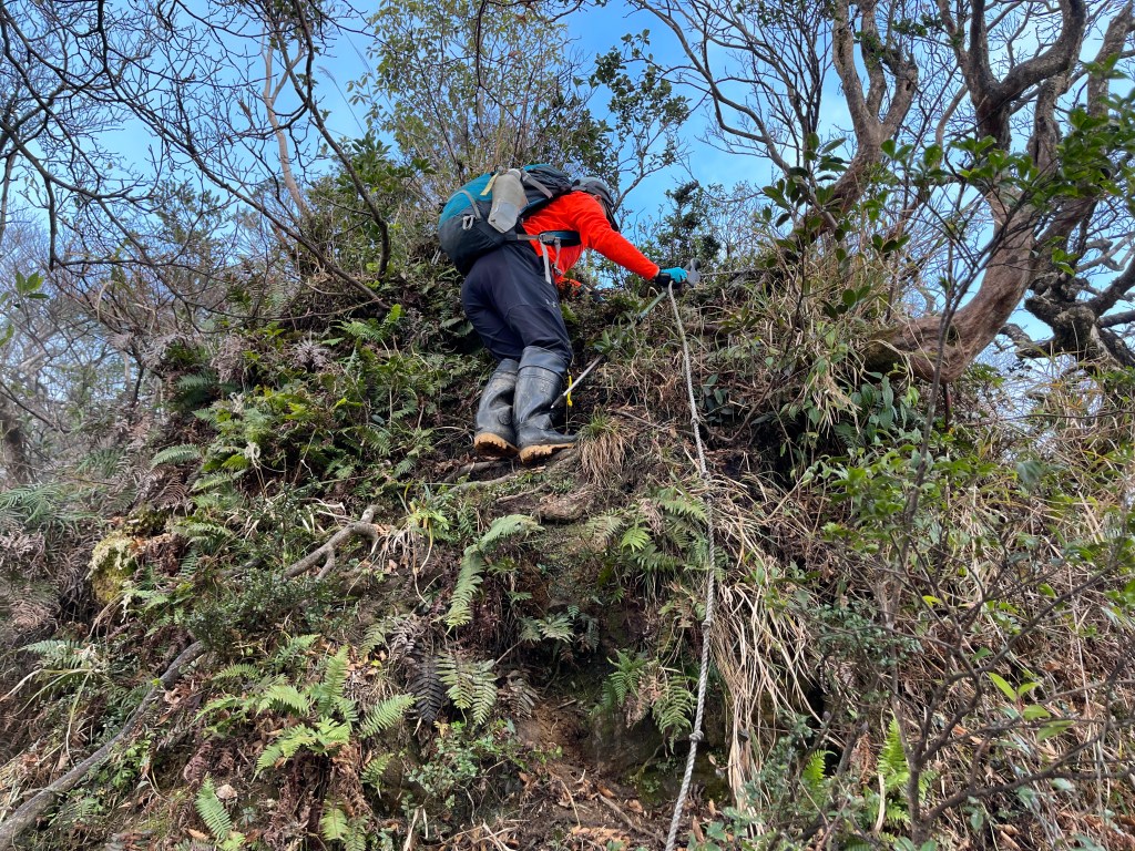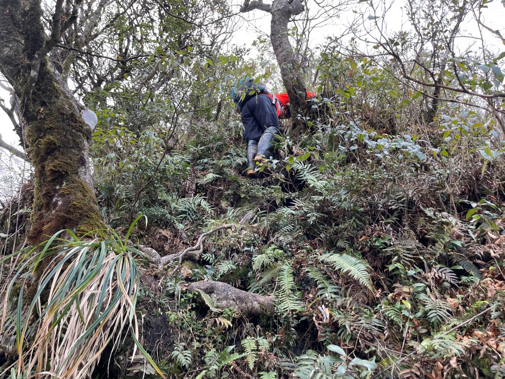 午餐後繼續前進,約往前30m,就看到保阿爾山的名牌了,這時距離離開魯培山已經用了兩小時,我自己心中盤算,如果接下來的路徑不要太差,也許再兩小時就可以接上北插(❓)。持續緩下來到鞍部,經過了一段兩邊都極陡峭的瘦稜,接著開始陡上往1689峰,從海拔1550m到1650m這一段,路徑轉為約70度的極陡型態,左側為無底型態的稜線,路徑極為潮濕且滑,沒有什麼踏點,整個人兩手兩腳幾乎都貼在斜坡上,再加上有三段幾乎垂直的岩壁,每段都差不多有5到10m的高度,繩索看起來都非常老舊,有一段甚至連繩索都沒有,連地上的細微樹根都要拿來支撐運用,是今天最危險的一段!也就是我在等高線圖所寫的「危崖攀爬區」。