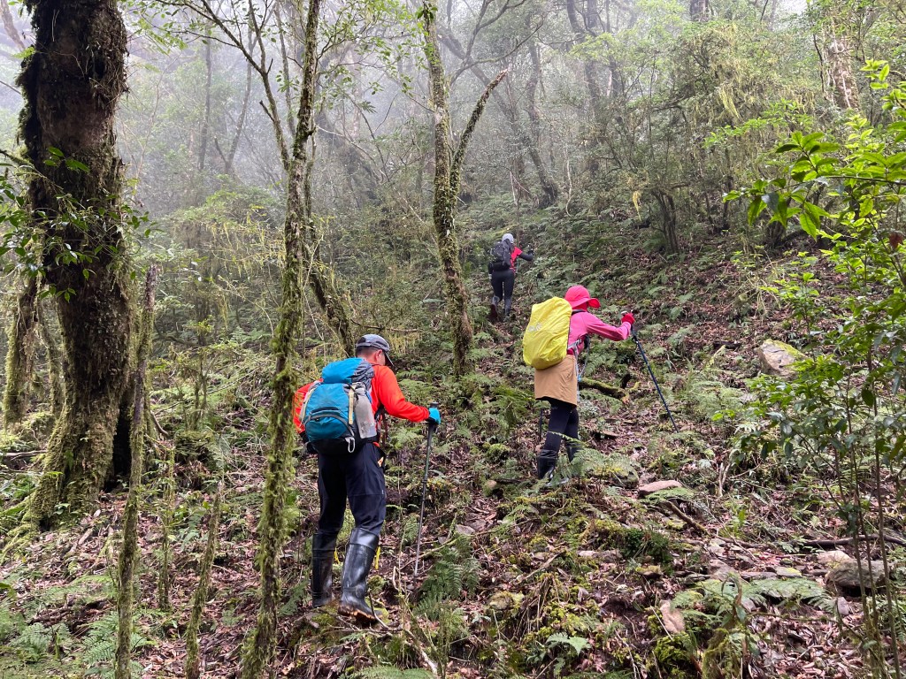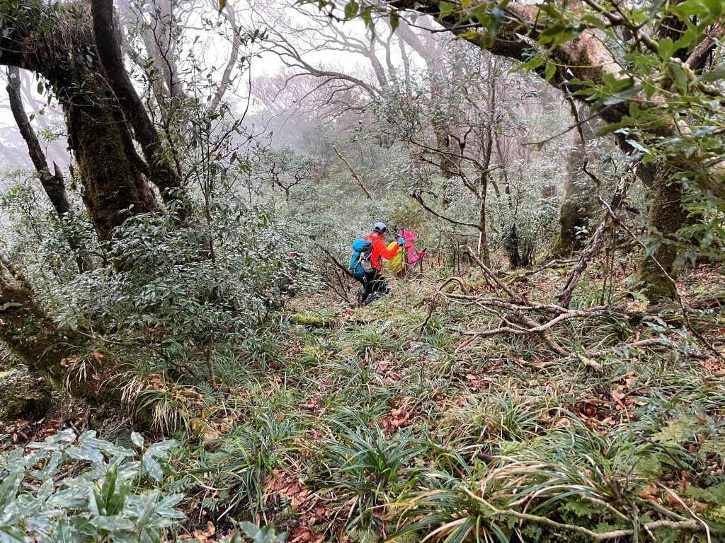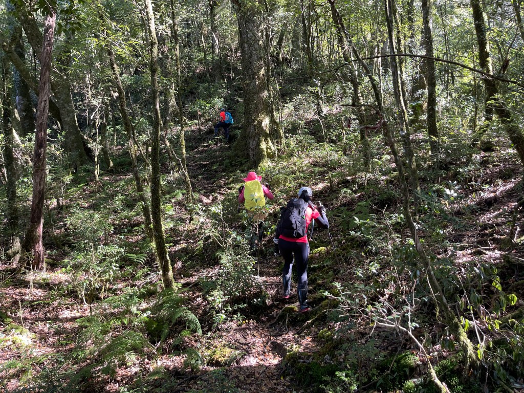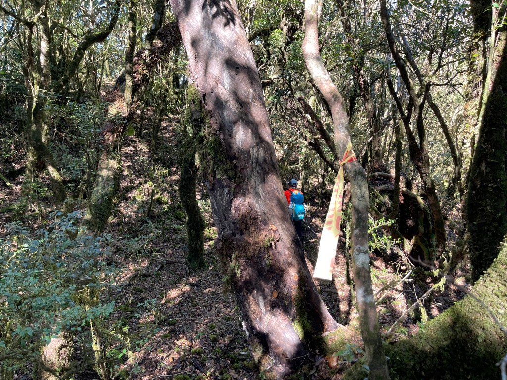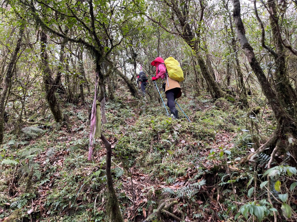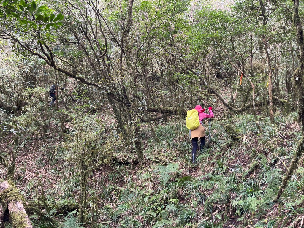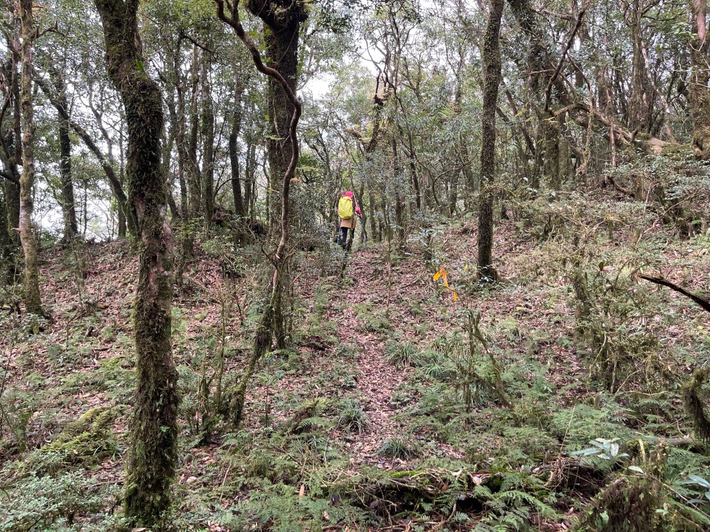 由南插往北插的過程,會先持續陡下到H1750m的魯培鞍部,再陡上至H1905m的魯培山,由魯培山往北插方向走,一開始就是一路沿著稜線陡下,(南北插就是一直走在稜線上就對),路徑潮溼林相原始而山毛櫸突然暴多,像刺藤的灌木叢也多到不遑多讓,但登山布條極稀少且都已風化,路徑不明,但因為都在稜線上,只要方向正確,還是可以偶爾看到布條。此刻直接進入魔幻森林青苔滿佈的路徑,此時狀況不錯的采庭一直在前頭帶路,但也不時可以看到她一直對著GPS的路徑,就可以想像今天的路徑多麼不明確,我在後面不時看著妙妙的狀態,也一直催促綁布條還要攝影的Smile。