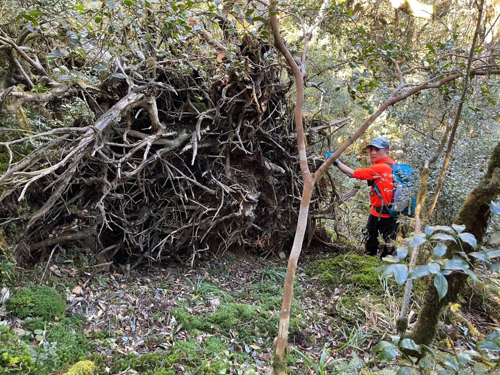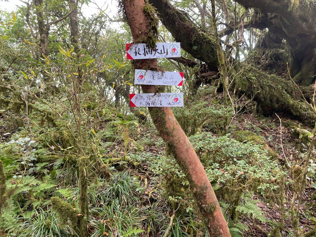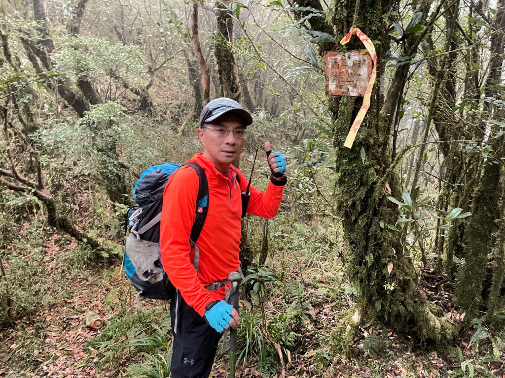 上圖:離開1689峰。因為1689峰的名牌樹幹已經斷掉,我們在此樹幹上綁了一條布條,提醒朋友們已經抵達。
