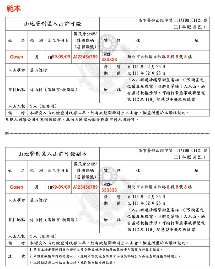 要走庫哈諾辛山,要先向「台灣國家公園入園入山線上申請服務網」進入申請,並且要向「內政部警政署入山案件申請系統」申請入山證。只要朋友們提早申請入園證,在許可後即可在列印入園證的網頁上直接按入申請入山證,這樣會省事很多。許可後即可印出入園證及入山證。範本如下: