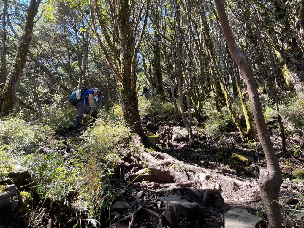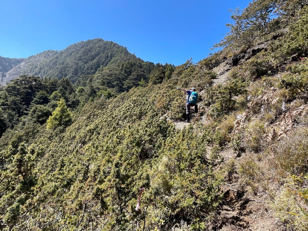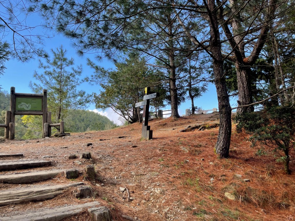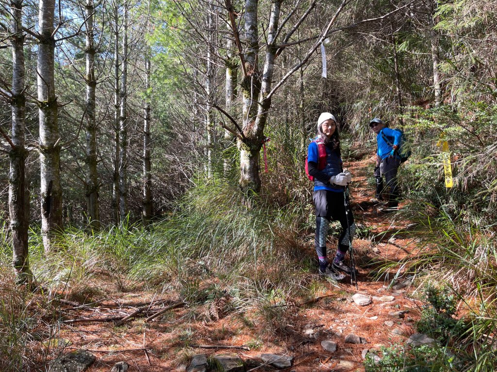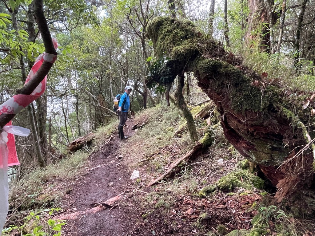 (2)上到稜線有一段碎石坡路,約200公尺的長度是曝曬,通過後會再度進入森林裡,此時就會出現一個岔路,往右上會往中之關步道方向,往左下就是往庫哈諾辛山,一定要特別注意這個叉路口,今天我就看到有兩組人馬走錯!