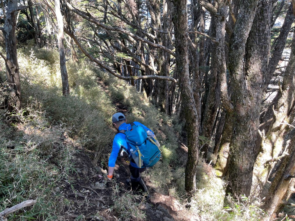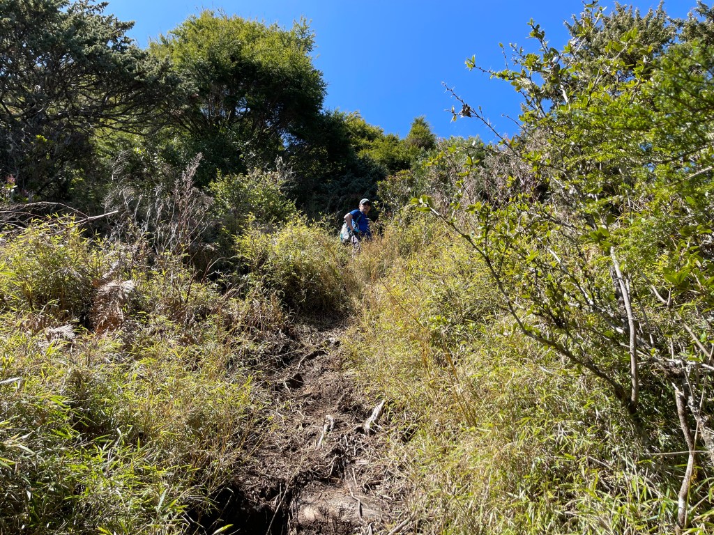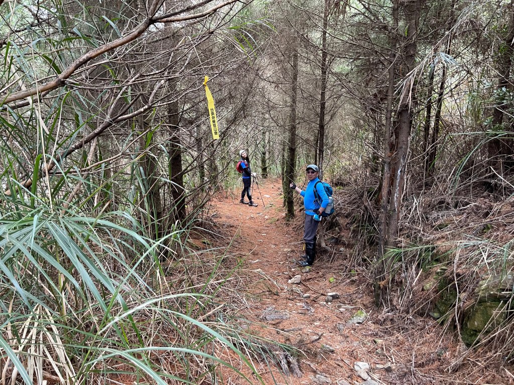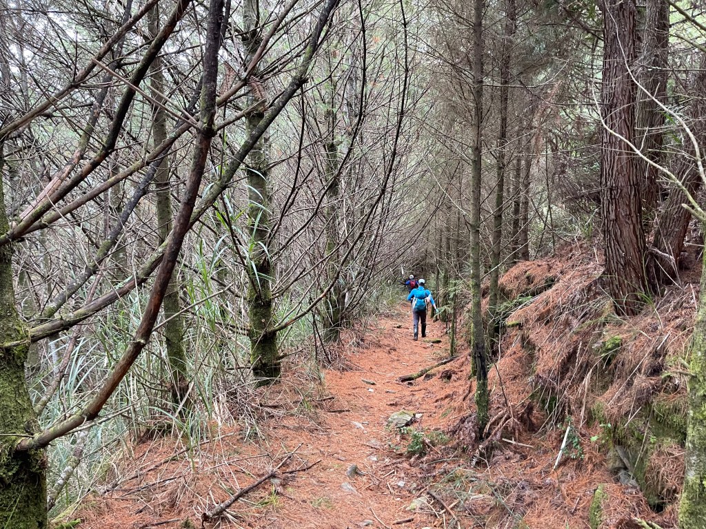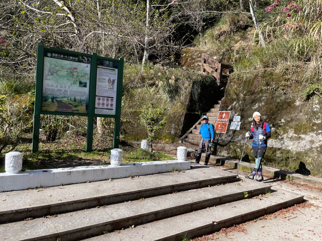 (2)上到稜線有一段碎石坡路,約200公尺的長度是曝曬,通過後會再度進入森林裡,此時就會出現一個岔路,往右上會往中之關步道方向,往左下就是往庫哈諾辛山,一定要特別注意這個叉路口,今天我就看到有兩組人馬走錯!