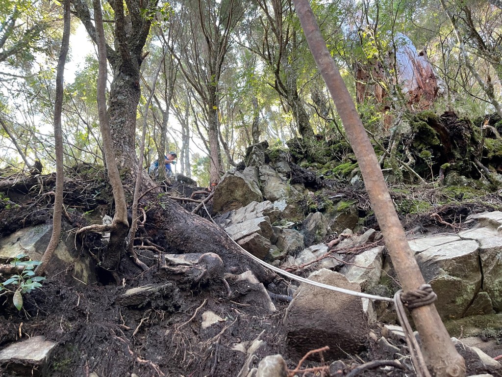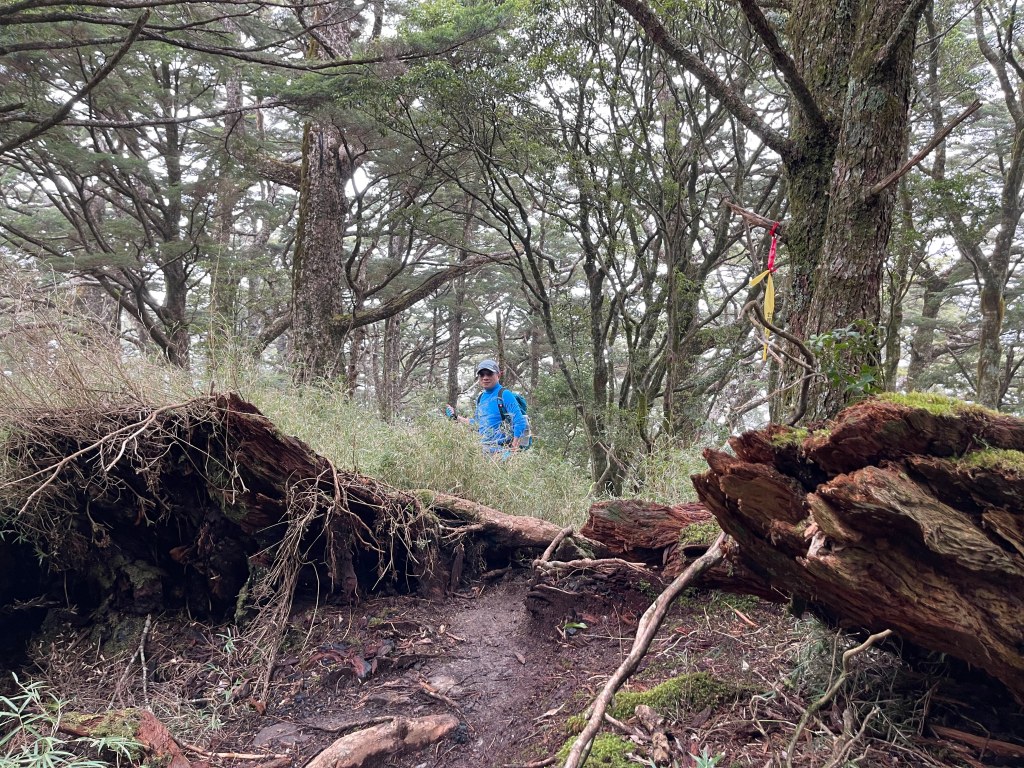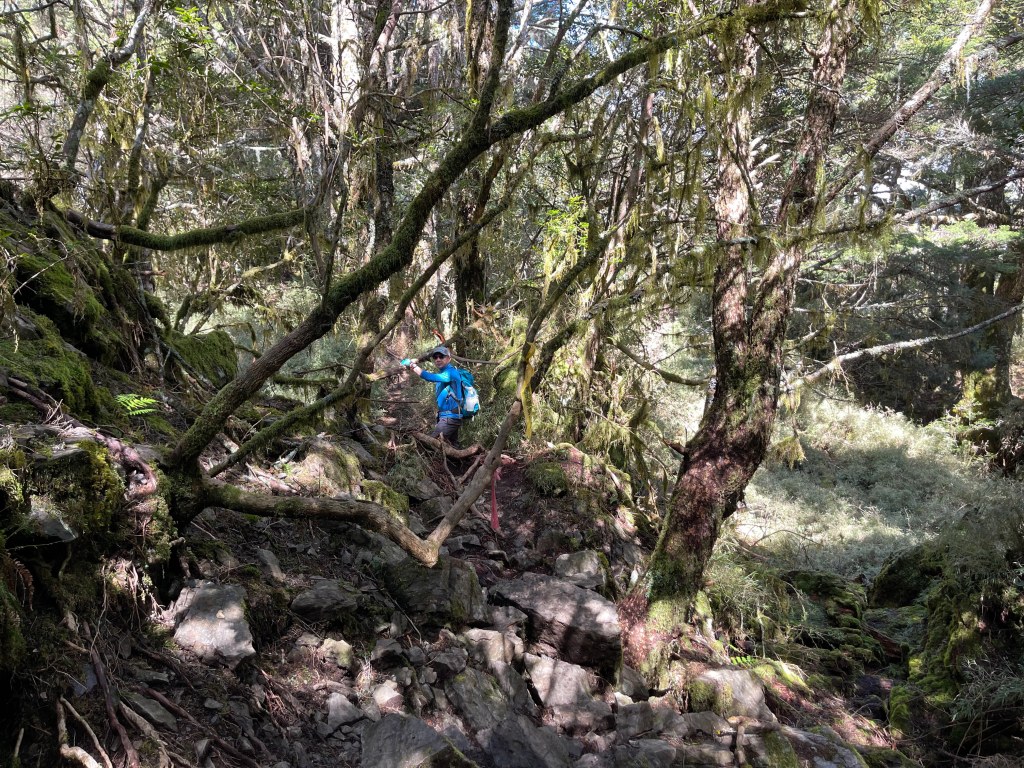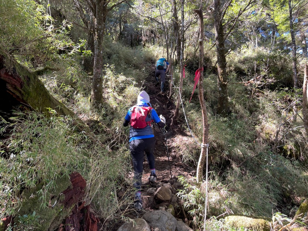 從梅山管制站開進去到天池或者長青祠,還需要25K的距離,開車約需要40分鐘,所以一般大概都是將近早上9點才能起登,單趟大約3.3K,來回約6.6K的距離。整個路徑大都是樹根+岩壁路的型態,需要手腳併用,如果朋友們經常爬中級山,大概就能體會是哪一種路徑了。整個過程,有兩個點要特別注意!