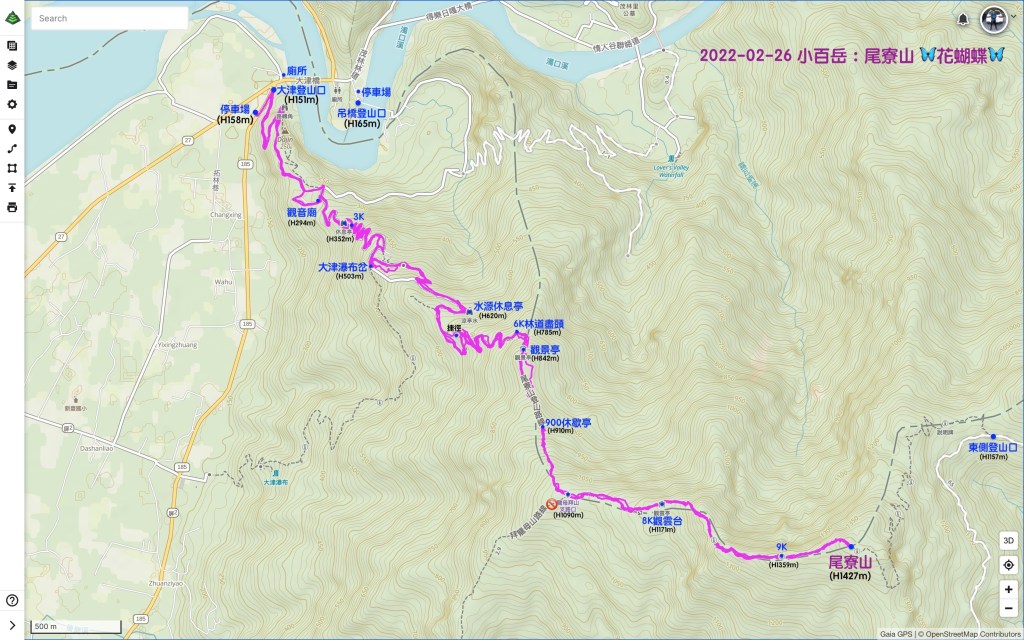 今天的路線是,由大津登山口 (H151m),沿著林道走到6K林道盡頭 (H785m),抵達尾寮山(H1427m,小百岳#073),下山時沿著原路而回,經過6K林道盡頭 (H785m)而回到大津登山口 (H151m)。