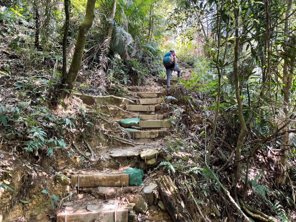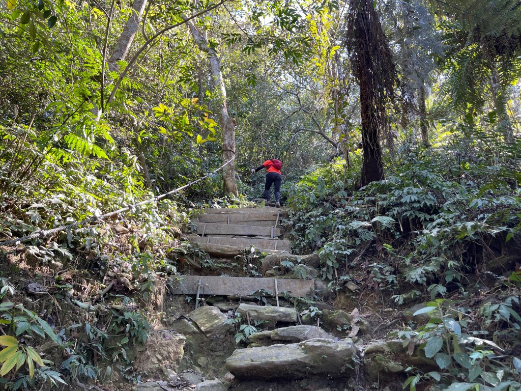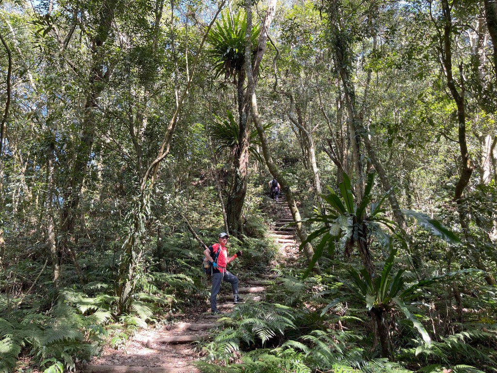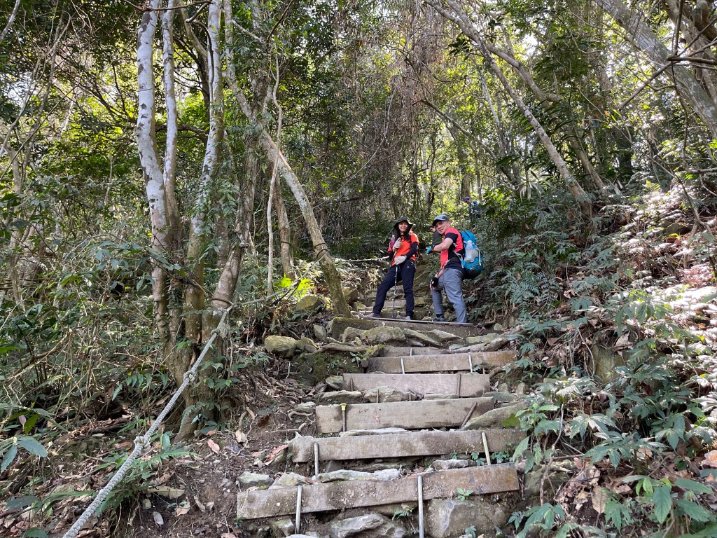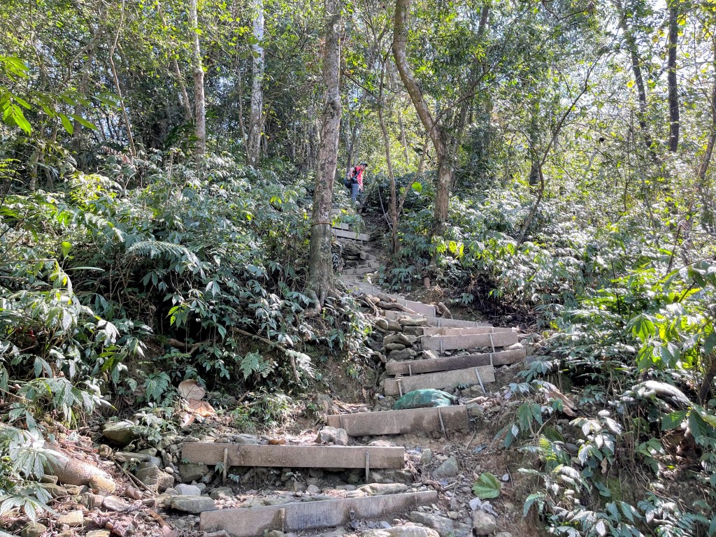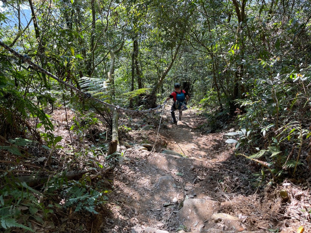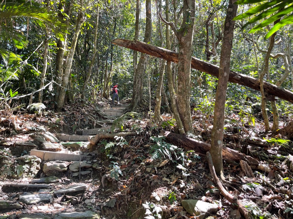 再接上一段極陡峭的階梯路,再來就又是一段平坦的山徑,一直到9.3K尾寮山前,有四段這樣的過程,有點像是梯田的形狀,如果要說這樣的路徑硬不硬?還蠻硬的!但如果要跟前一天爬庫哈諾辛山來比,這算得上是比較親民了!