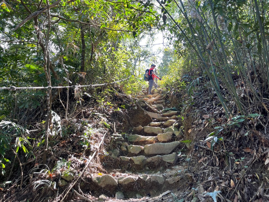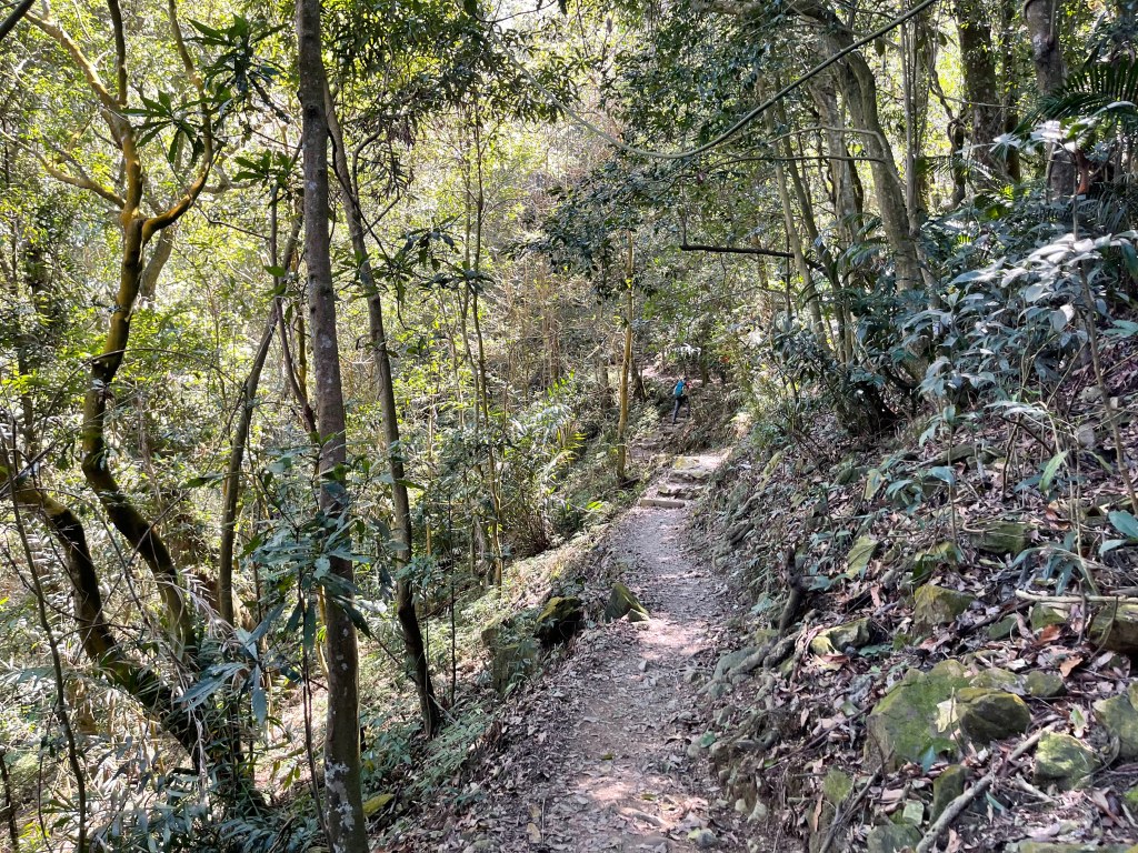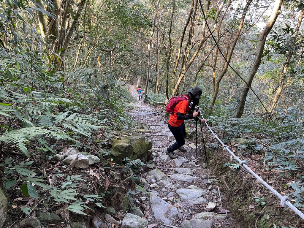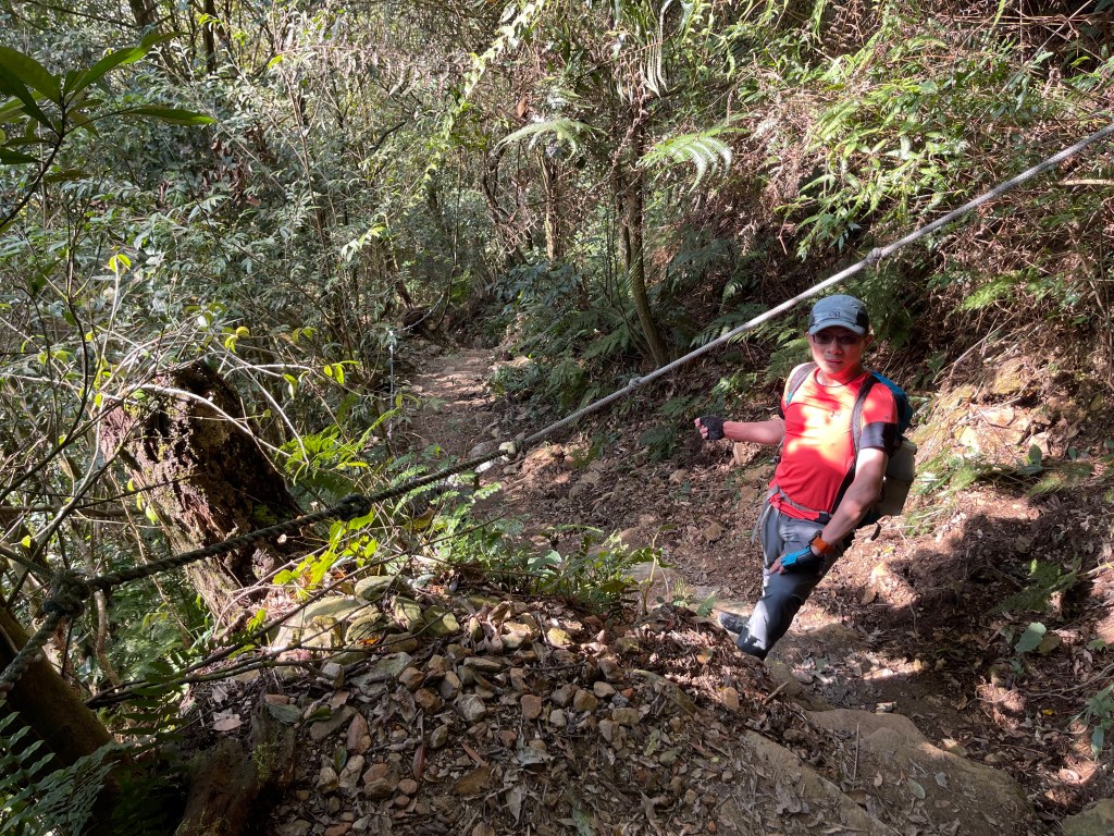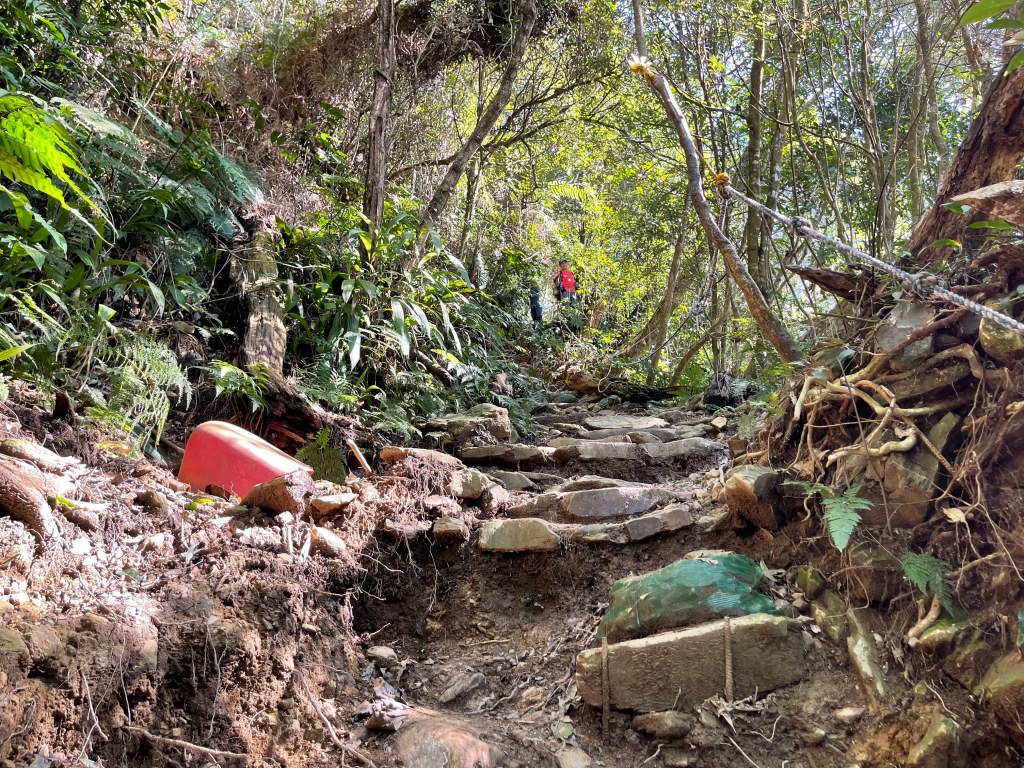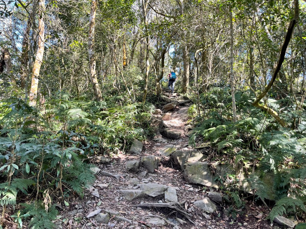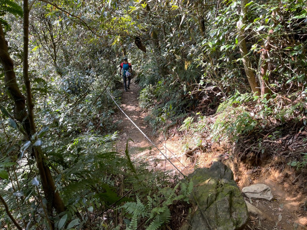 再接上一段極陡峭的階梯路,再來就又是一段平坦的山徑,一直到9.3K尾寮山前,有四段這樣的過程,有點像是梯田的形狀,如果要說這樣的路徑硬不硬?還蠻硬的!但如果要跟前一天爬庫哈諾辛山來比,這算得上是比較親民了!