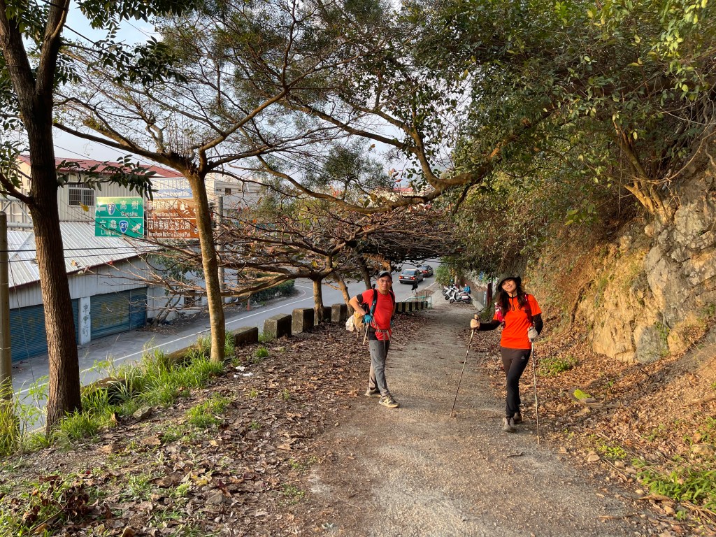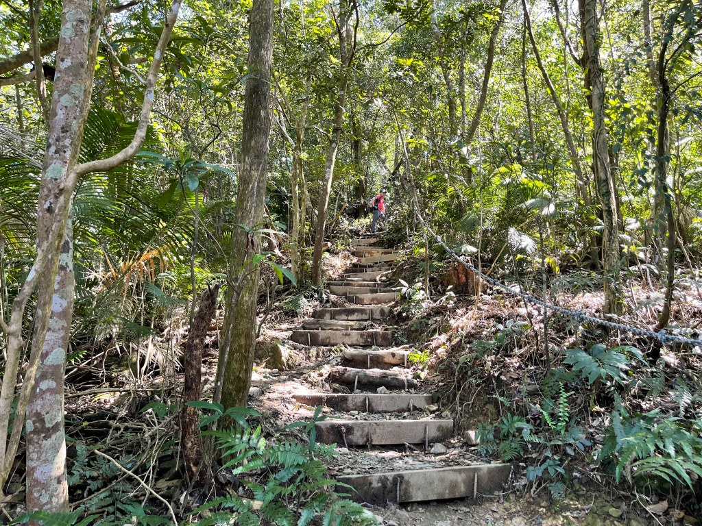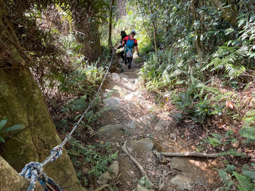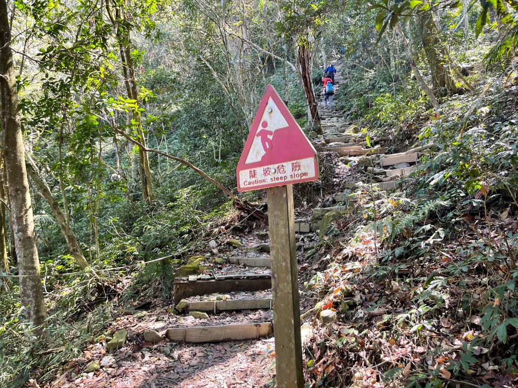 從6K尾寮山登山口起,一開始就是沿著階梯陡上,直接陡上快70公尺的高度抵達觀景亭,接著就是一段平坦的山徑,