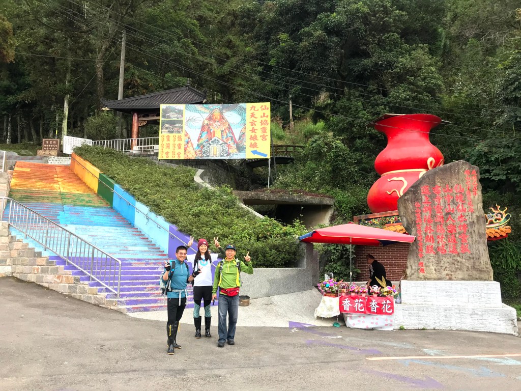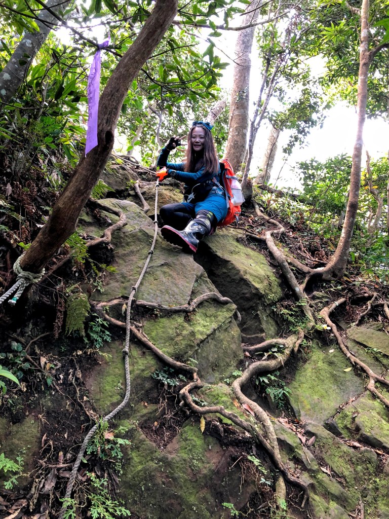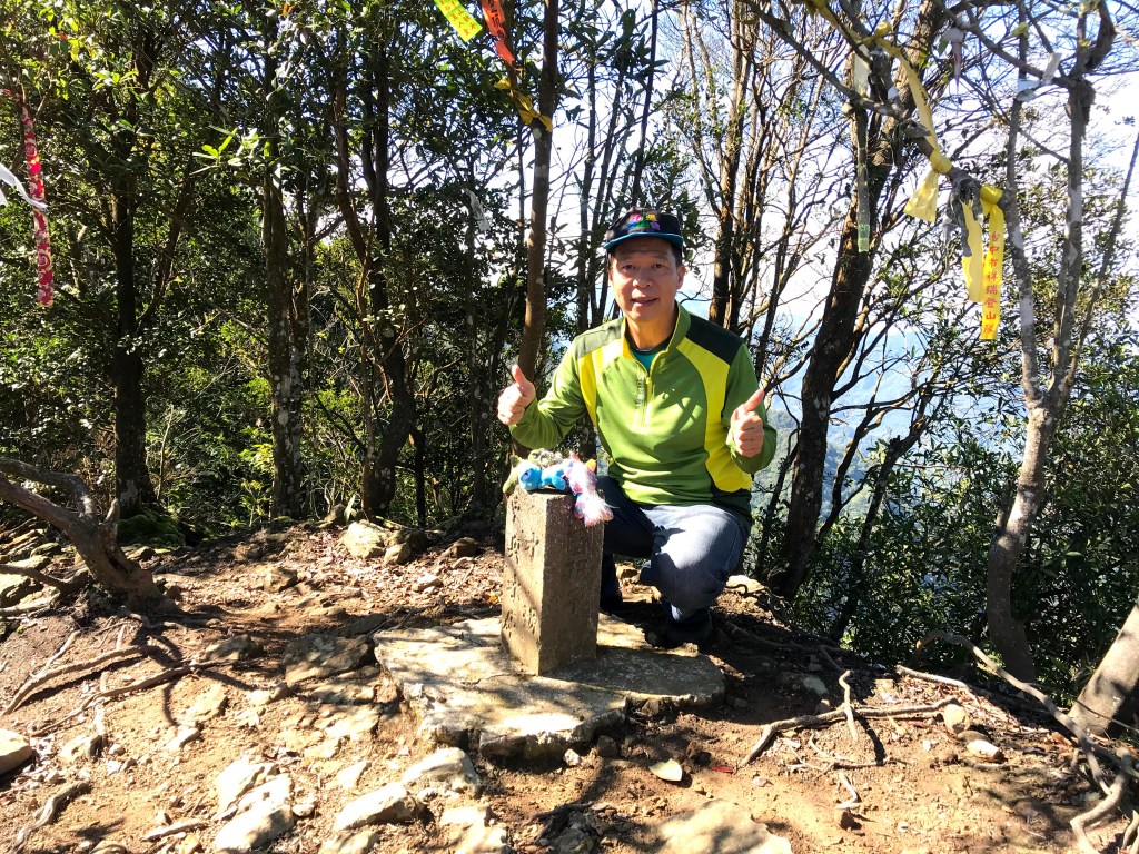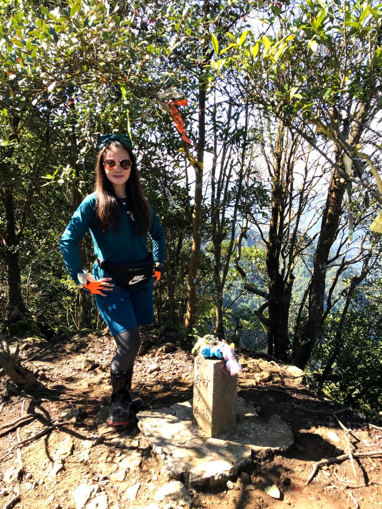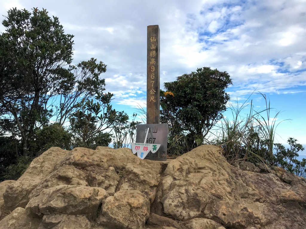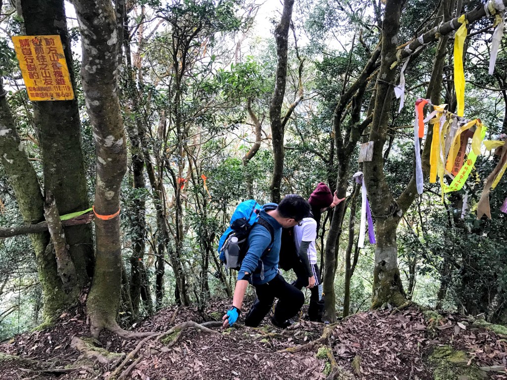 今天也是楊咩咩第一次跟我們一起爬山,由於Peter的速度不慢,因此一路上要楊咩咩跟著Peter後面走,而我(Gosen)則一路在後面陪著拍攝的Smile。由靈洞宮開始到仙山需要0.8K,先逐漸走階梯陡上先經過玄靈宮(九天玄女廟),上稜線後再經過望陽亭即開始拉繩陡上,這一段的陡上極為陡峭且兩邊都是斷崖,是需要非常小心的一段。抵達仙山,這是今天整個行程中海拔最高的位置,沒有三角點,只有一個仙山的立牌。