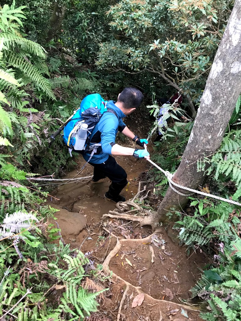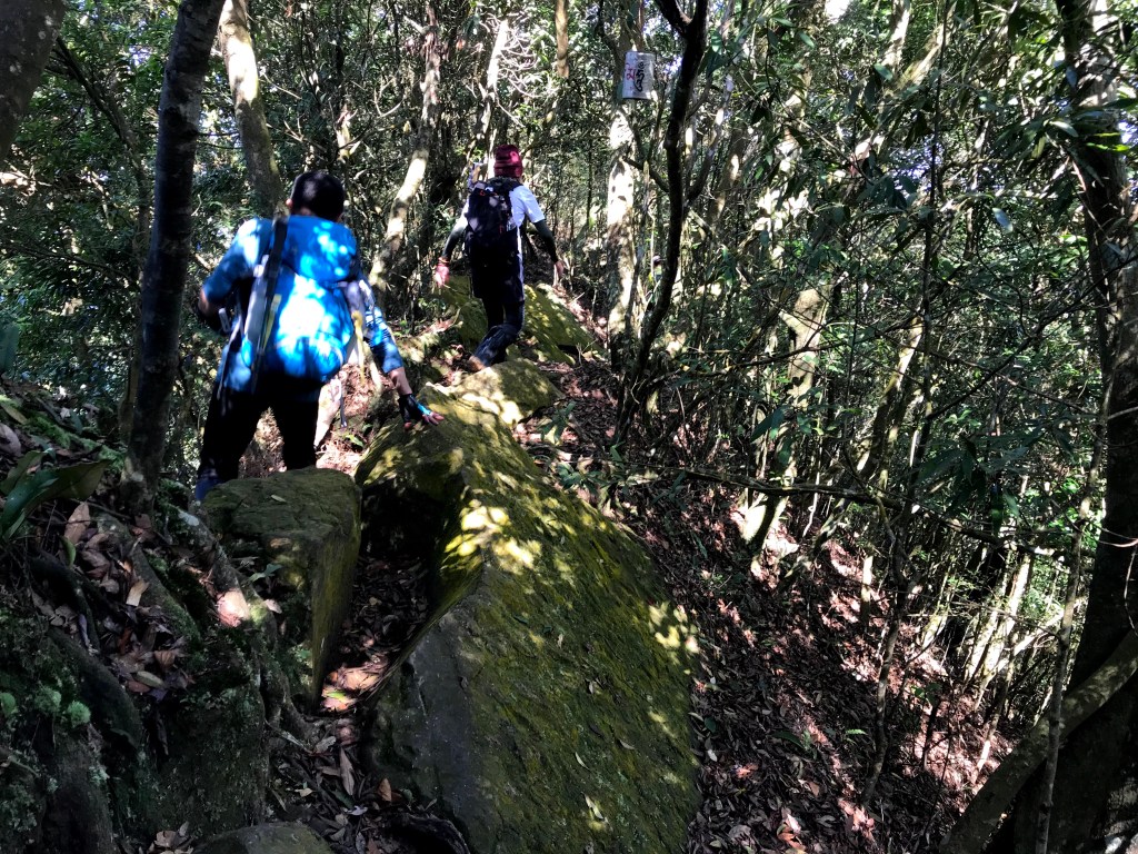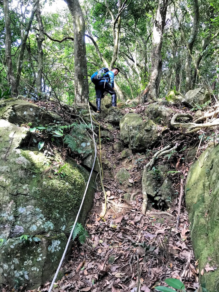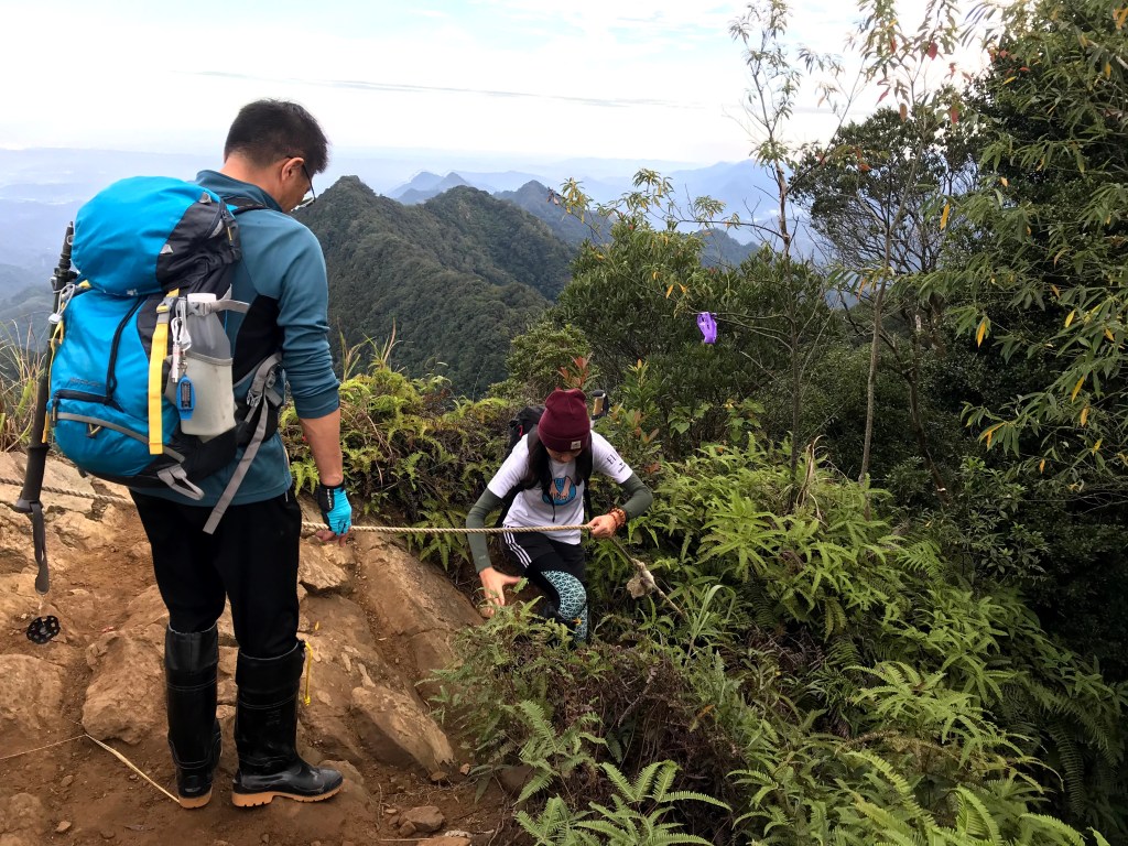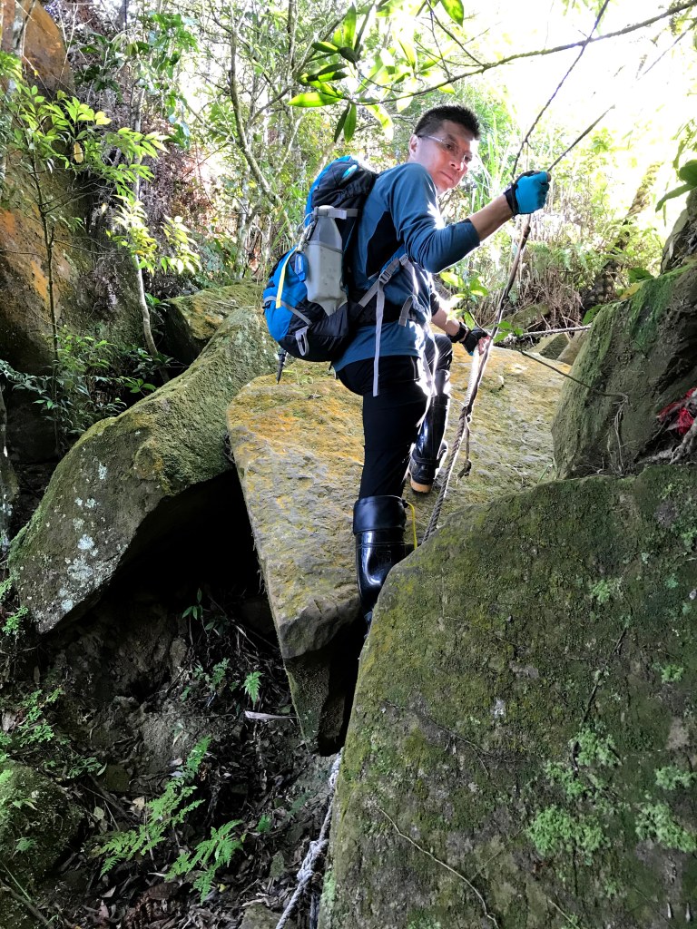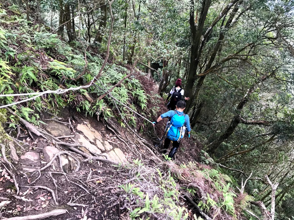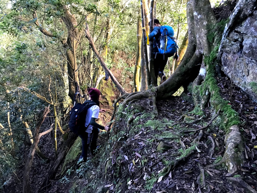 略微休息一下後,開始往福南山走,由仙山到福南山這一段的距離有2.3K,也是今天整天路徑中最原始的一段,一開始就是一路陡下,幾乎都是走在瘦稜上,沿路的路徑上有很多附著苔蘚的岩石,要經過三個假山頭,陡上陡下的角度都很大,但都有繩索輔助,部份的瘦稜邊坡是斷崖型態,行走時要特別小心!中途會經過一處岩壁展望點,而在接近到達福南山前,會出現一處極為陡深的岩壁,經過後即可抵達福南山。